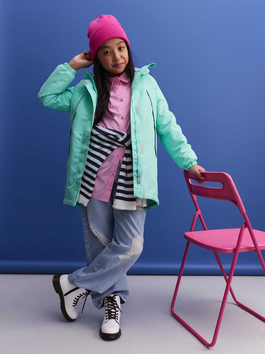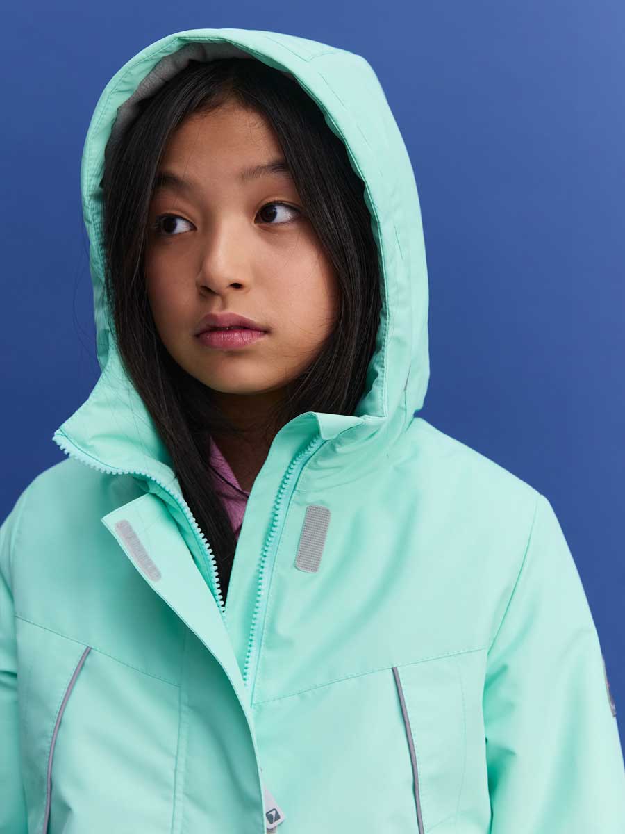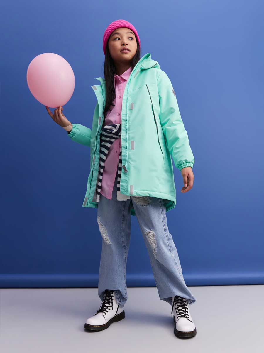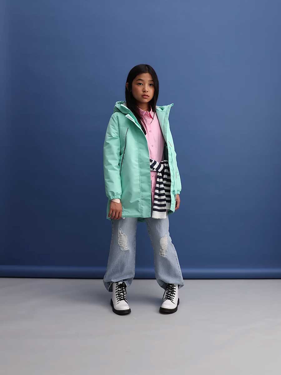 Удлиненная, демисезонная куртка для девочки из мембранной ткани, немного расклешённая книзу. Куртка с втачным капюшоном и кулисой с резиной по талии спинки. Центральная застёжка на молнию, закрытую центральной планкой на липучках. По низу куртки резиновый шнур. 2 прорезных кармана спереди. Низ рукава на резинке. Внутренний капюшон из флиса. Капюшон с резиновым шнуром и фиксаторами по краю, и с хлястиком на липучке сзади. На куртке расположены светоотражающие элементы. Рассчитана на температуру от -5 до +10.