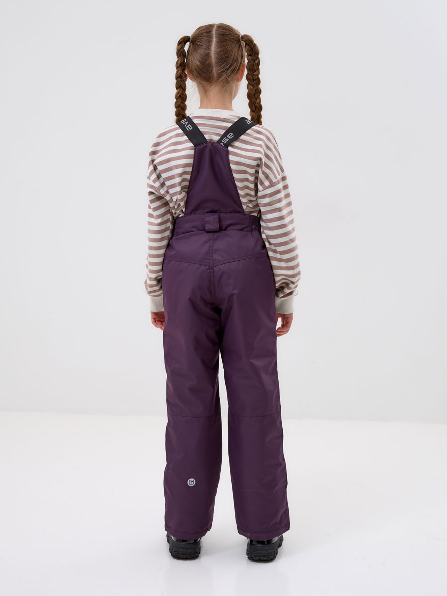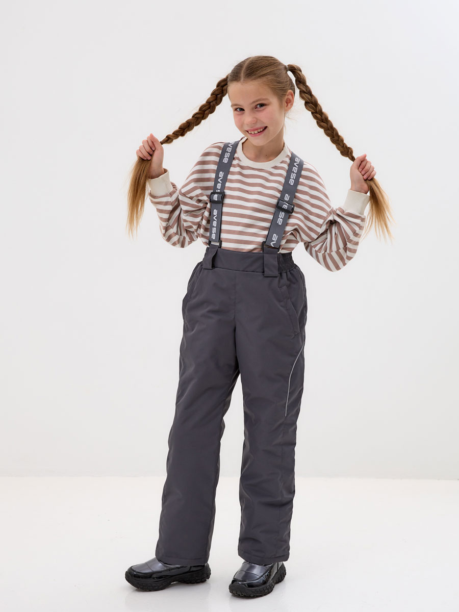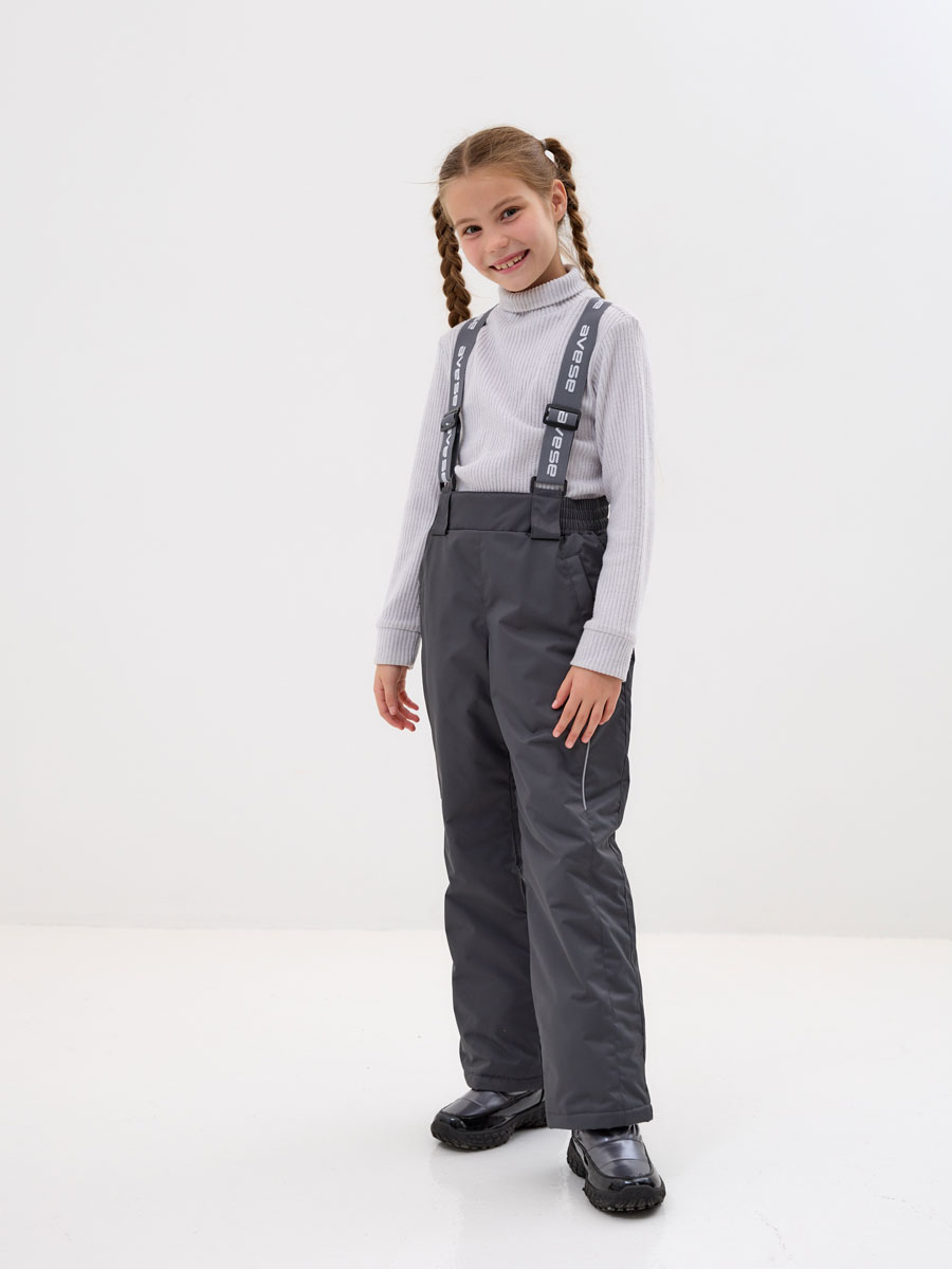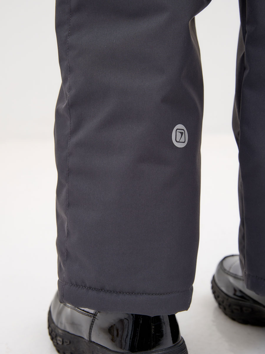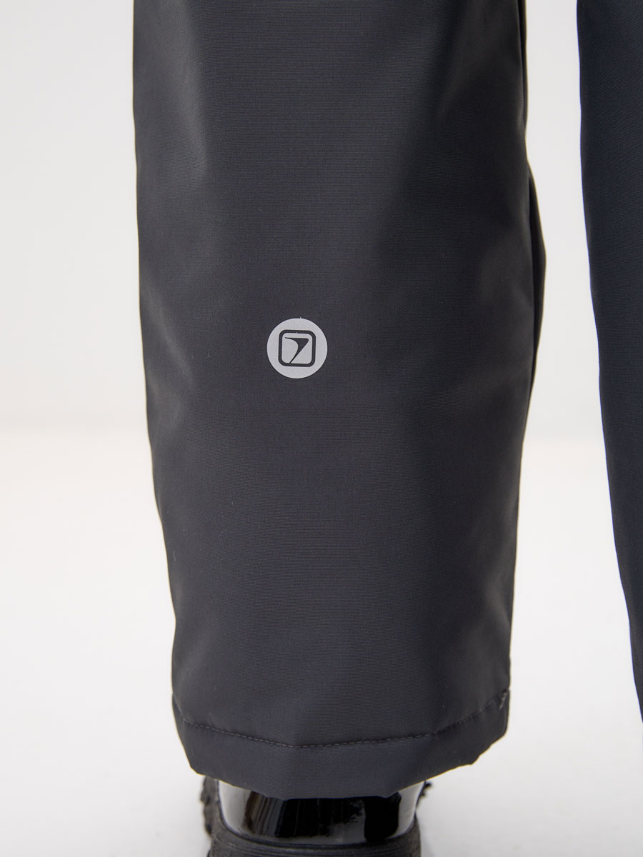 Брюки с отстегивающимися бретелями и спинкой. 2 прорезных кармана с листочками. Подкладка настегана на утеплитель. Пояс отрезной. Низ брюк прямой, с внутренней снегозащитной муфтой на стопорной резине. В костюме использованы светоотражающие элементы.