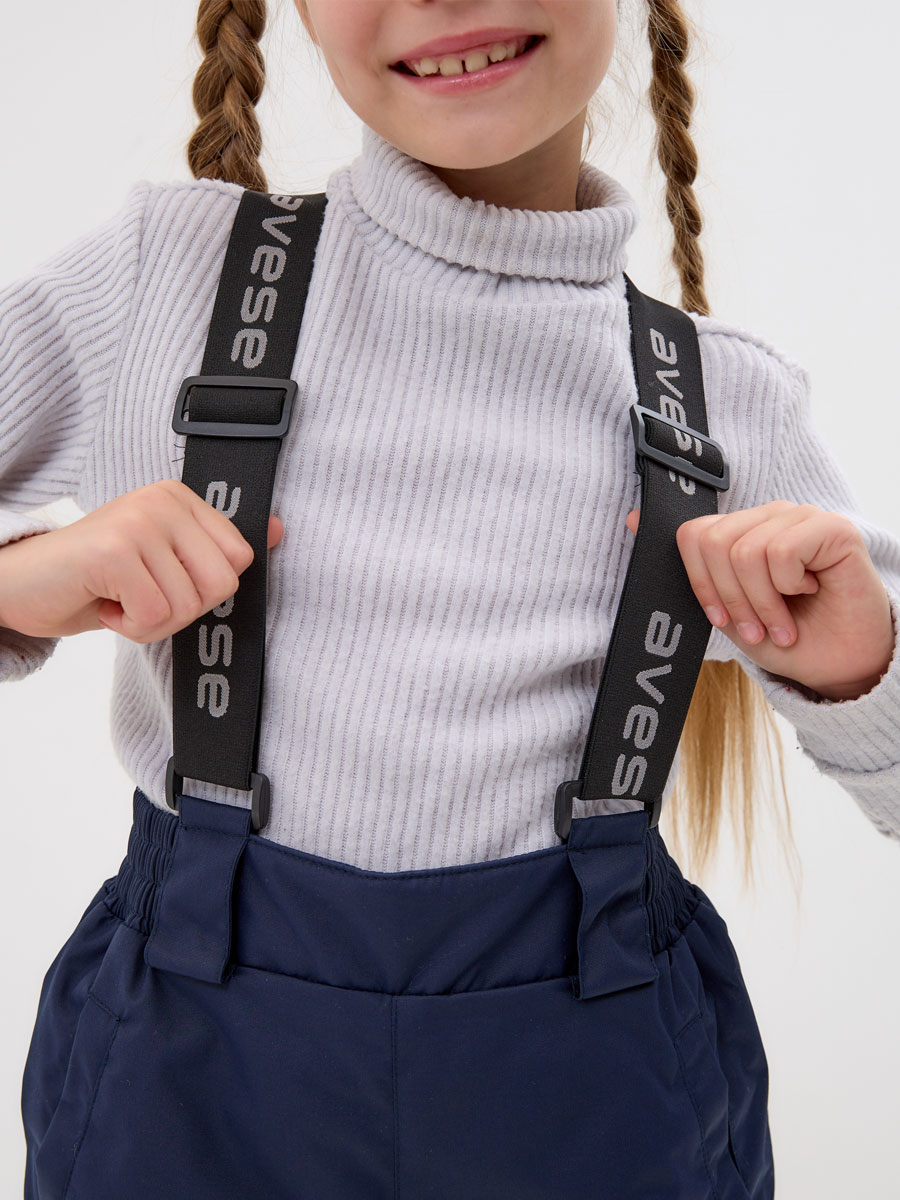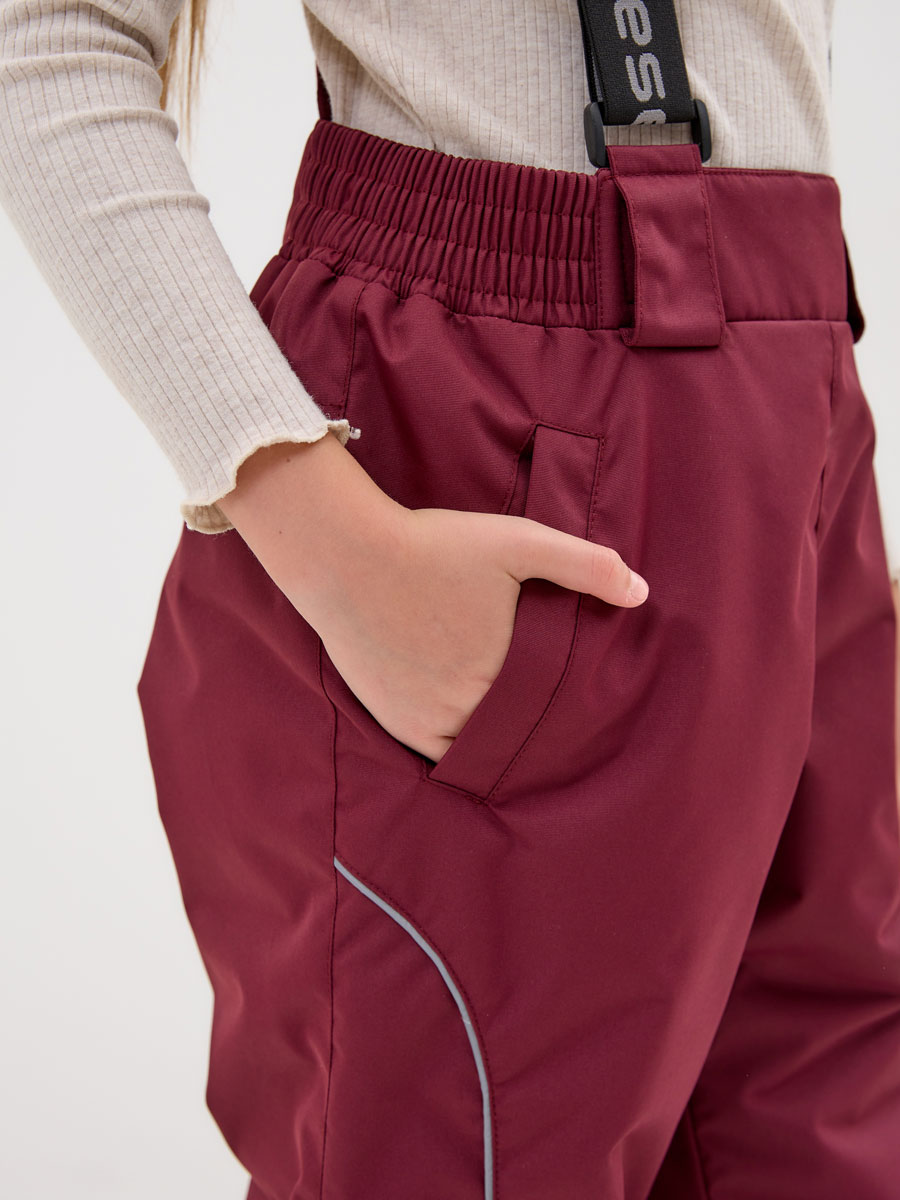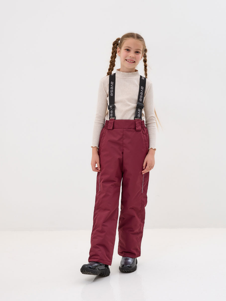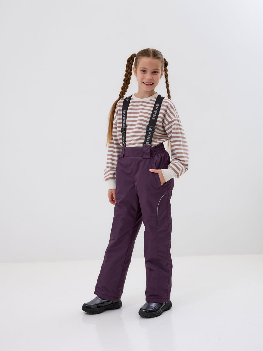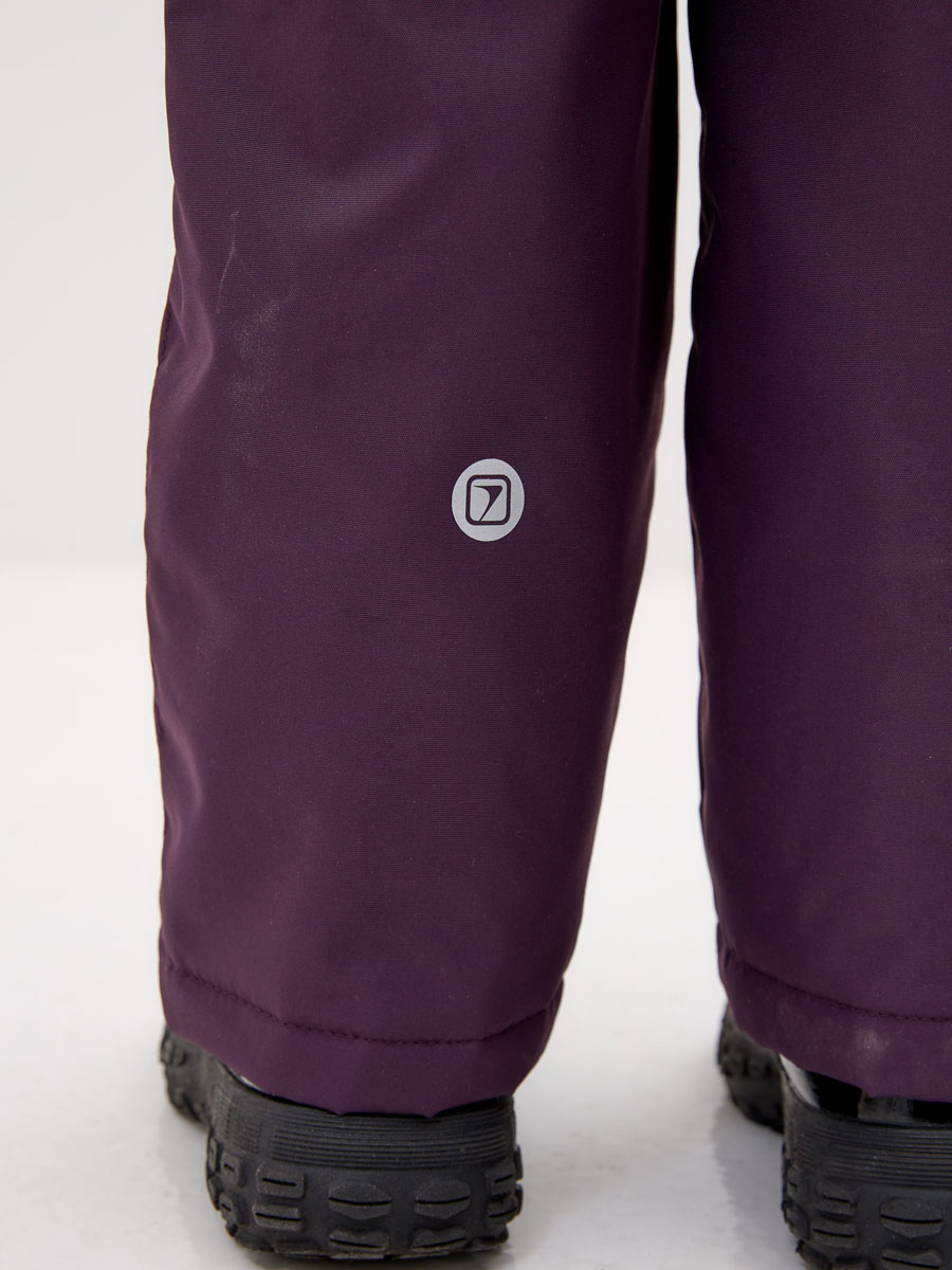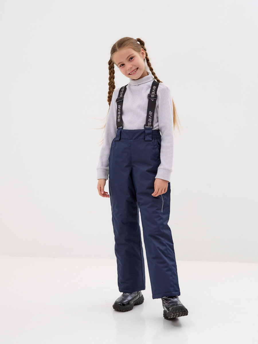 Брюки с отстегивающимися бретелями и спинкой. 2 прорезных кармана с листочками. Подкладка настегана на утеплитель. Пояс отрезной. Низ брюк прямой, с внутренней снегозащитной муфтой на стопорной резине. В костюме использованы светоотражающие элементы.