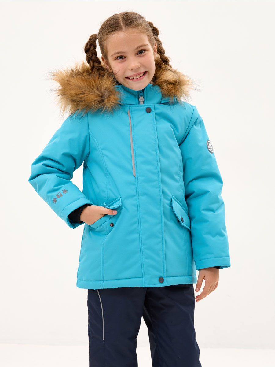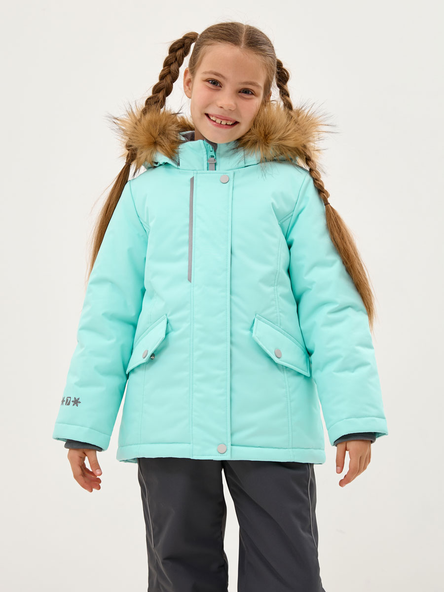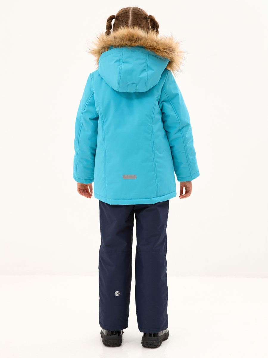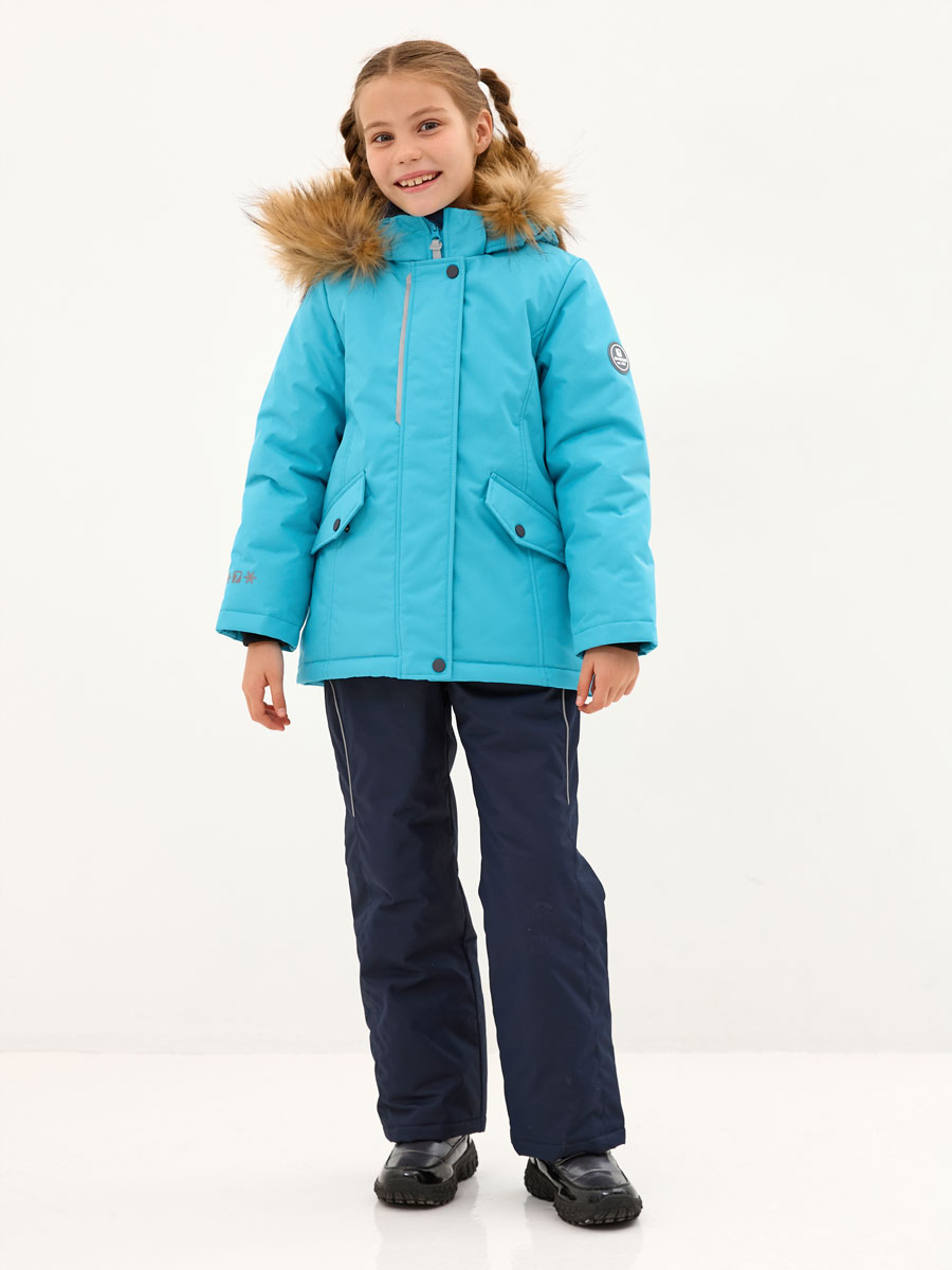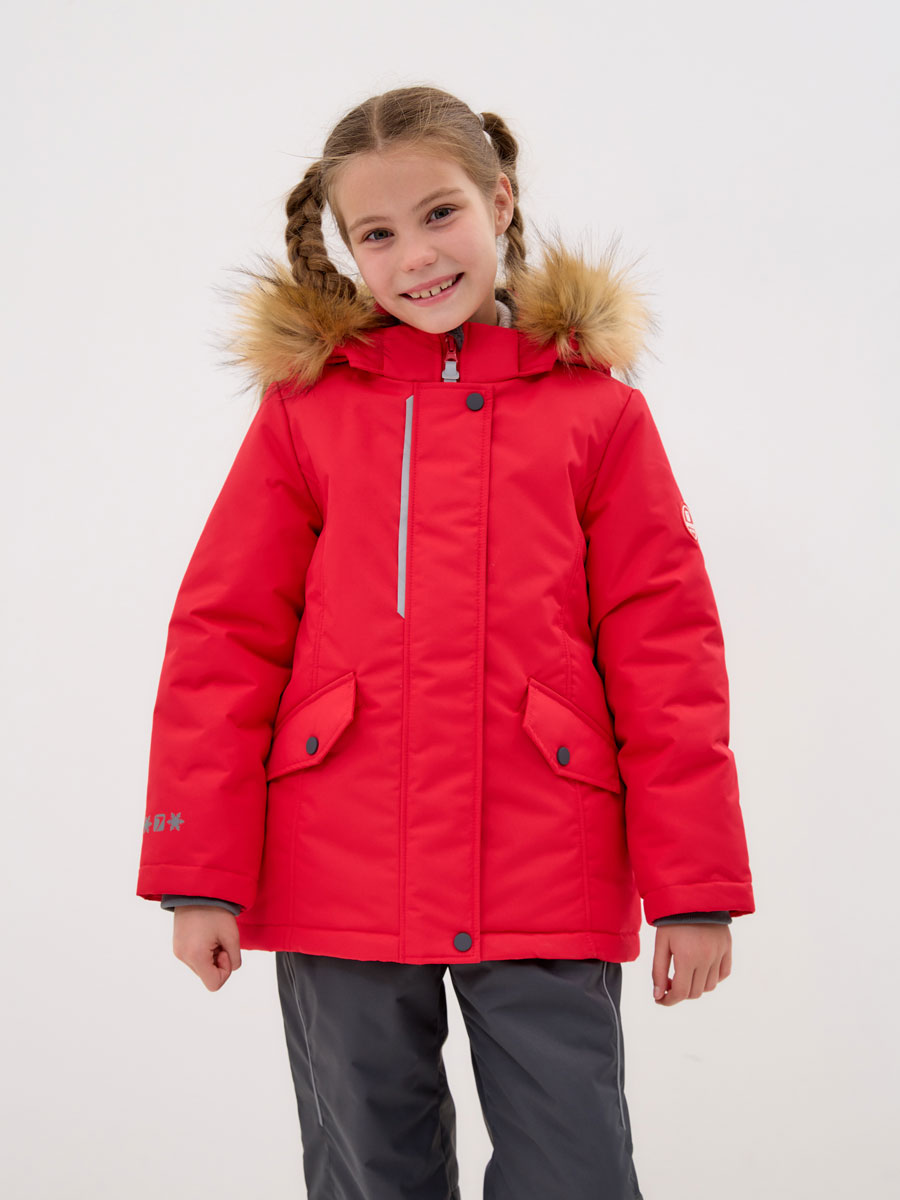 Куртка прямого силуэта, с втачным воротником-стойкой и отстёгивающимся капюшоном, с отстегивающейся опушкой из искусственного меха (енот). Застёжка на молнию, закрытая планкой на кнопках и липучках. 2 наружных кармана с клапаном на кнопке, 1 внутренний карман с липучкой. Подкладка из цветного флиса. В подкладке помочи из тесьмы для ношения куртки за плечами.