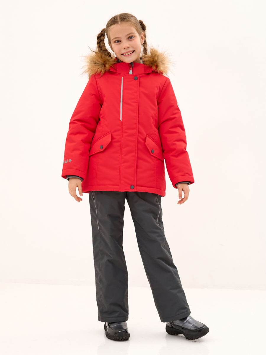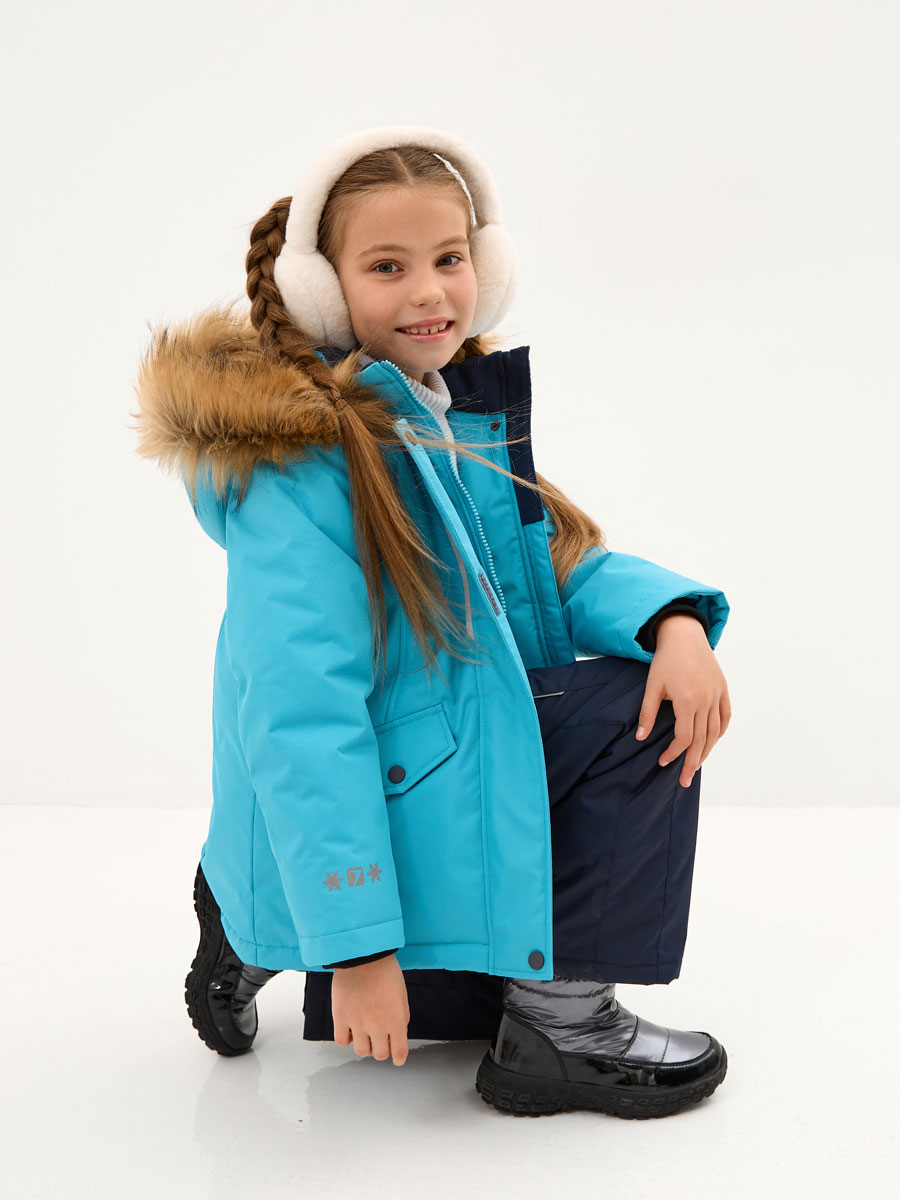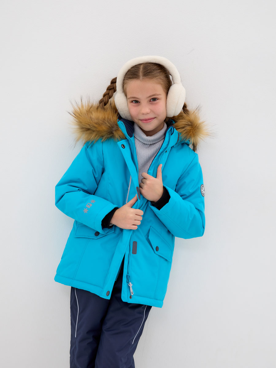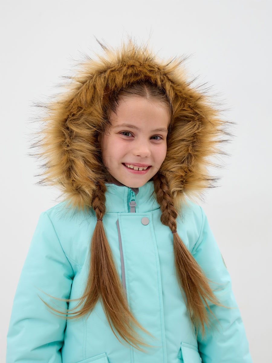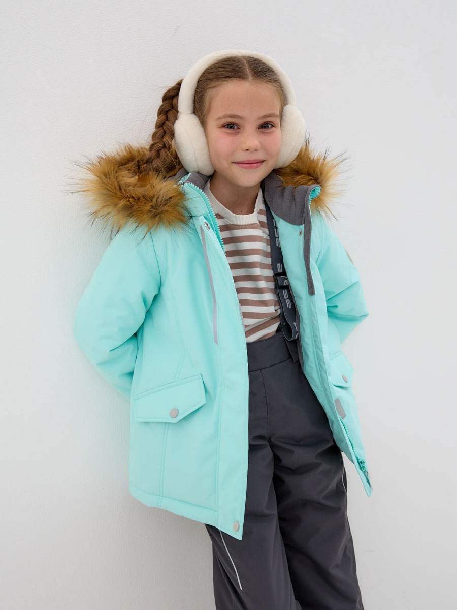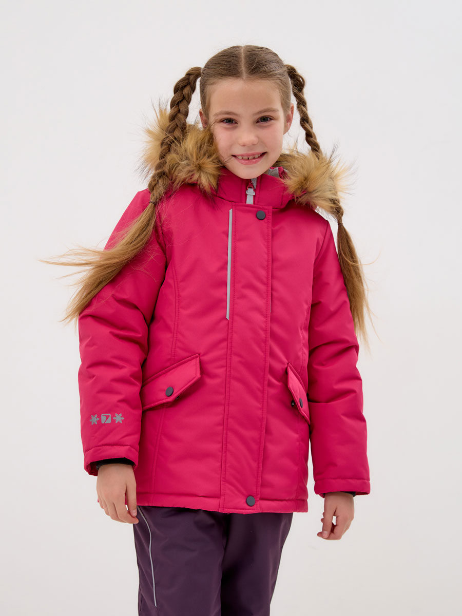 Куртка прямого силуэта, с втачным воротником-стойкой и отстёгивающимся капюшоном, с отстегивающейся опушкой из искусственного меха (енот). Застёжка на молнию, закрытая планкой на кнопках и липучках. 2 наружных кармана с клапаном на кнопке, 1 внутренний карман с липучкой. Подкладка из цветного флиса. В подкладке помочи из тесьмы для ношения куртки за плечами.
