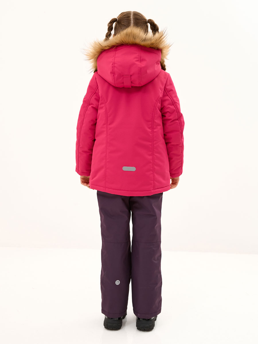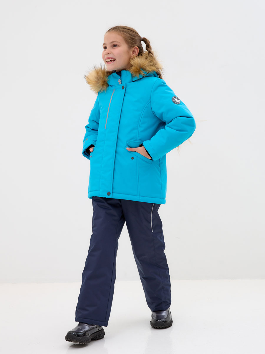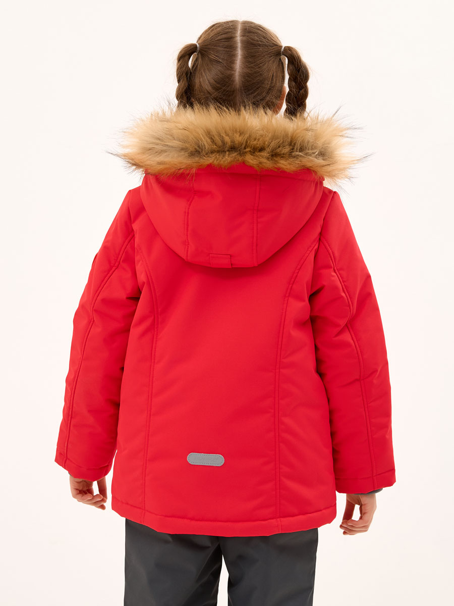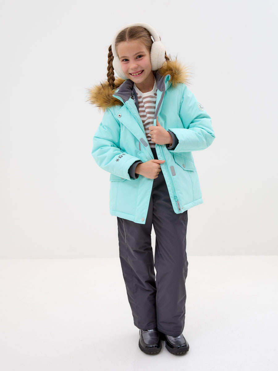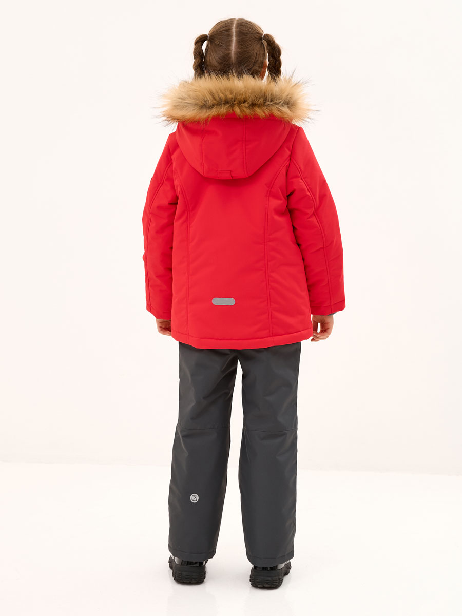 Куртка прямого силуэта, с втачным воротником-стойкой и отстёгивающимся капюшоном, с отстегивающейся опушкой из искусственного меха (енот). Застёжка на молнию, закрытая планкой на кнопках и липучках. 2 наружных кармана с клапаном на кнопке, 1 внутренний карман с липучкой. Подкладка из цветного флиса. В подкладке помочи из тесьмы для ношения куртки за плечами.