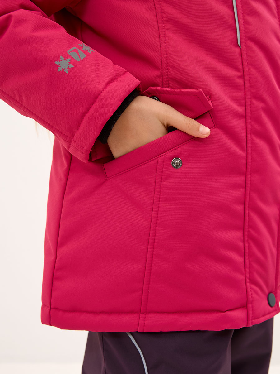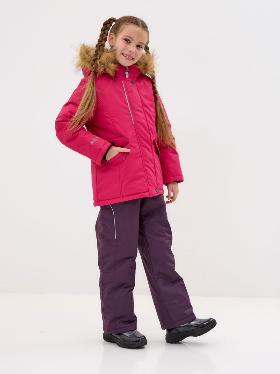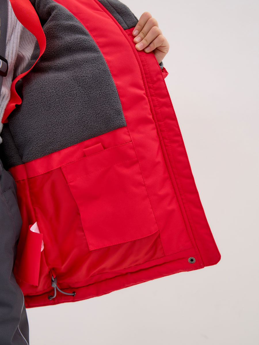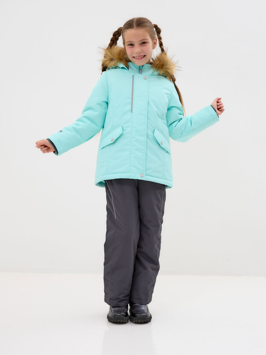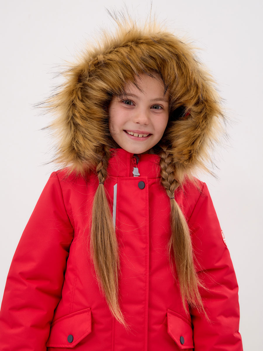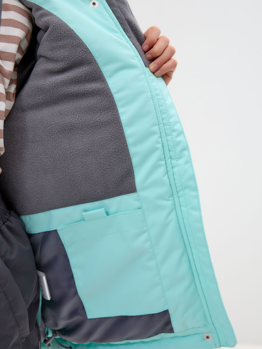 Куртка прямого силуэта, с втачным воротником-стойкой и отстёгивающимся капюшоном, с отстегивающейся опушкой из искусственного меха (енот). Застёжка на молнию, закрытая планкой на кнопках и липучках. 2 наружных кармана с клапаном на кнопке, 1 внутренний карман с липучкой. Подкладка из цветного флиса. В подкладке помочи из тесьмы для ношения куртки за плечами.
