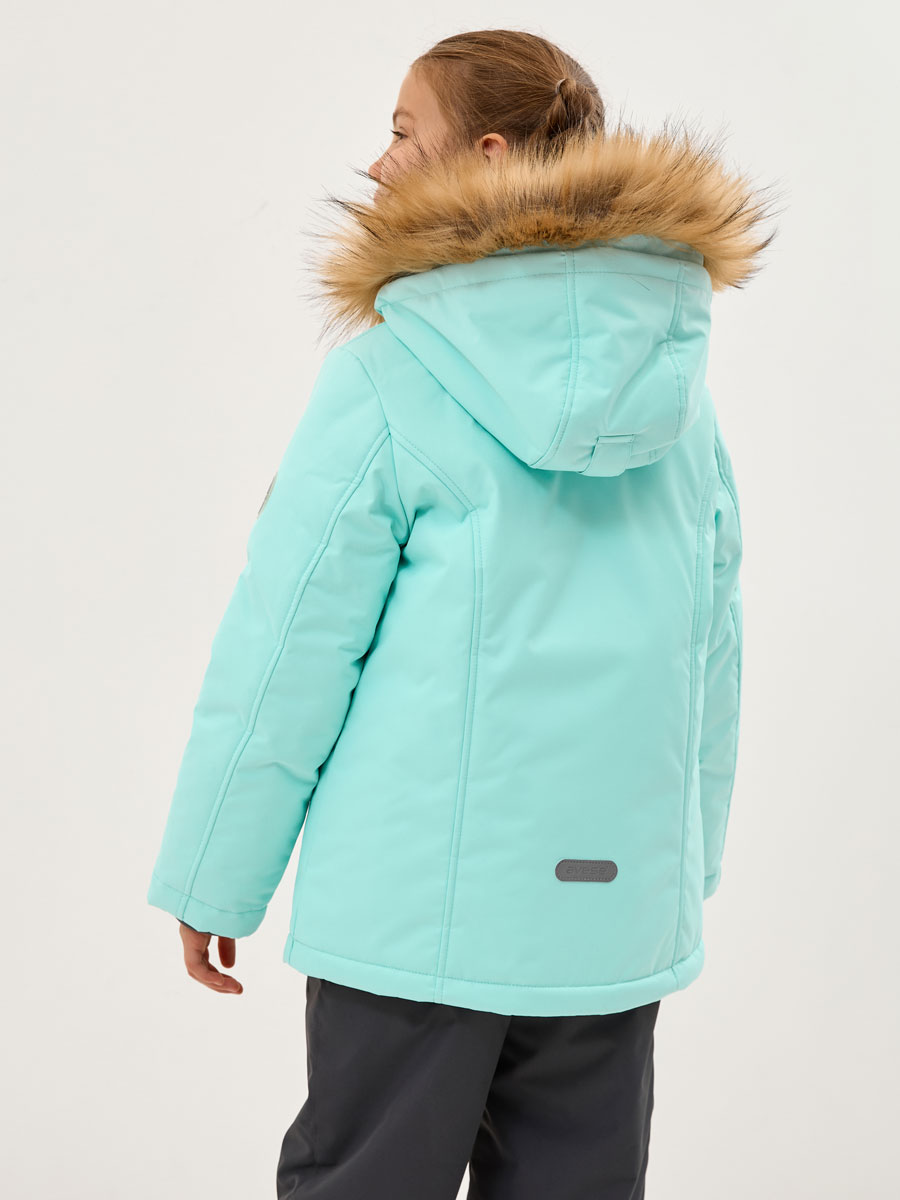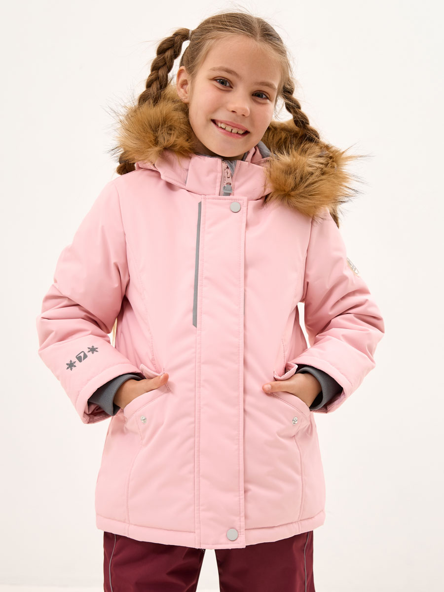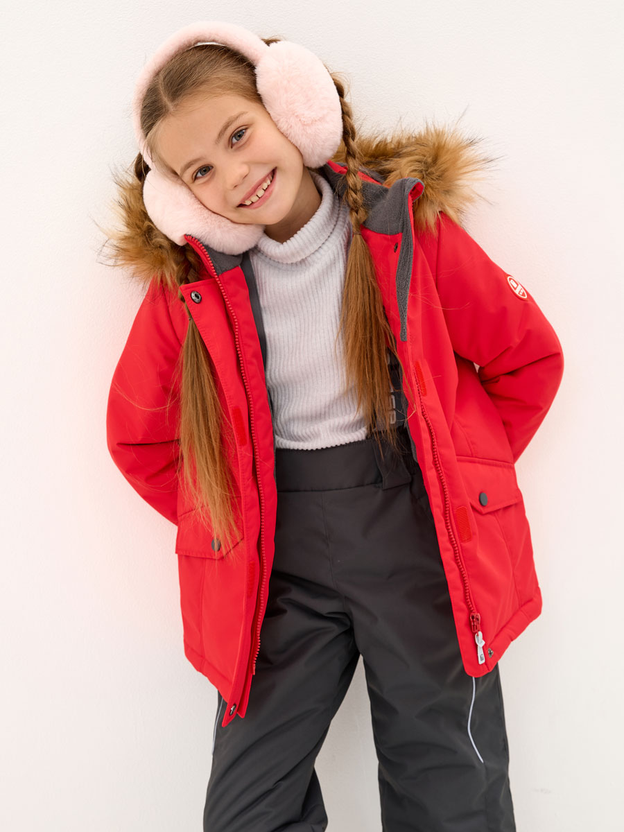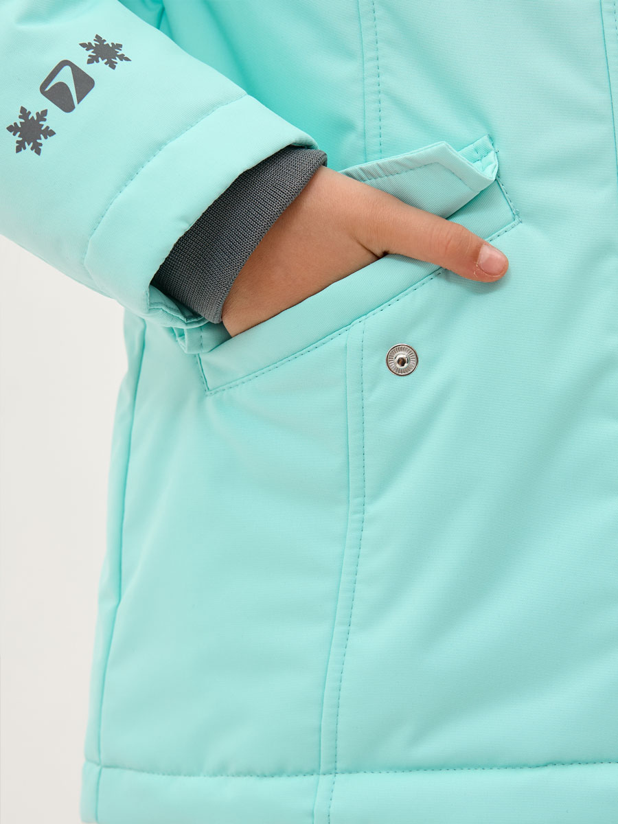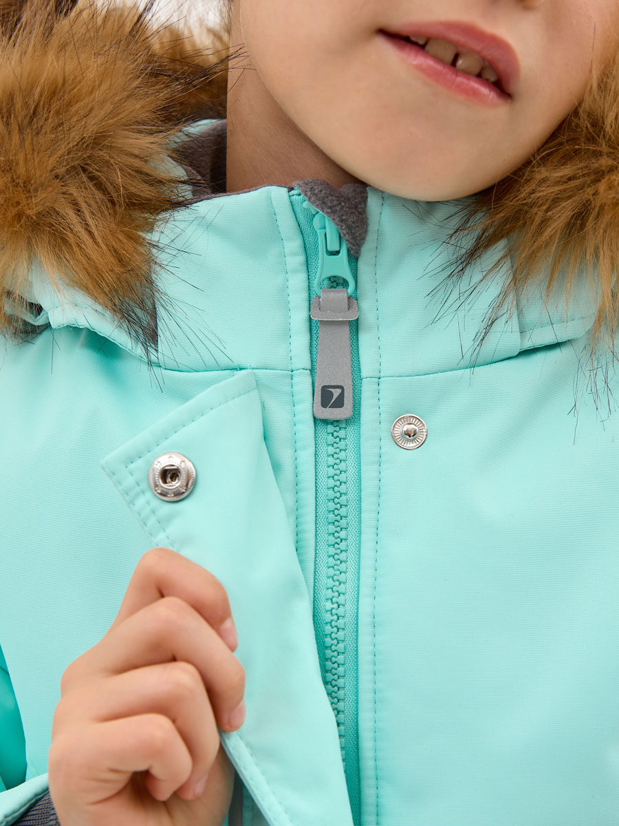 Куртка прямого силуэта, с втачным воротником-стойкой и отстёгивающимся капюшоном, с отстегивающейся опушкой из искусственного меха (енот). Застёжка на молнию, закрытая планкой на кнопках и липучках. 2 наружных кармана с клапаном на кнопке, 1 внутренний карман с липучкой. Подкладка из цветного флиса. В подкладке помочи из тесьмы для ношения куртки за плечами.