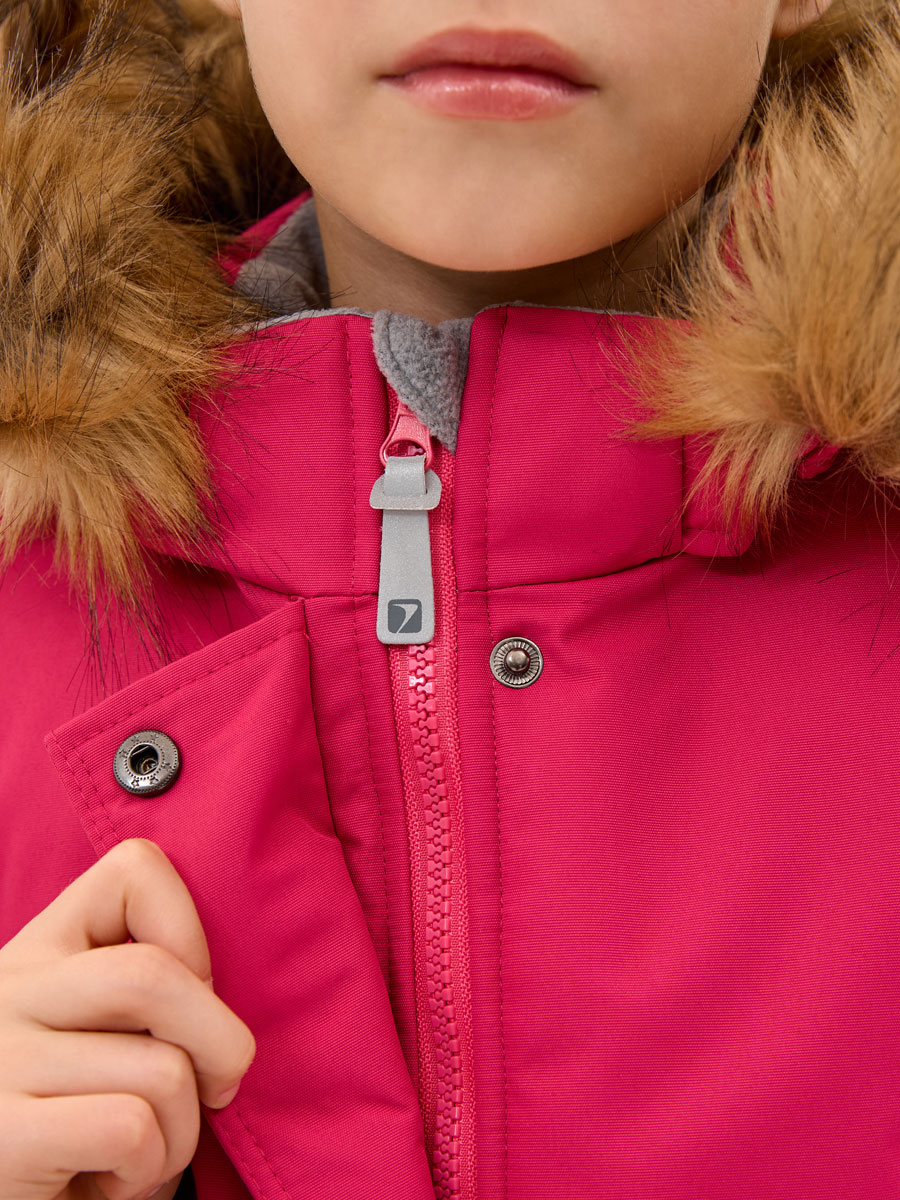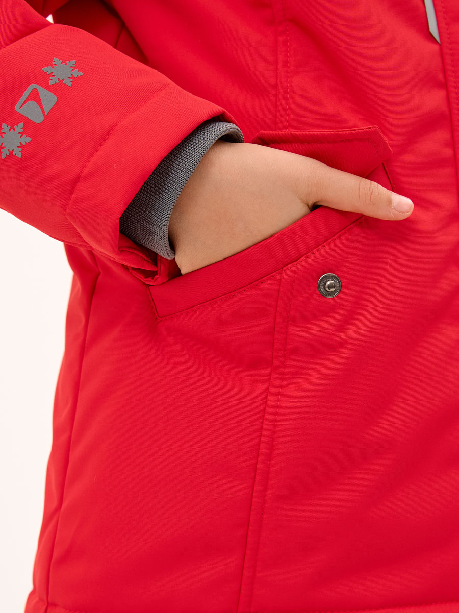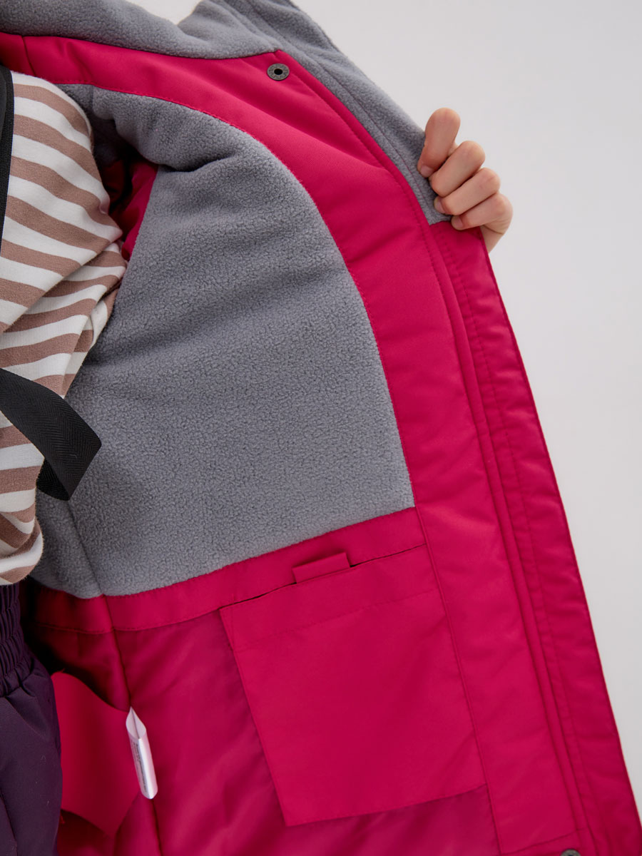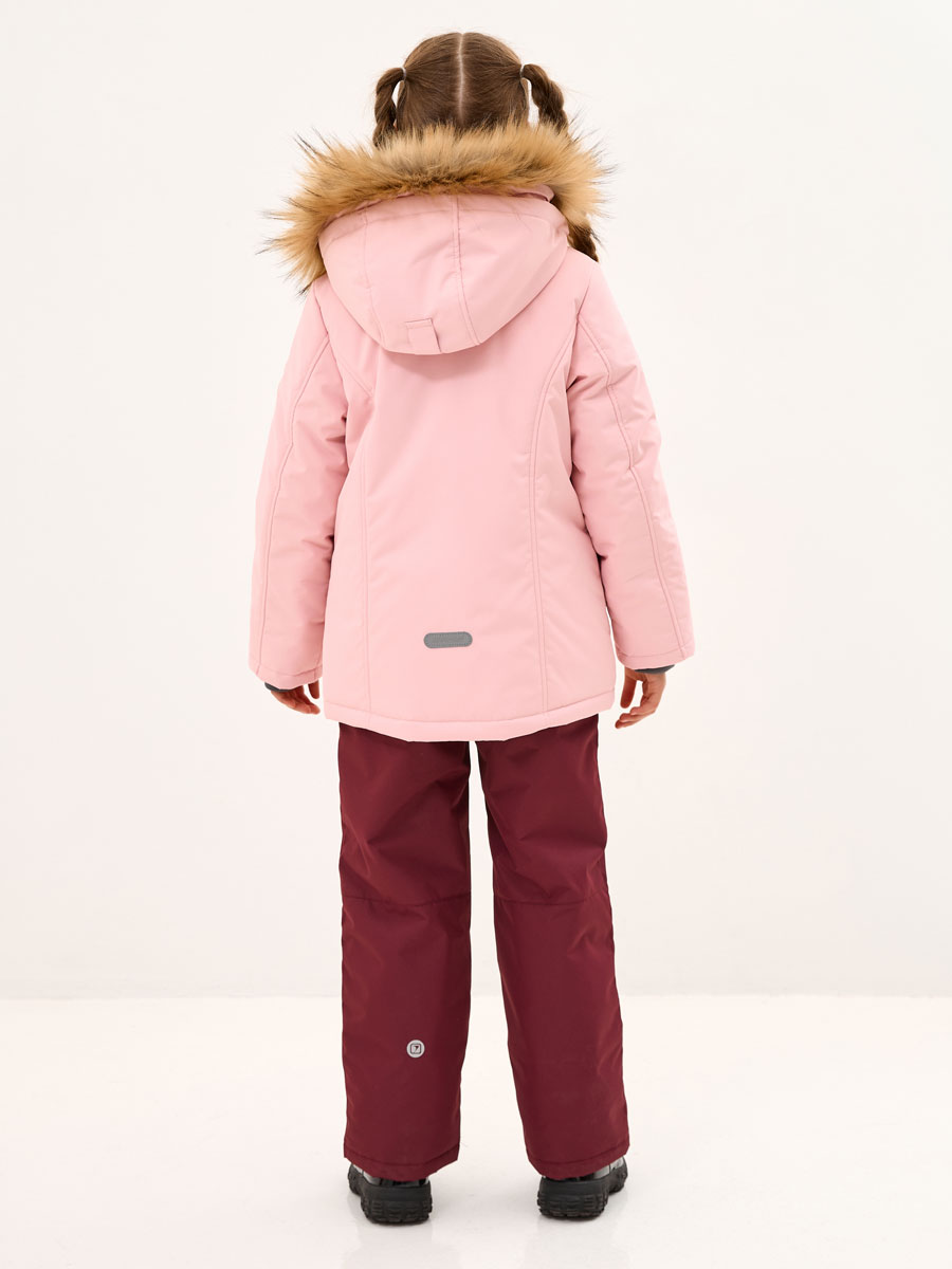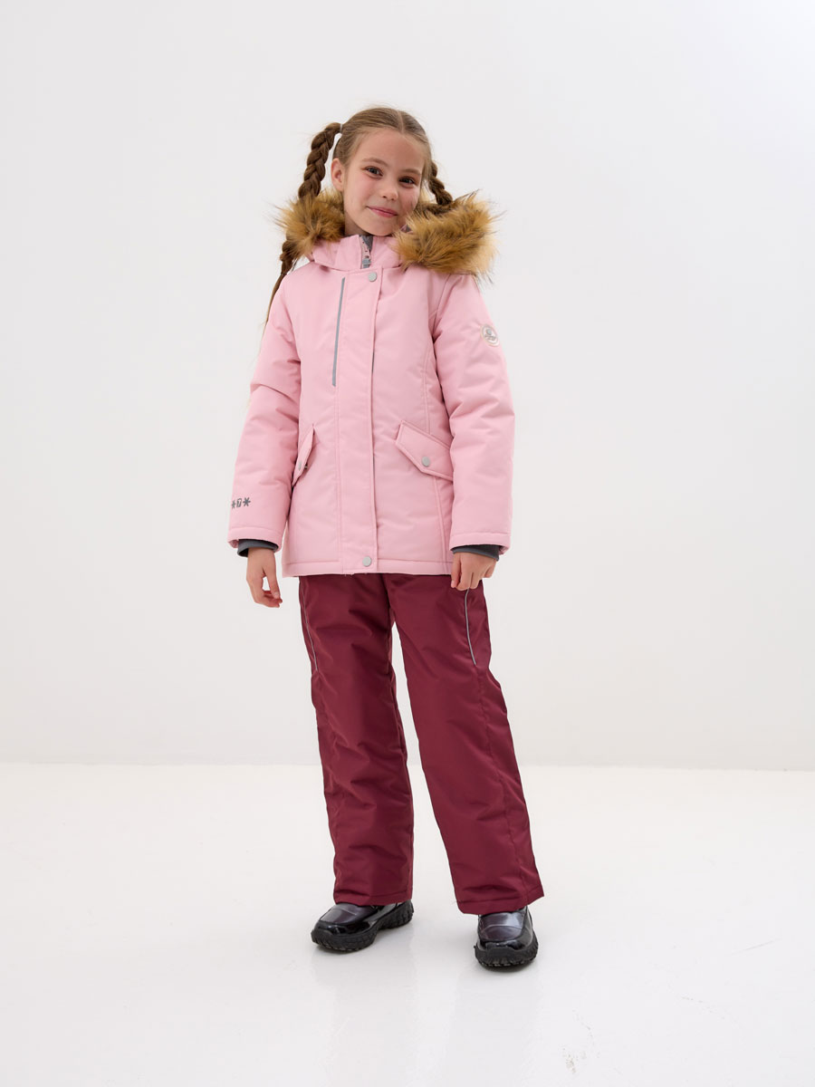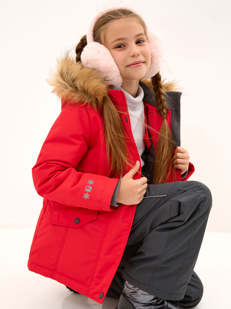 Куртка прямого силуэта, с втачным воротником-стойкой и отстёгивающимся капюшоном, с отстегивающейся опушкой из искусственного меха (енот). Застёжка на молнию, закрытая планкой на кнопках и липучках. 2 наружных кармана с клапаном на кнопке, 1 внутренний карман с липучкой. Подкладка из цветного флиса. В подкладке помочи из тесьмы для ношения куртки за плечами.