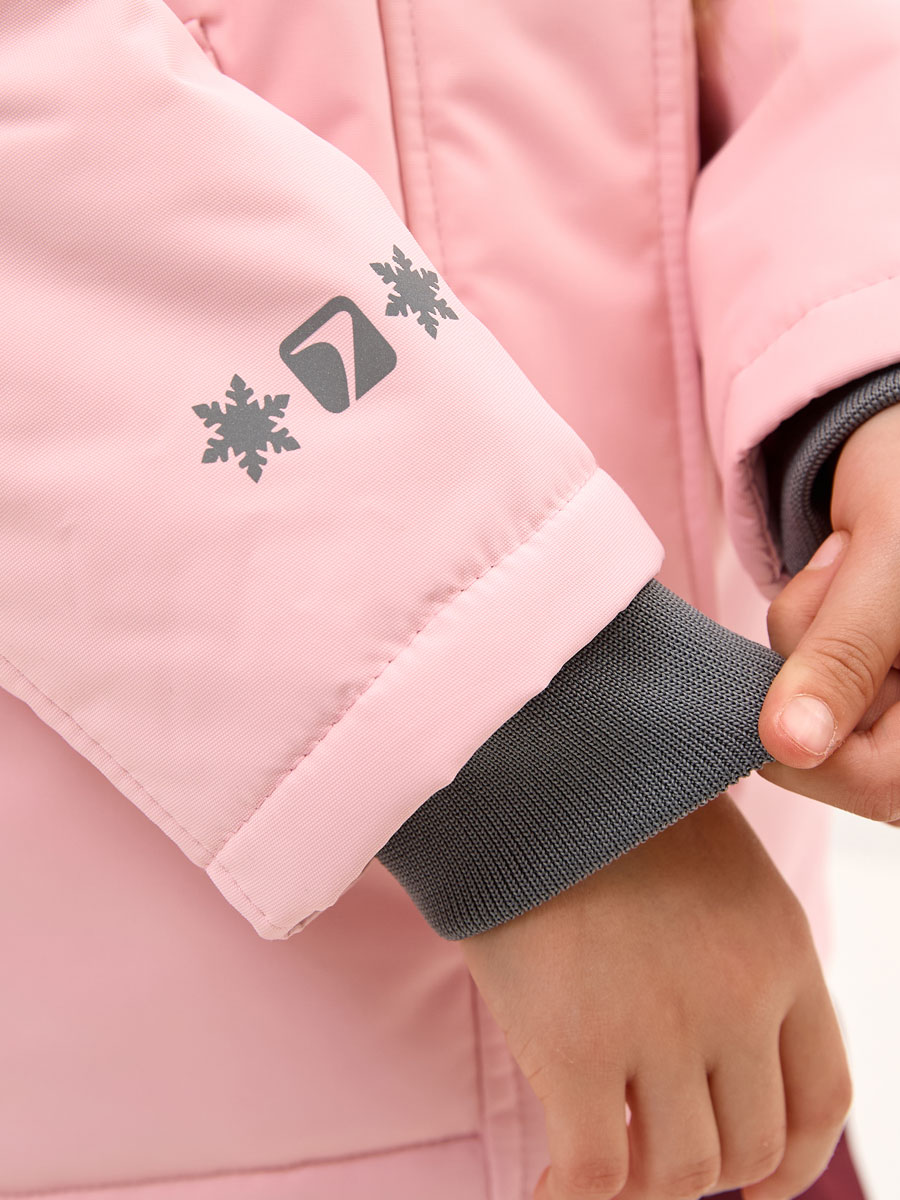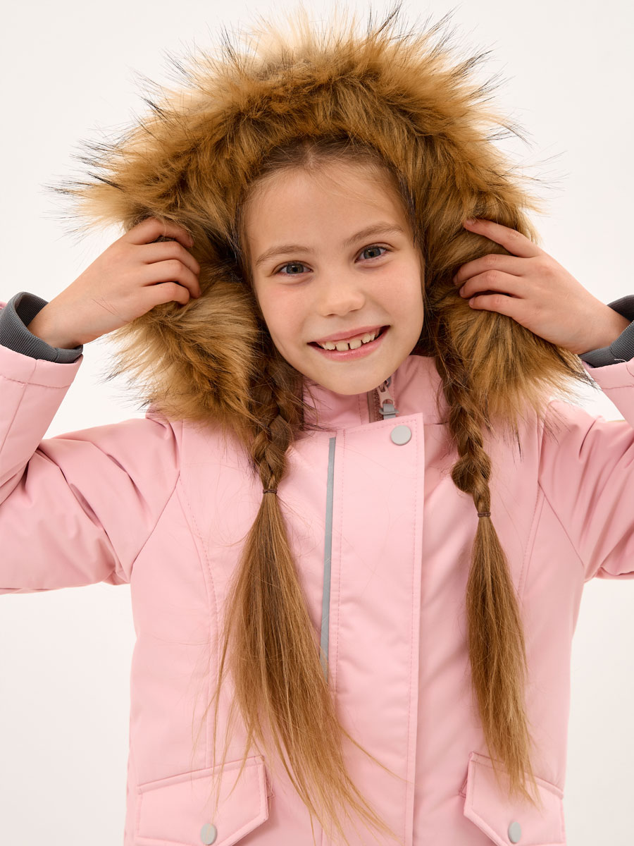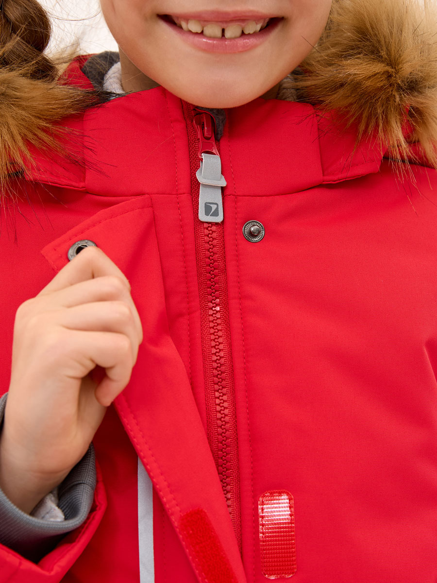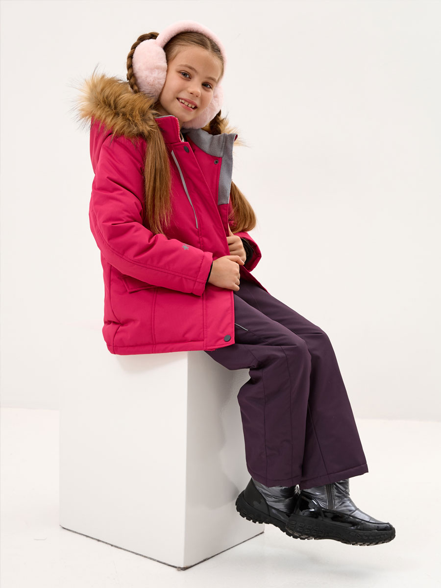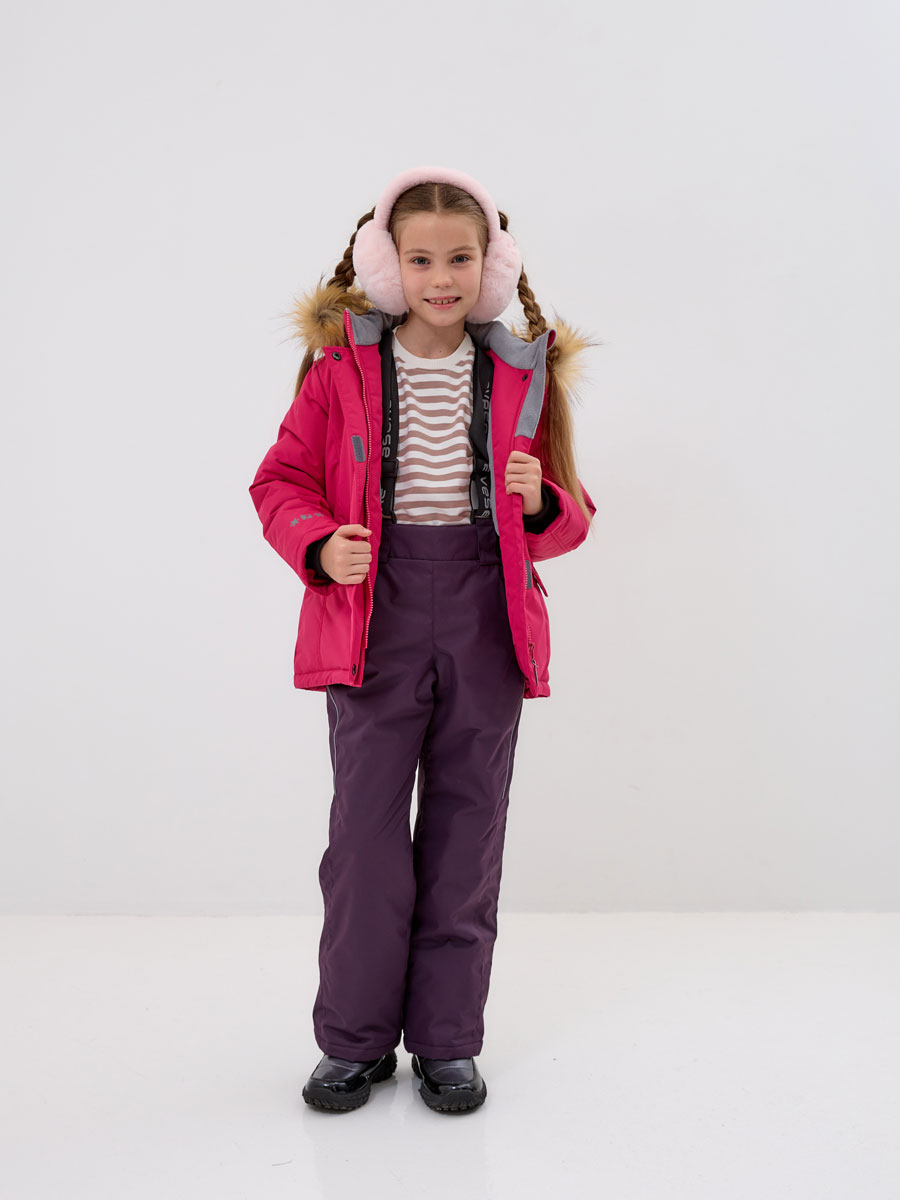 Куртка прямого силуэта, с втачным воротником-стойкой и отстёгивающимся капюшоном, с отстегивающейся опушкой из искусственного меха (енот). Застёжка на молнию, закрытая планкой на кнопках и липучках. 2 наружных кармана с клапаном на кнопке, 1 внутренний карман с липучкой. Подкладка из цветного флиса. В подкладке помочи из тесьмы для ношения куртки за плечами.