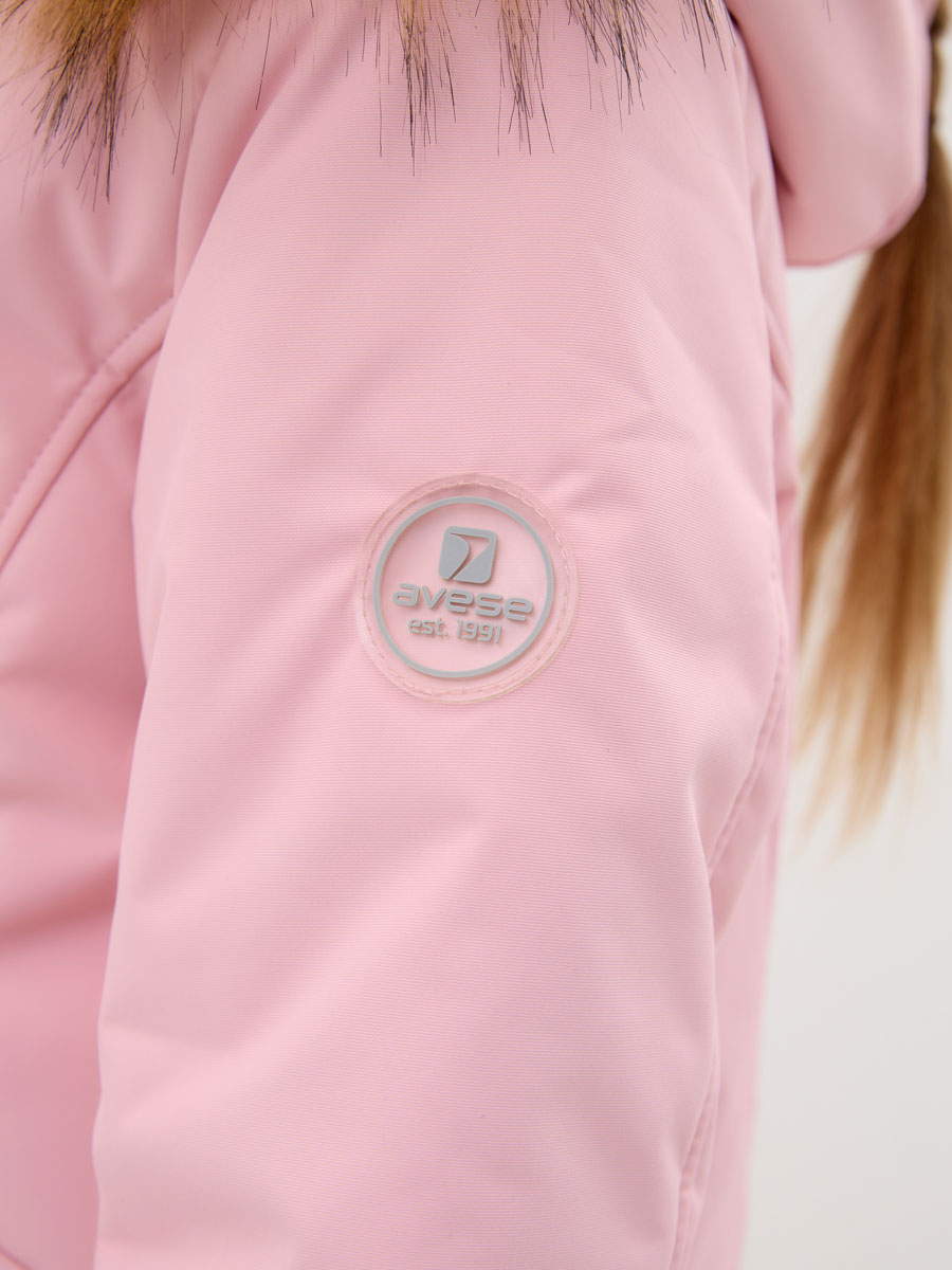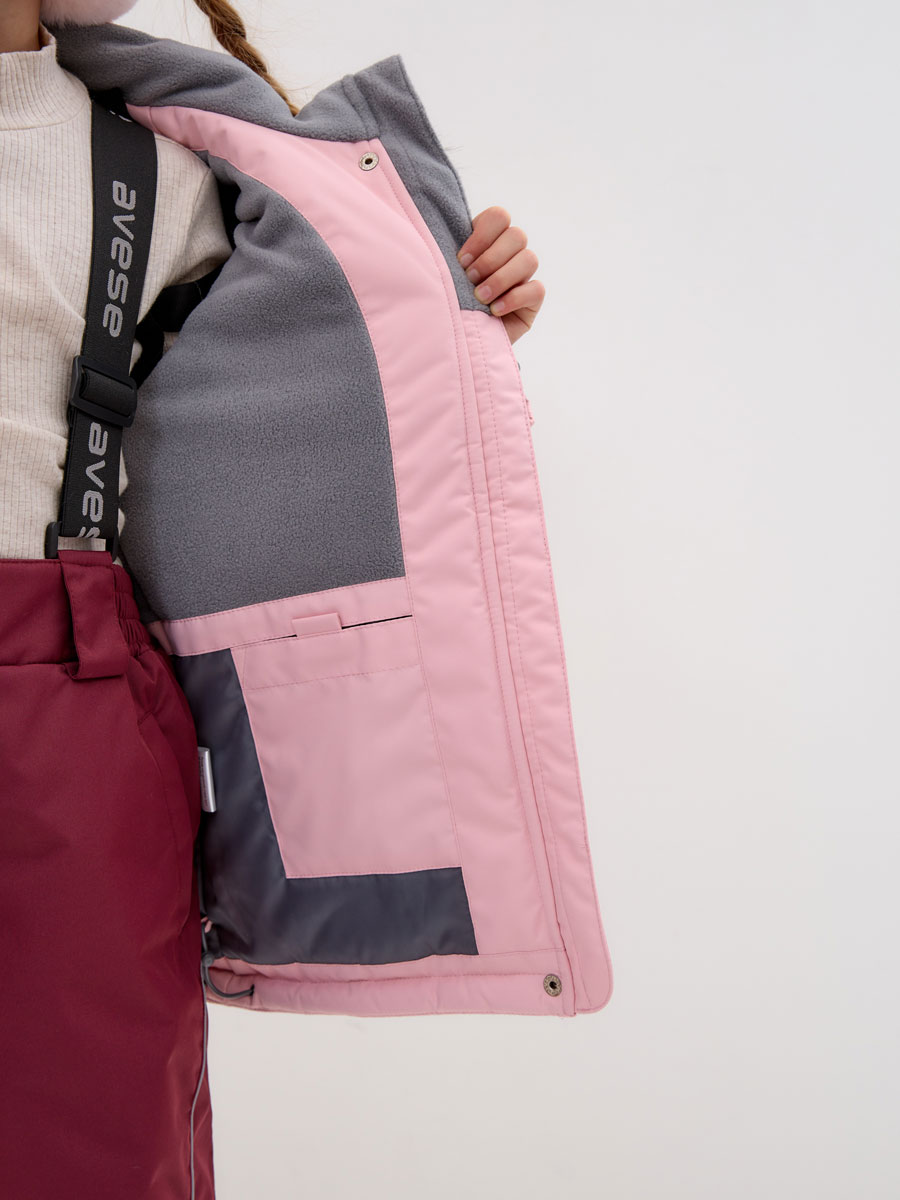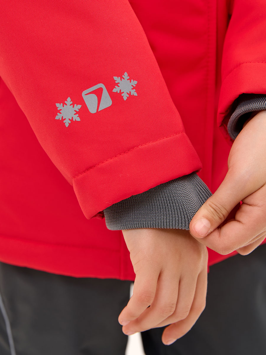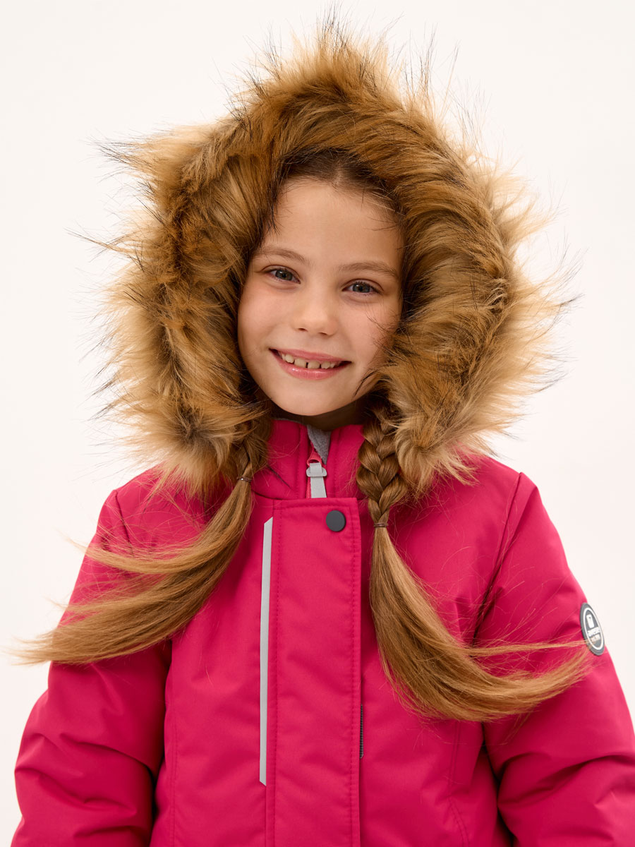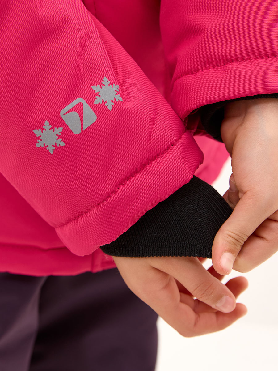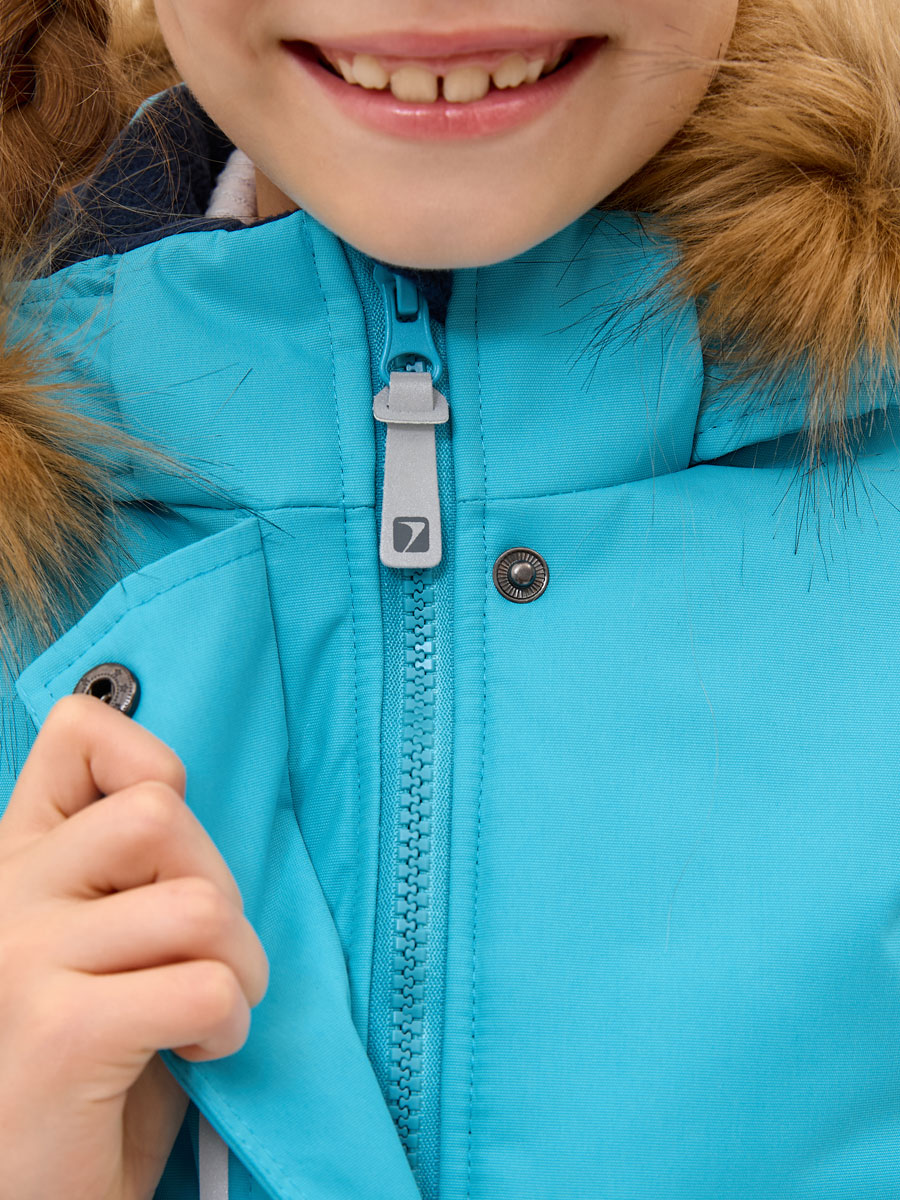 Куртка прямого силуэта, с втачным воротником-стойкой и отстёгивающимся капюшоном, с отстегивающейся опушкой из искусственного меха (енот). Застёжка на молнию, закрытая планкой на кнопках и липучках. 2 наружных кармана с клапаном на кнопке, 1 внутренний карман с липучкой. Подкладка из цветного флиса. В подкладке помочи из тесьмы для ношения куртки за плечами.