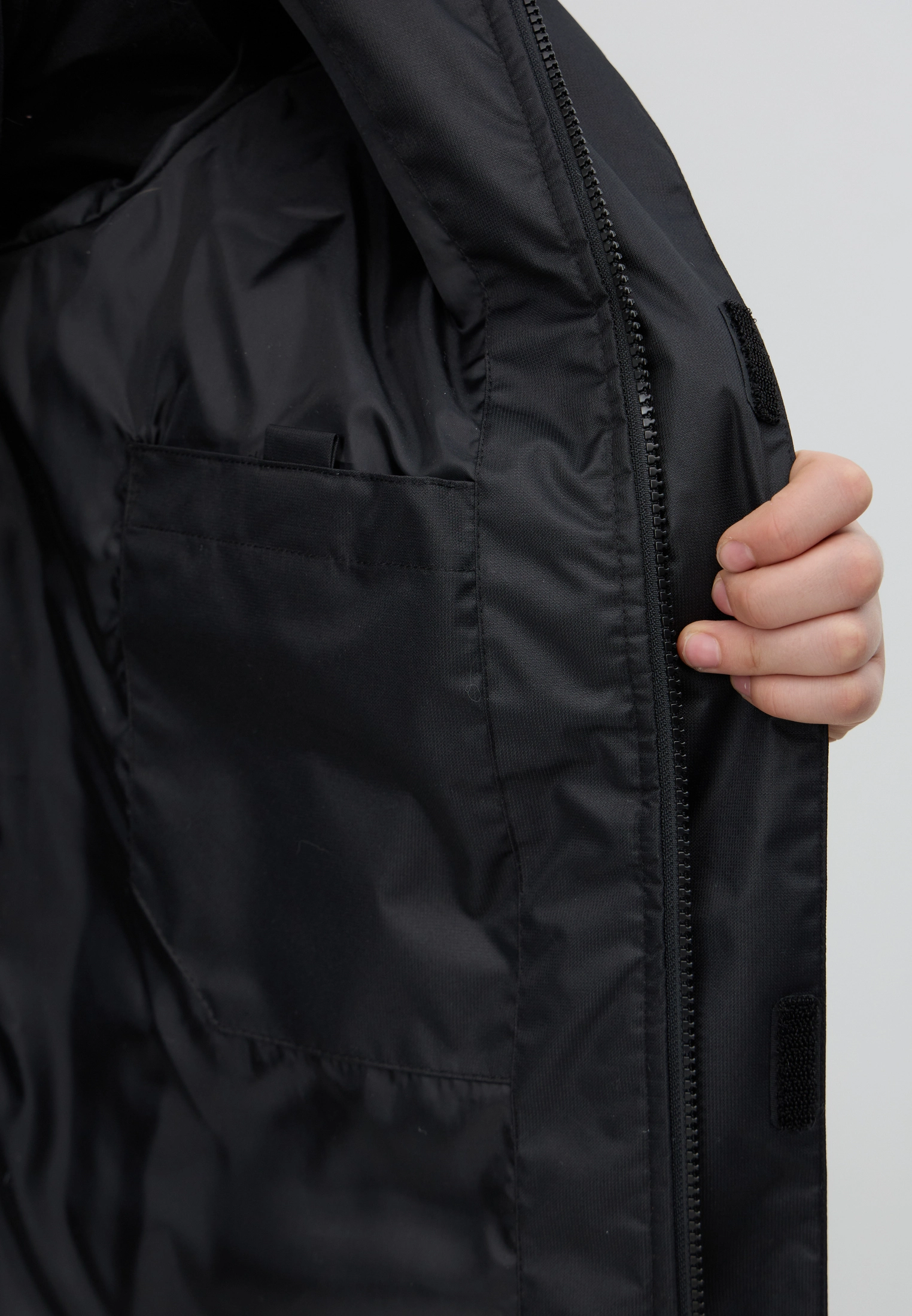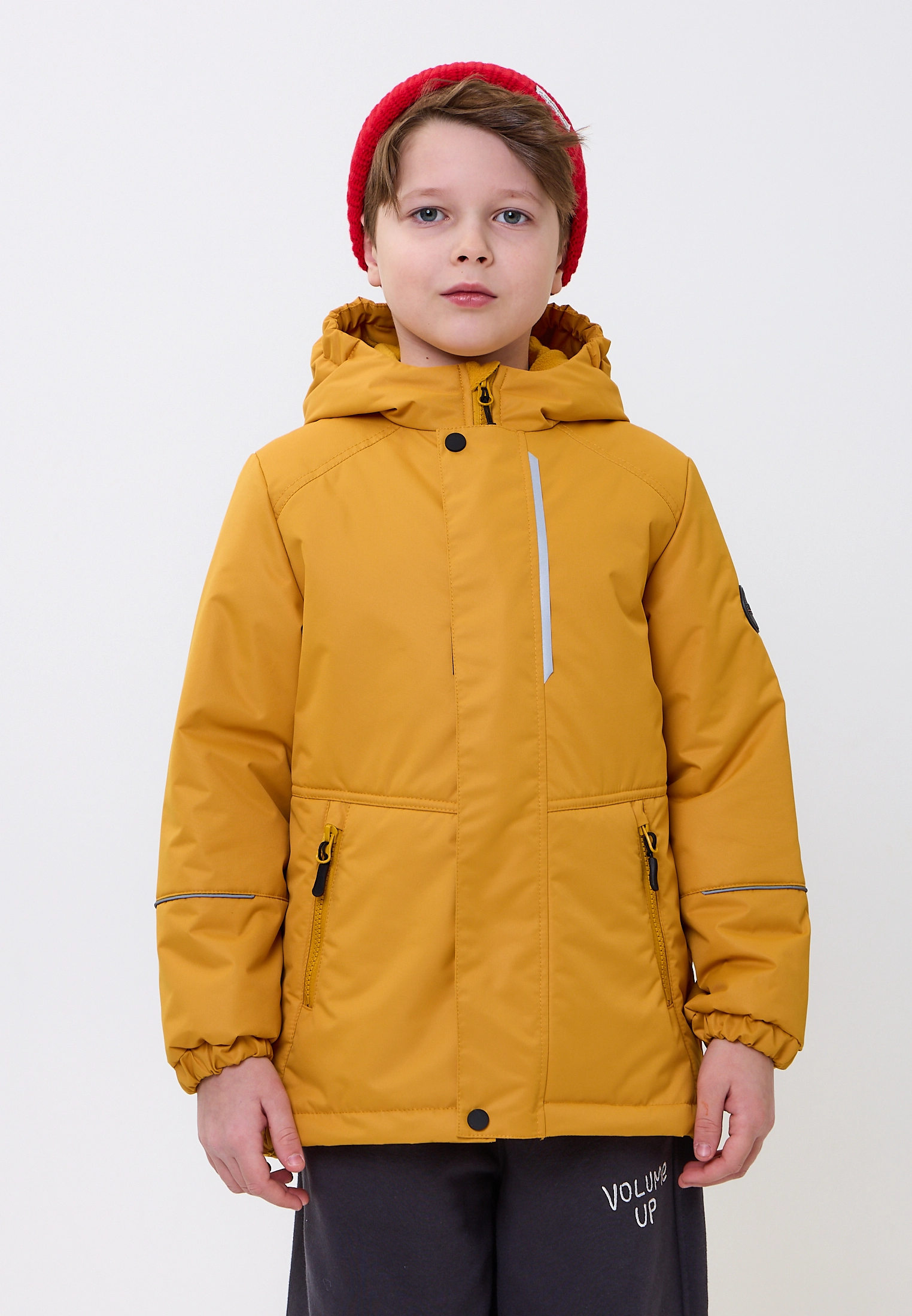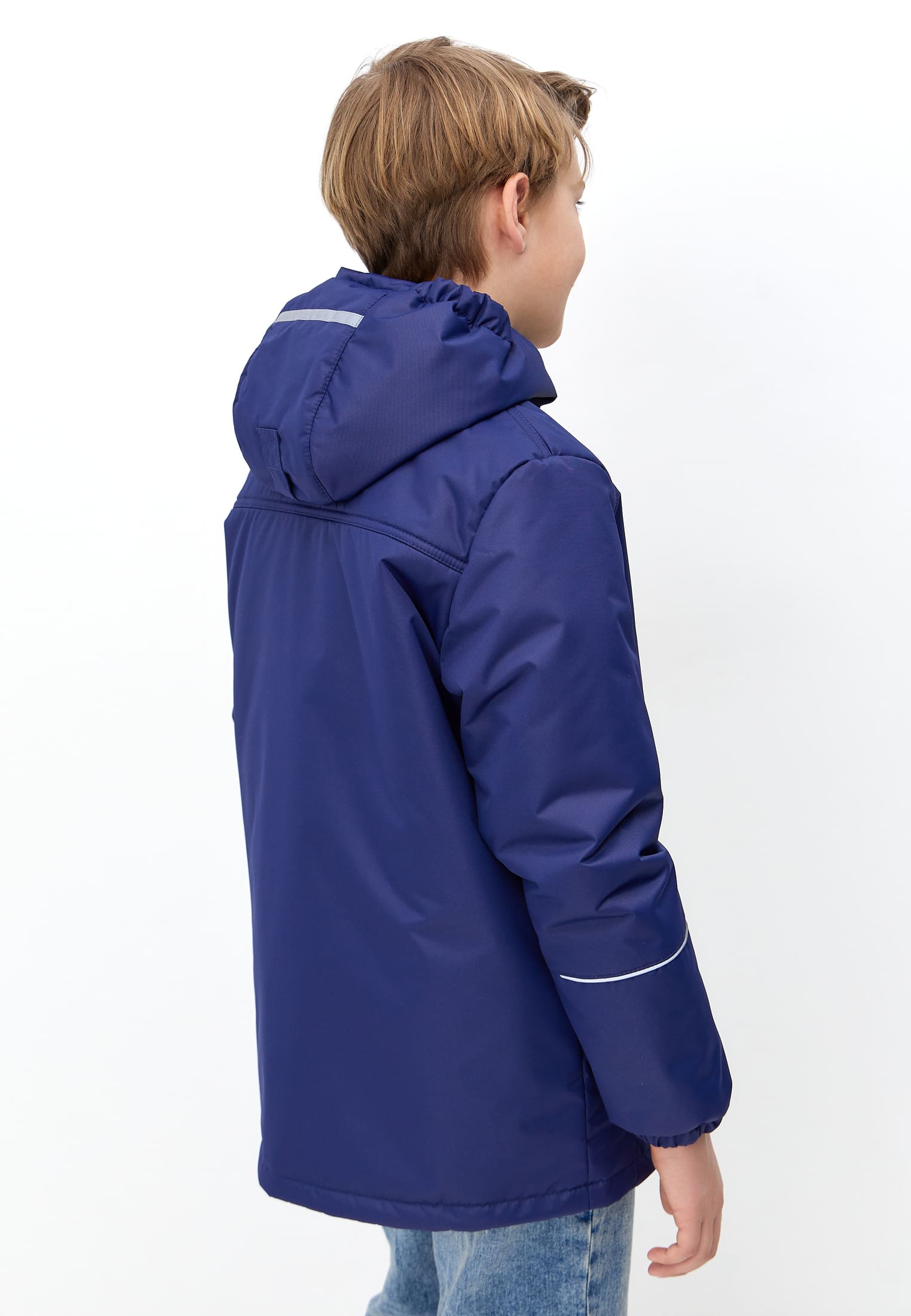Демисезонная куртка для мальчиков на утеплителе, прямого силуэта, с втачным капюшоном. Центральная застёжка на молнию, закрытую центральной планкой на кнопках и липучке. По низу куртки кулиса с резиновым шнуром и фиксаторами для удобства прилегания. Низ рукава с отрезным манжетом на резинке. 2 прорезных кармана с молниями. По лицевому краю капюшона кулиса с резинкой. На центральной части капюшона хлястик и липучка для регулировки. Подкладка комбинированная с флисом. На левой подкладочной полочке – накладной карман с липучкой. Рассчитана на температуру от 0 до +15.