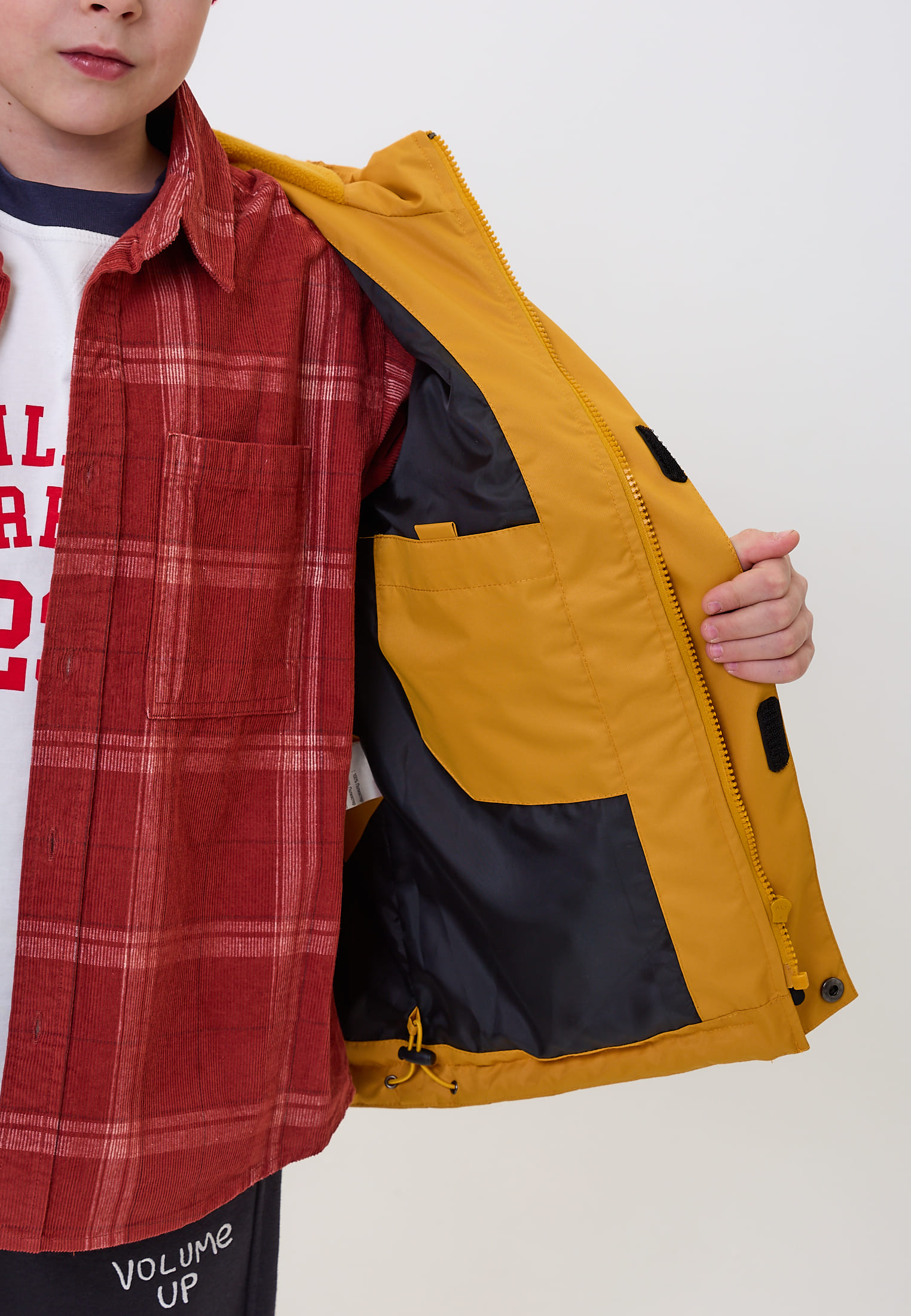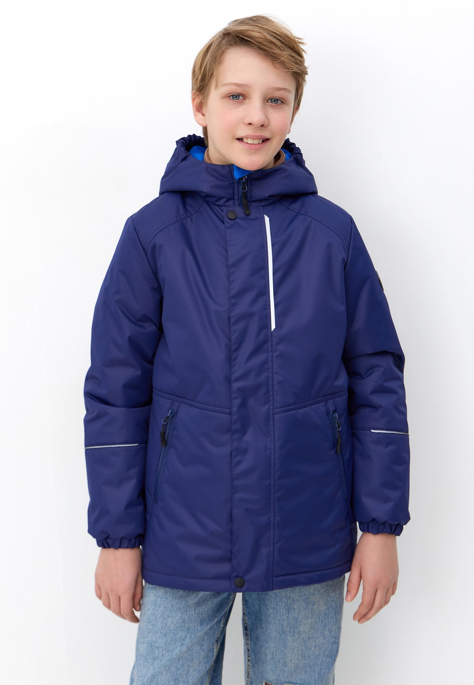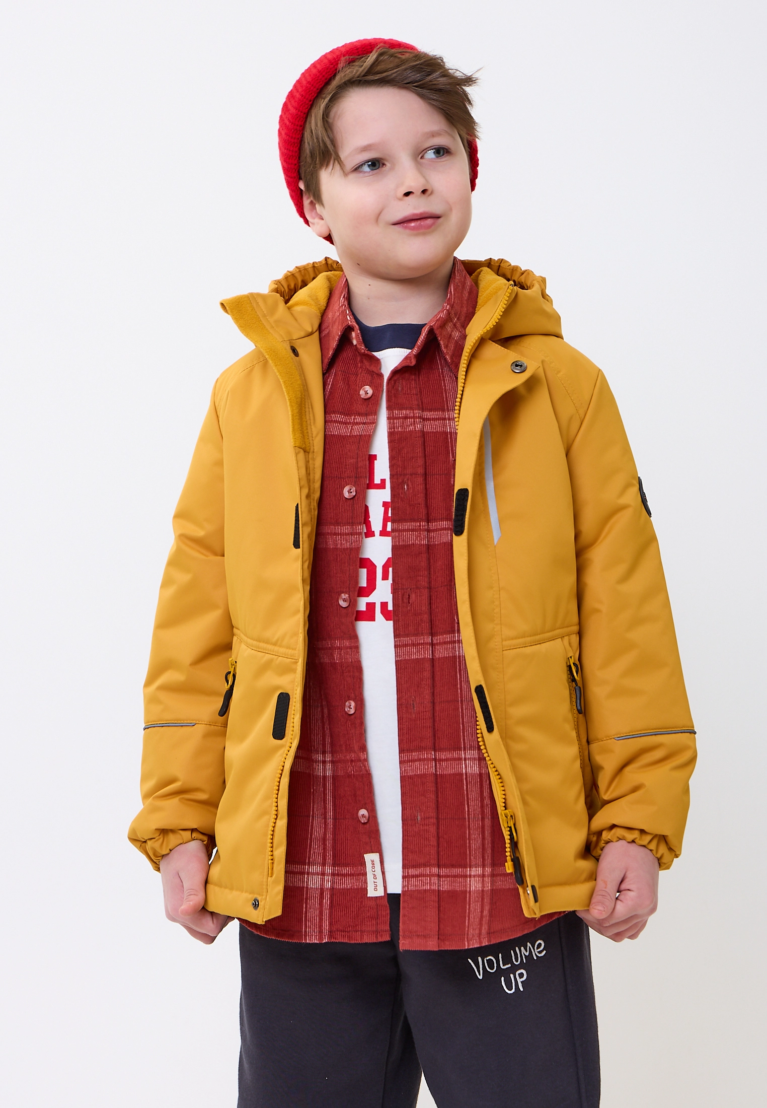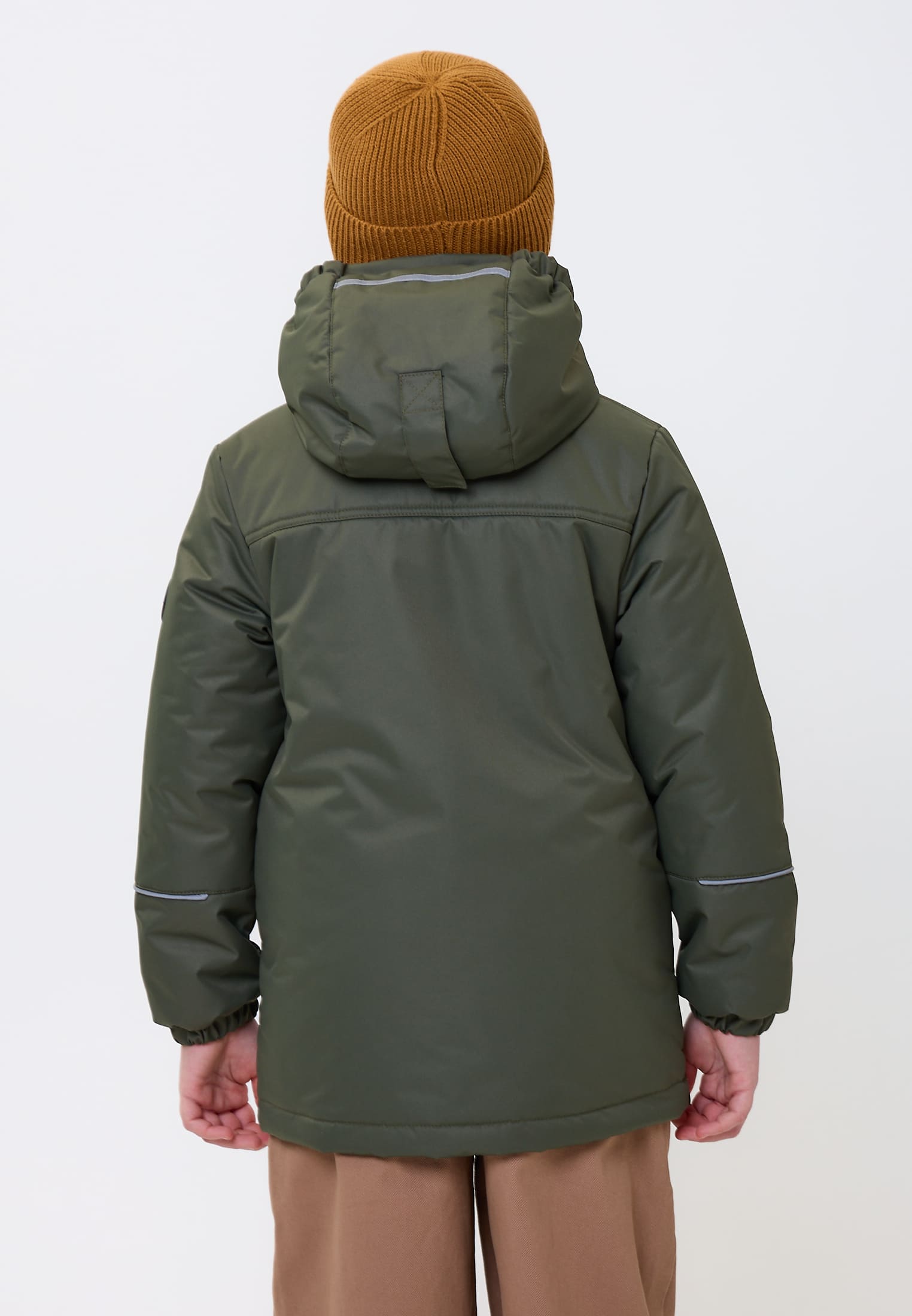 Демисезонная куртка для мальчиков на утеплителе, прямого силуэта, с втачным капюшоном. Центральная застёжка на молнию, закрытую центральной планкой на кнопках и липучке. По низу куртки кулиса с резиновым шнуром и фиксаторами для удобства прилегания. Низ рукава с отрезным манжетом на резинке. 2 прорезных кармана с молниями. По лицевому краю капюшона кулиса с резинкой. На центральной части капюшона хлястик и липучка для регулировки. Подкладка комбинированная с флисом. На левой подкладочной полочке – накладной карман с липучкой. Рассчитана на температуру от 0 до +15.