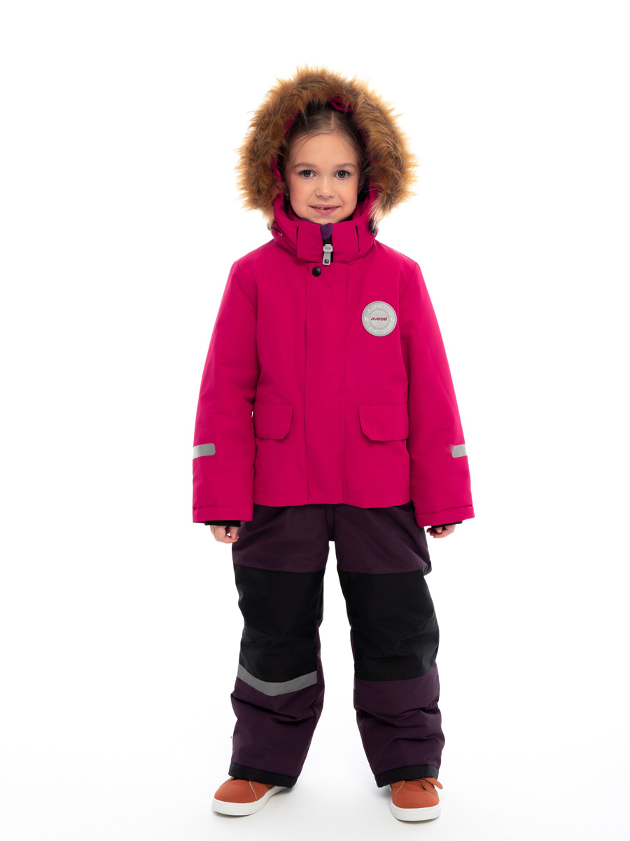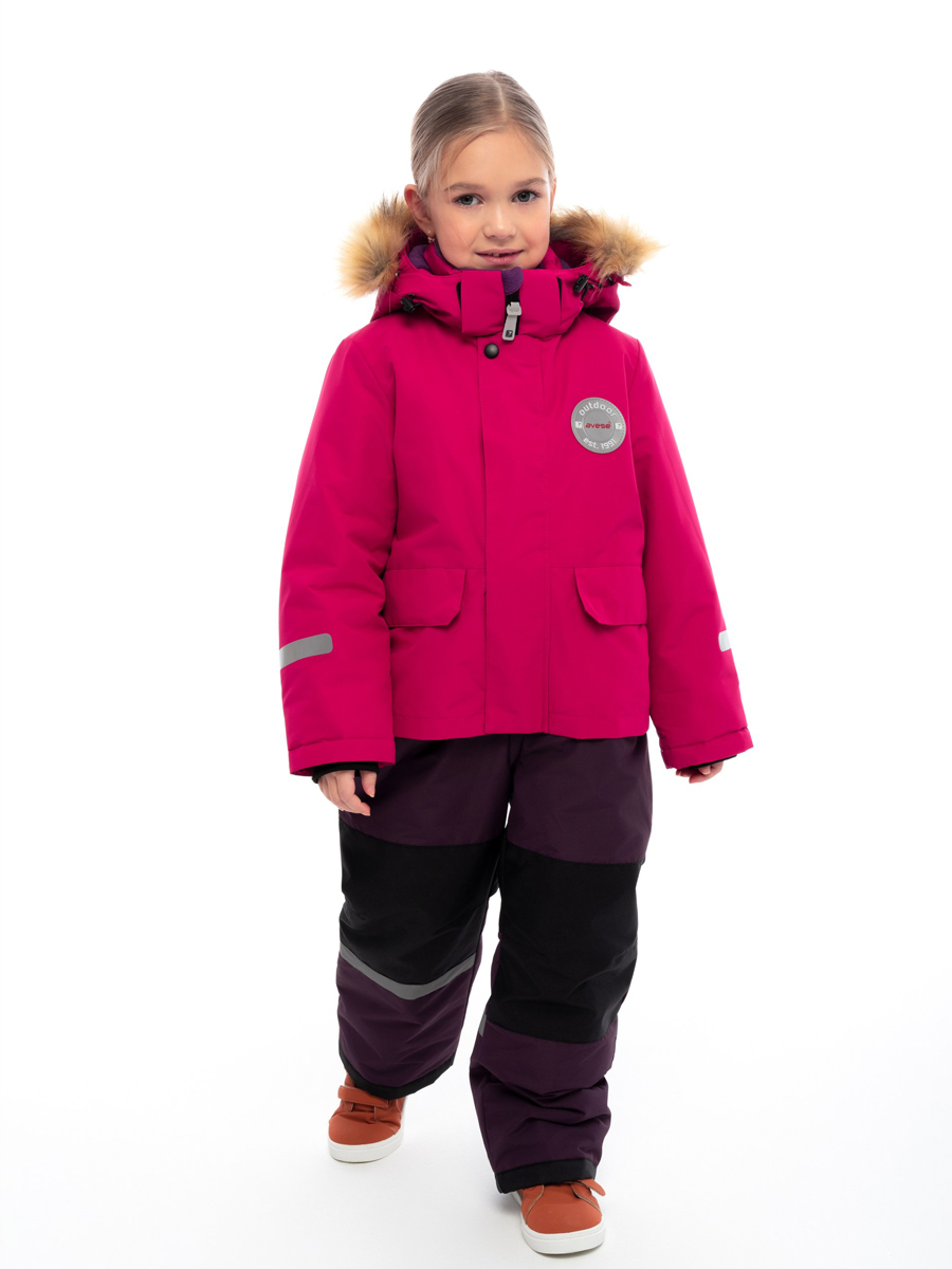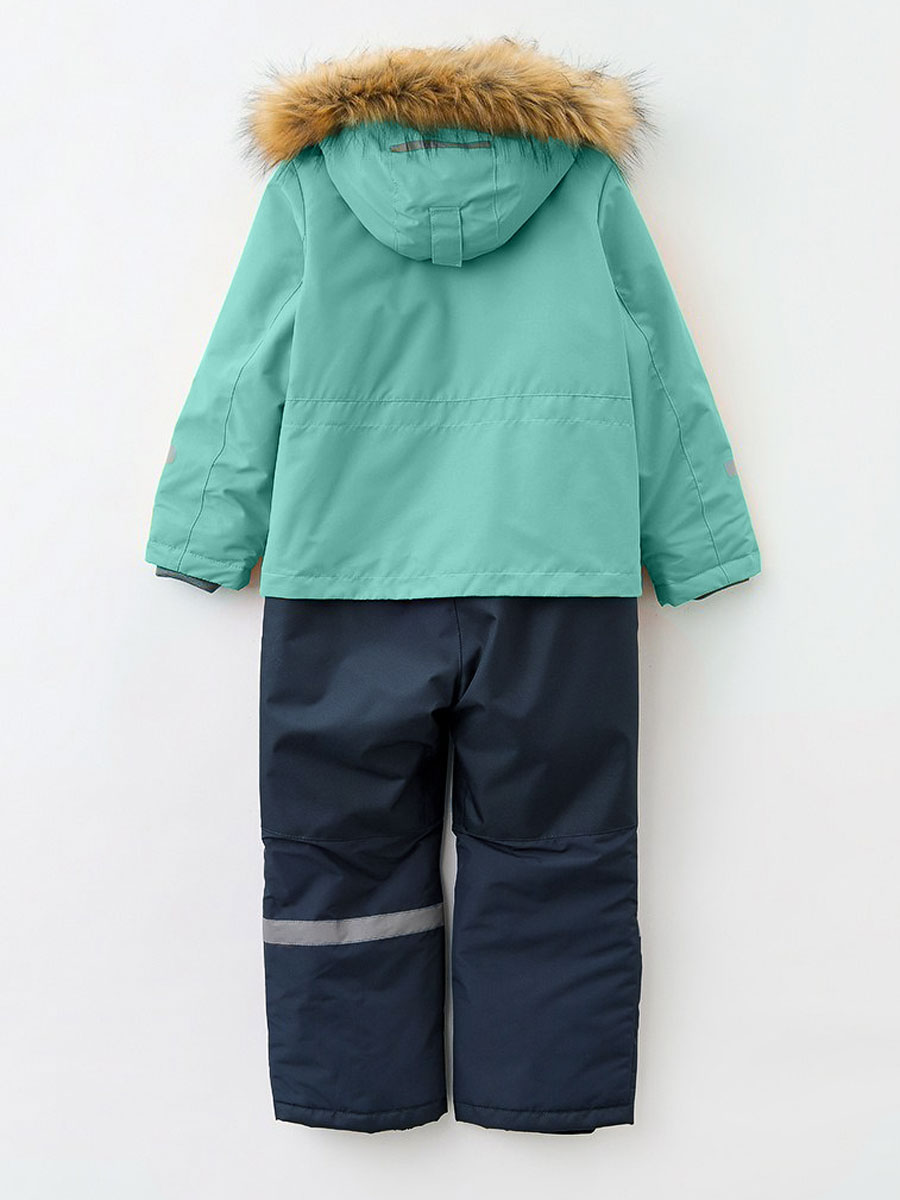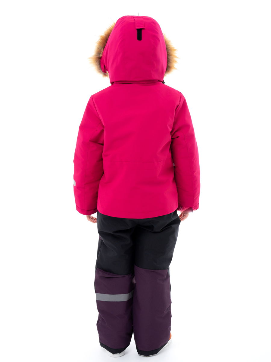 Комбинезон зимний комбинированный для детей из мембранной ткани. Задняя часть брюк и колени из особо прочной ткани, устойчивой к истиранию. Центральная молния закрыта планкой на липучках и кнопках. Комбинированная подкладка из цветного флиса и шелка. Съемный капюшон с отстёгивающейся опушкой из искусственного меха. 2 передних кармана на кнопках. Низ рукава прямой с внутренним манжетом. Низ брюк прямой с внутренней снегозащитной муфтой. На комбинезоне расположены светоотражающие элементы. Рассчитана на температуру от -10 до -25.