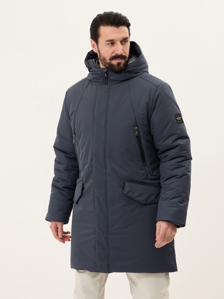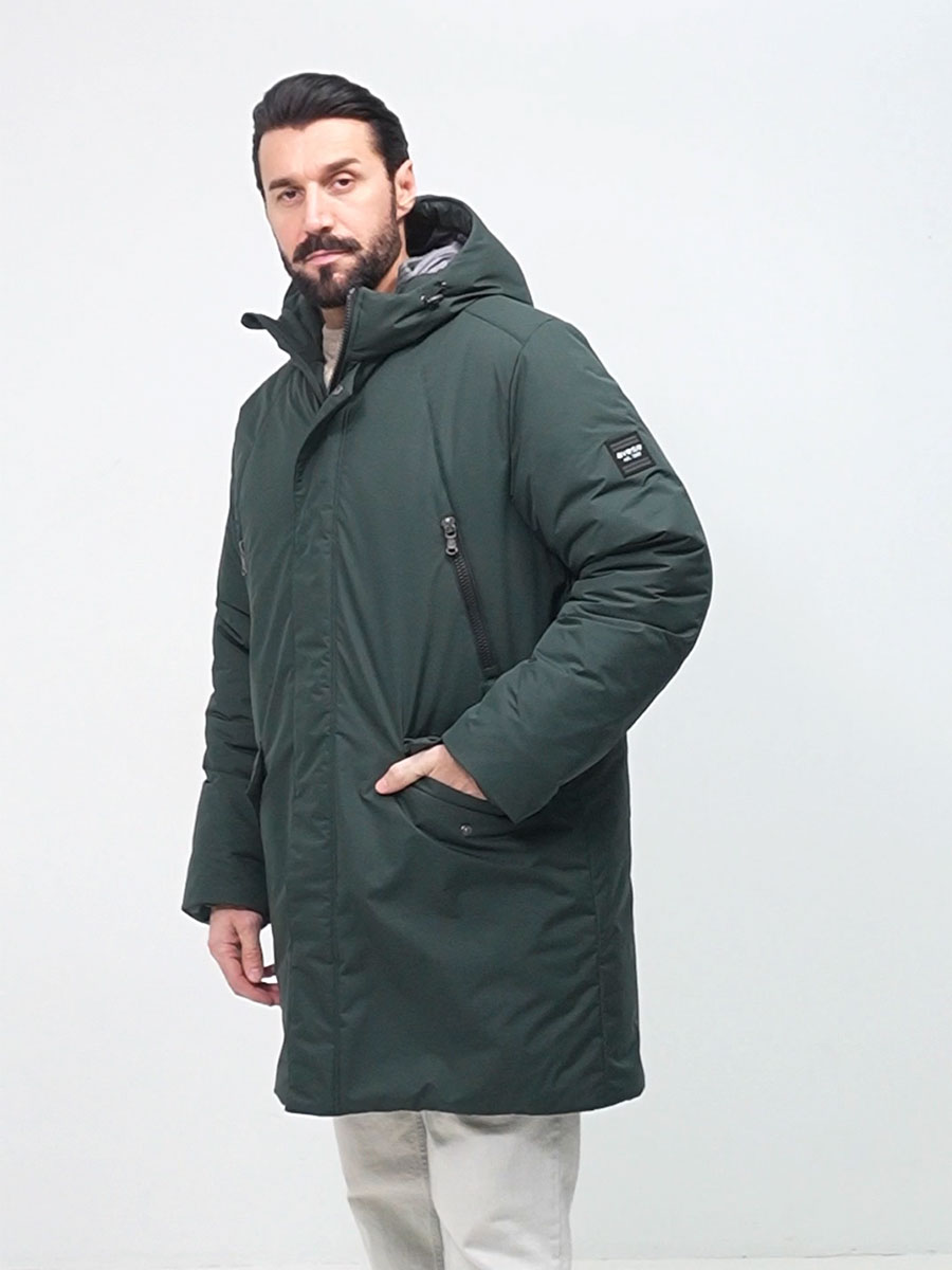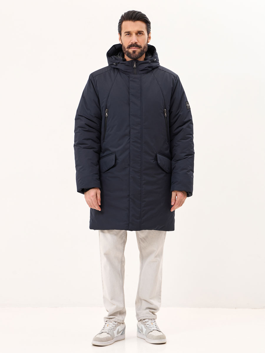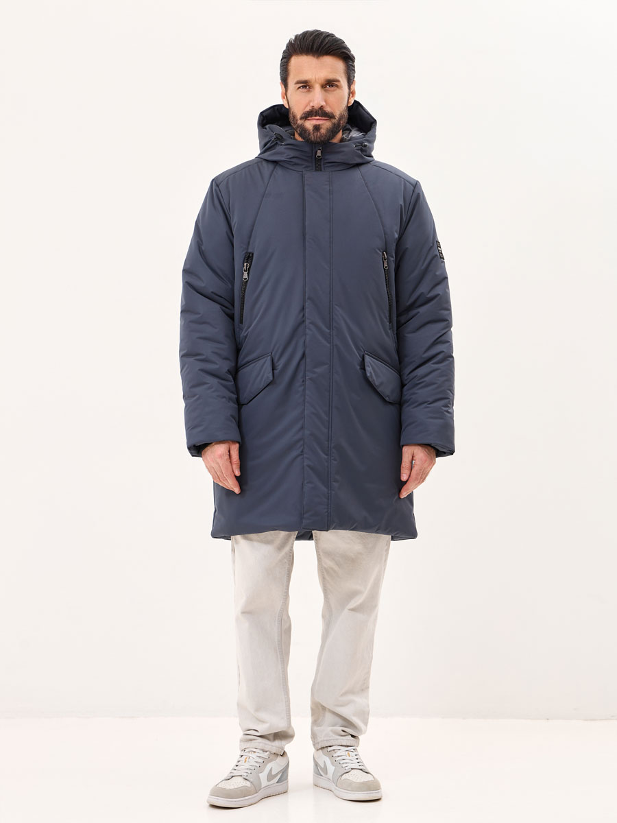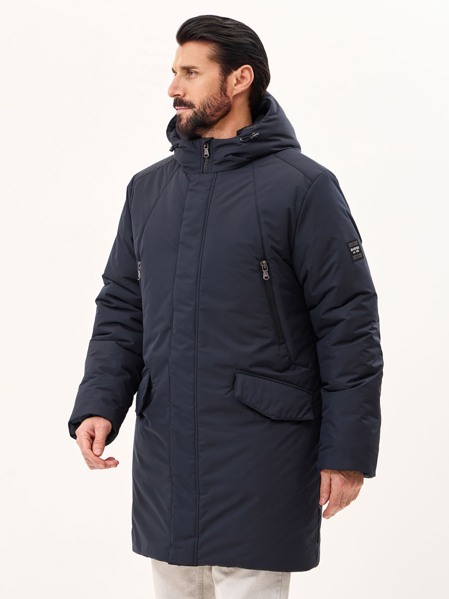 Зимняя удлиненная куртка для мужчин, прямого силуэта, с втачным капюшоном и внутренним воротником из трикотажа. Центральная застёжка на молнию, закрытую планкой на потайных кнопках. 2 нижних кармана с клапаном на кнопке, 2 верхних кармана с молниями. 1 внутренний карман с молнией. По лицевому краю капюшона кулиса с люверсами и резиновым шнуром с фиксаторами для регулировки. На центральной части капюшона хлястик и липучка для регулировки. Низ рукава прямой, с внутренним манжетом из трикотажа.