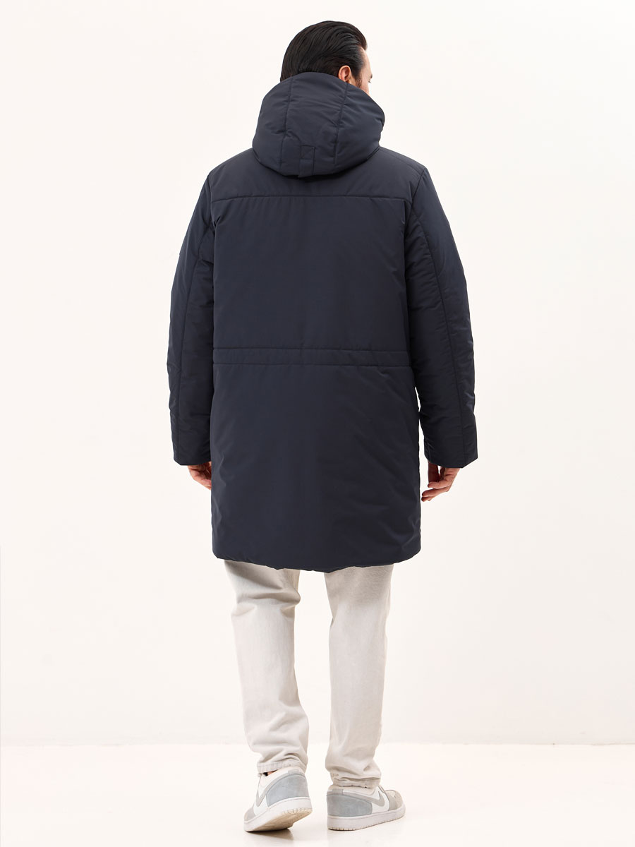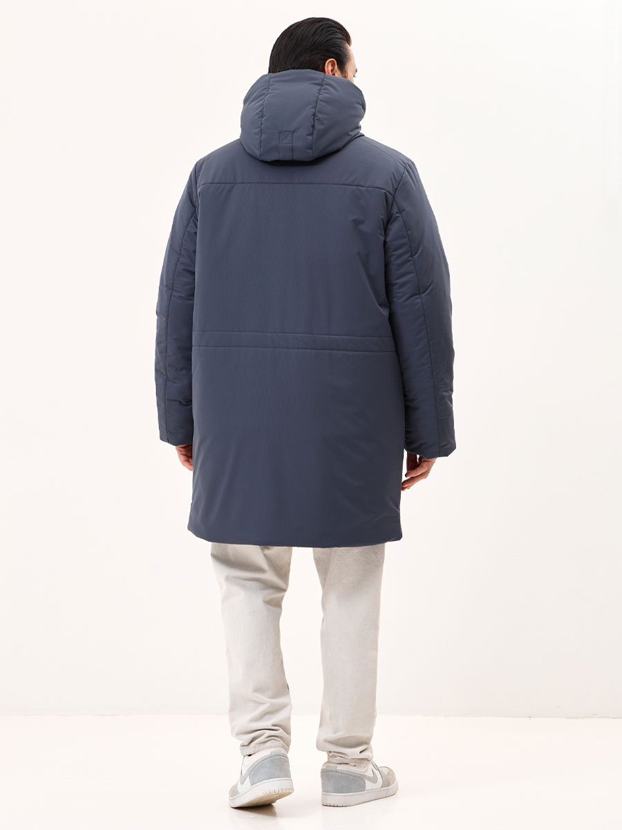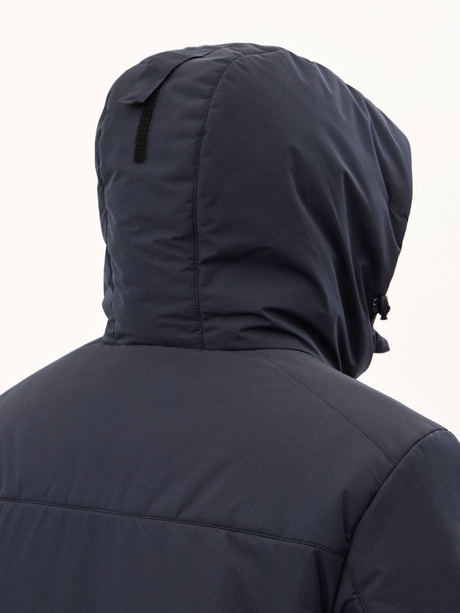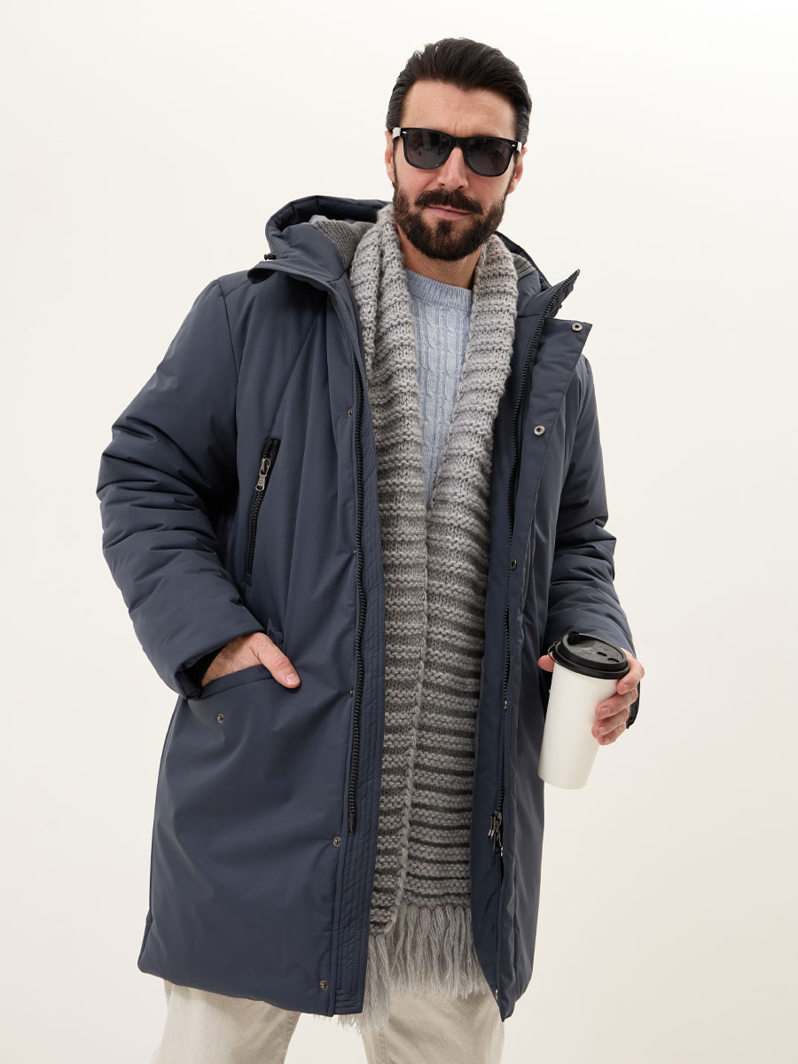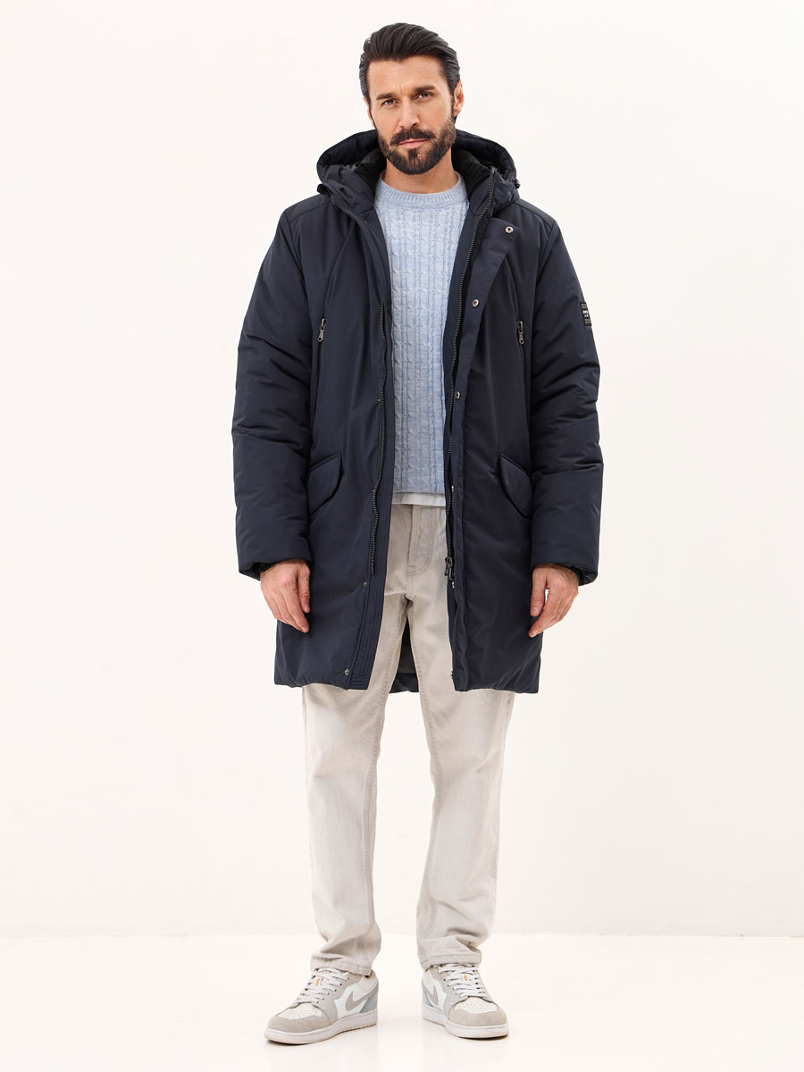 Зимняя удлиненная куртка для мужчин, прямого силуэта, с втачным капюшоном и внутренним воротником из трикотажа. Центральная застёжка на молнию, закрытую планкой на потайных кнопках. 2 нижних кармана с клапаном на кнопке, 2 верхних кармана с молниями. 1 внутренний карман с молнией. По лицевому краю капюшона кулиса с люверсами и резиновым шнуром с фиксаторами для регулировки. На центральной части капюшона хлястик и липучка для регулировки. Низ рукава прямой, с внутренним манжетом из трикотажа.