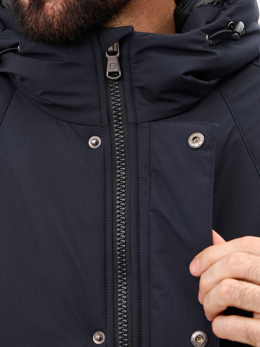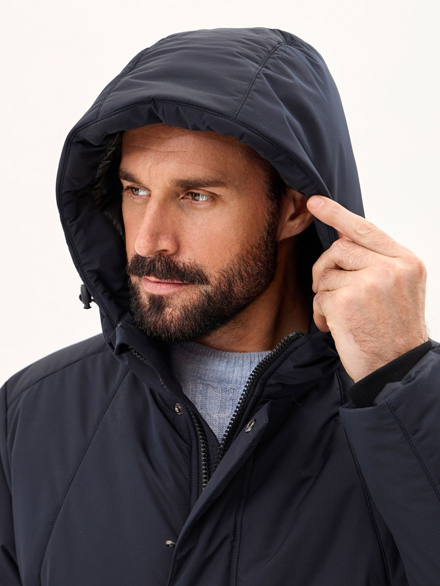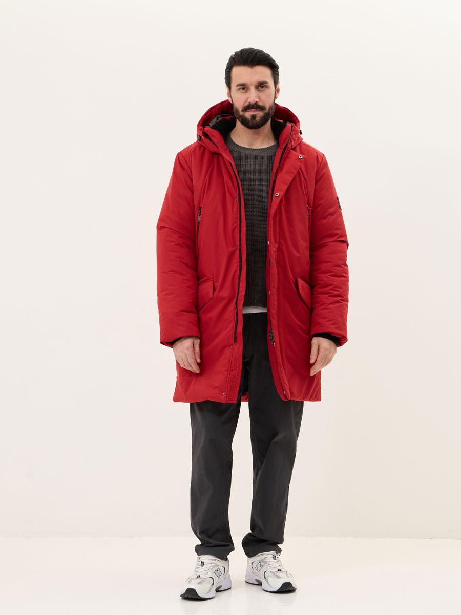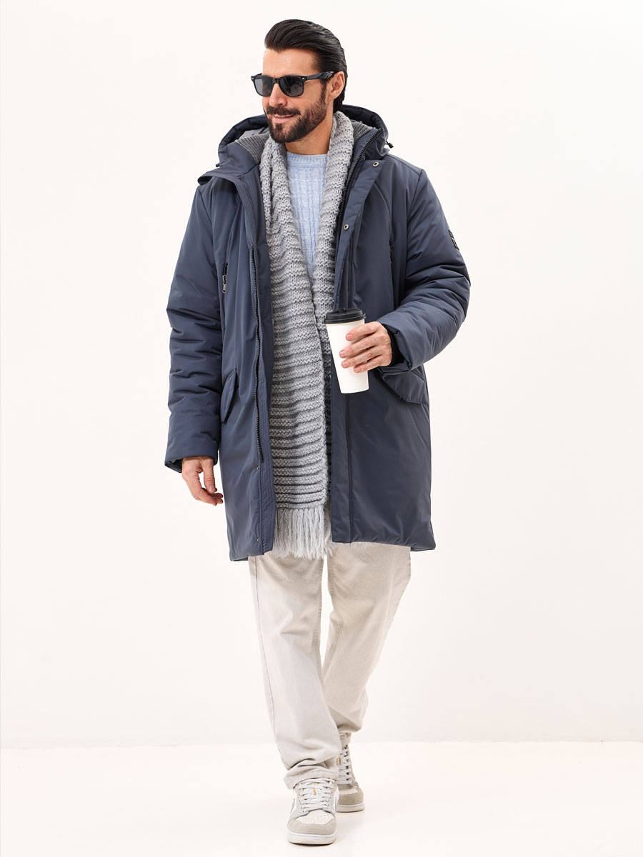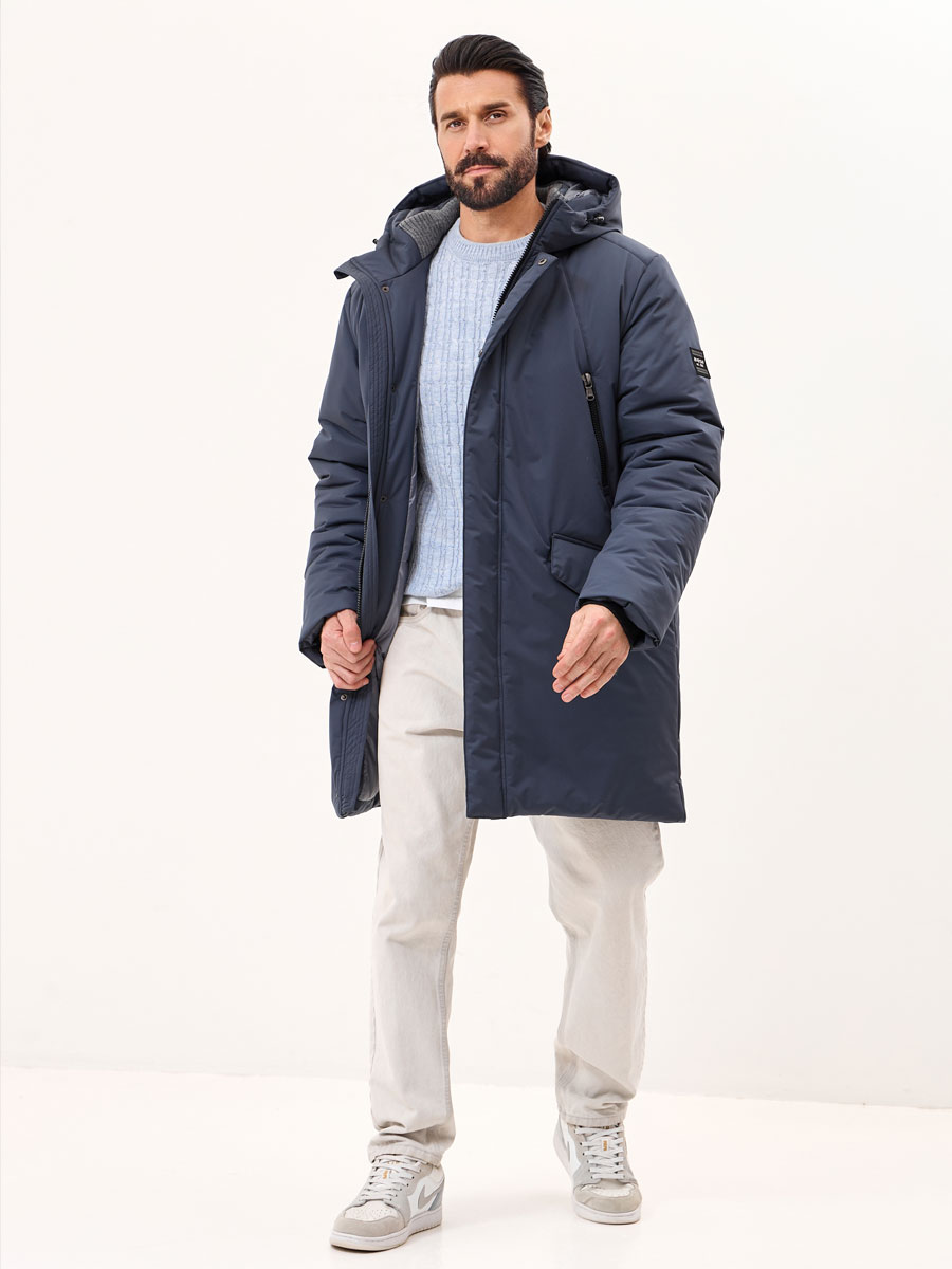 Зимняя удлиненная куртка для мужчин, прямого силуэта, с втачным капюшоном и внутренним воротником из трикотажа. Центральная застёжка на молнию, закрытую планкой на потайных кнопках. 2 нижних кармана с клапаном на кнопке, 2 верхних кармана с молниями. 1 внутренний карман с молнией. По лицевому краю капюшона кулиса с люверсами и резиновым шнуром с фиксаторами для регулировки. На центральной части капюшона хлястик и липучка для регулировки. Низ рукава прямой, с внутренним манжетом из трикотажа.