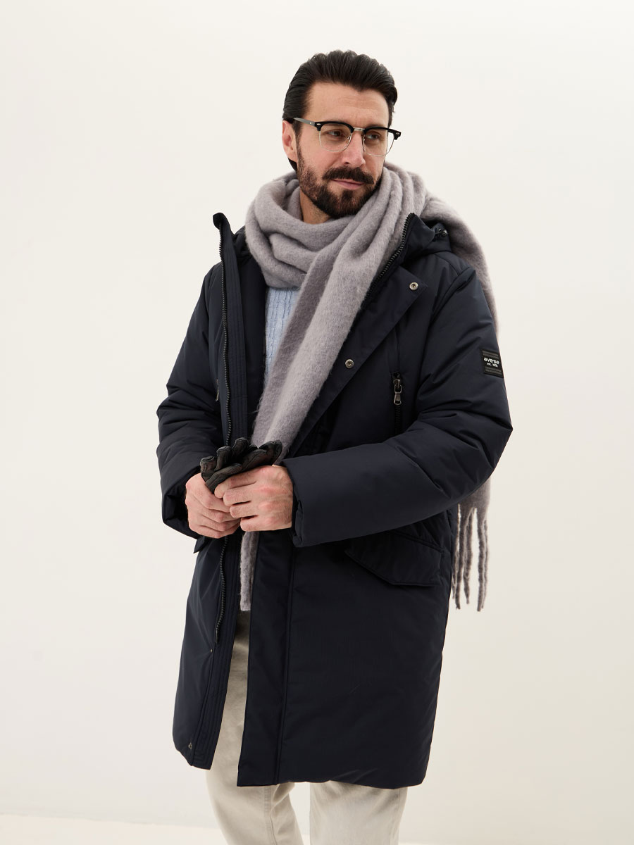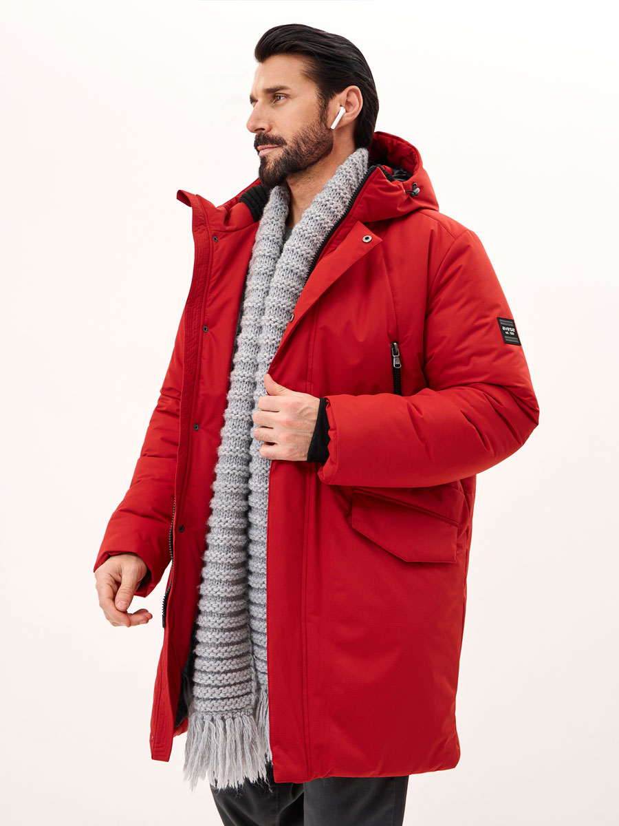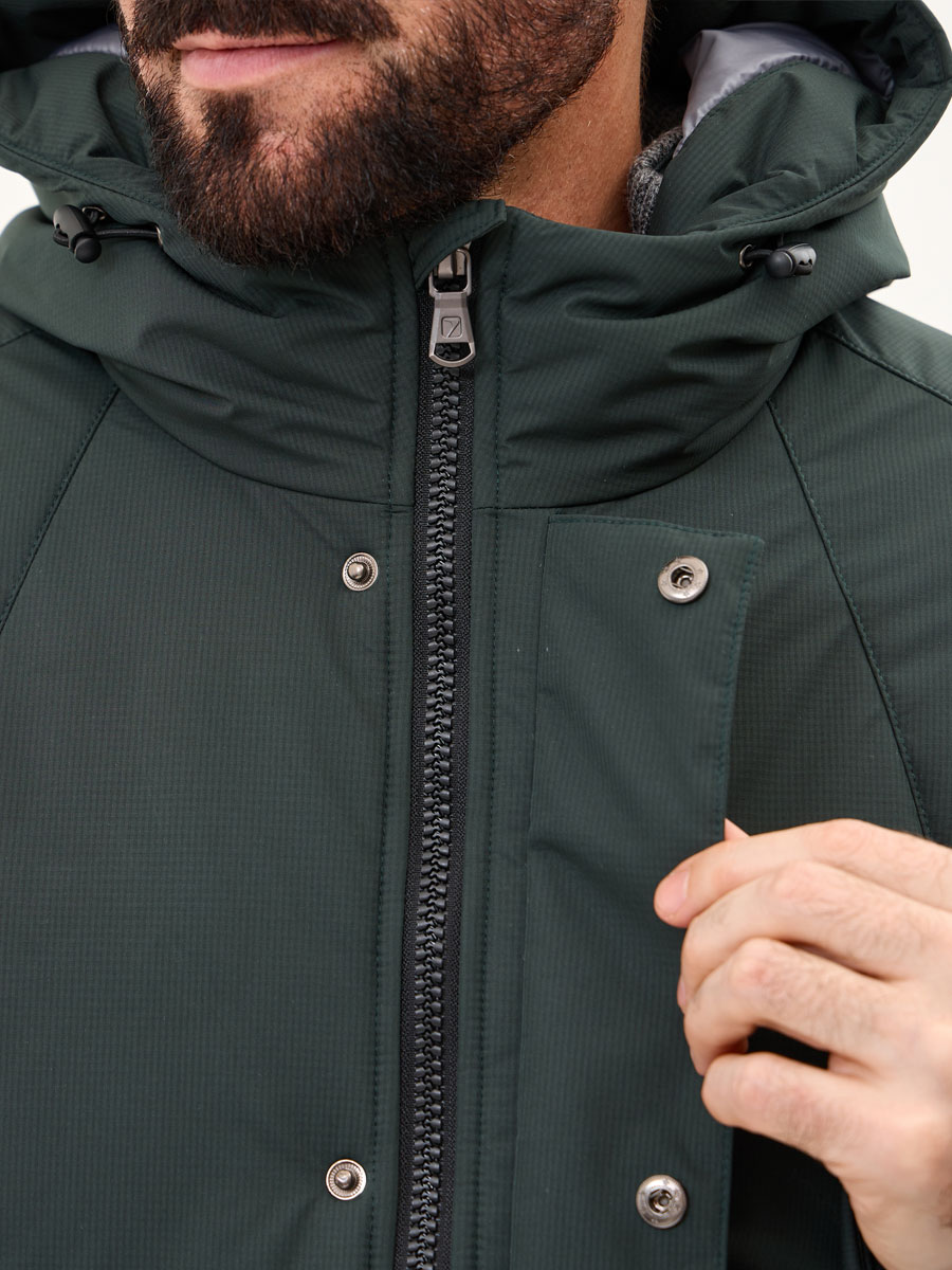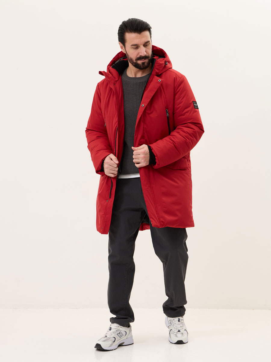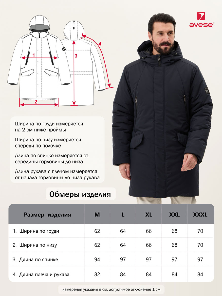 Зимняя удлиненная куртка для мужчин, прямого силуэта, с втачным капюшоном и внутренним воротником из трикотажа. Центральная застёжка на молнию, закрытую планкой на потайных кнопках. 2 нижних кармана с клапаном на кнопке, 2 верхних кармана с молниями. 1 внутренний карман с молнией. По лицевому краю капюшона кулиса с люверсами и резиновым шнуром с фиксаторами для регулировки. На центральной части капюшона хлястик и липучка для регулировки. Низ рукава прямой, с внутренним манжетом из трикотажа.