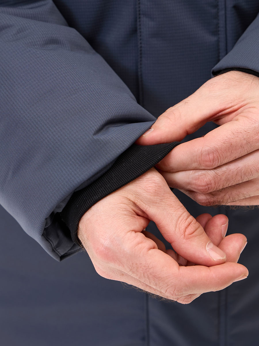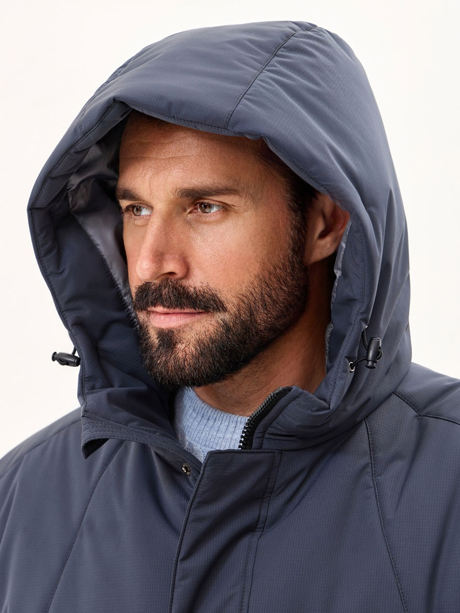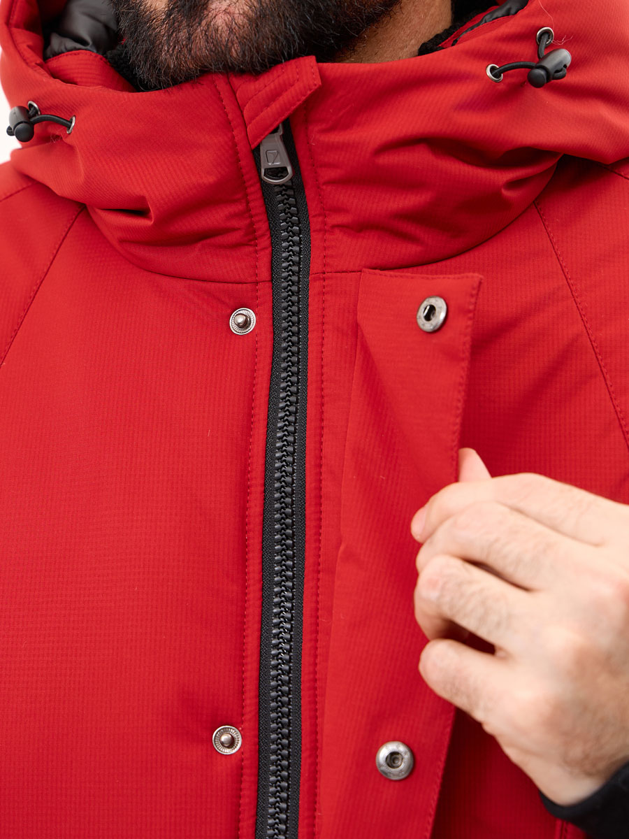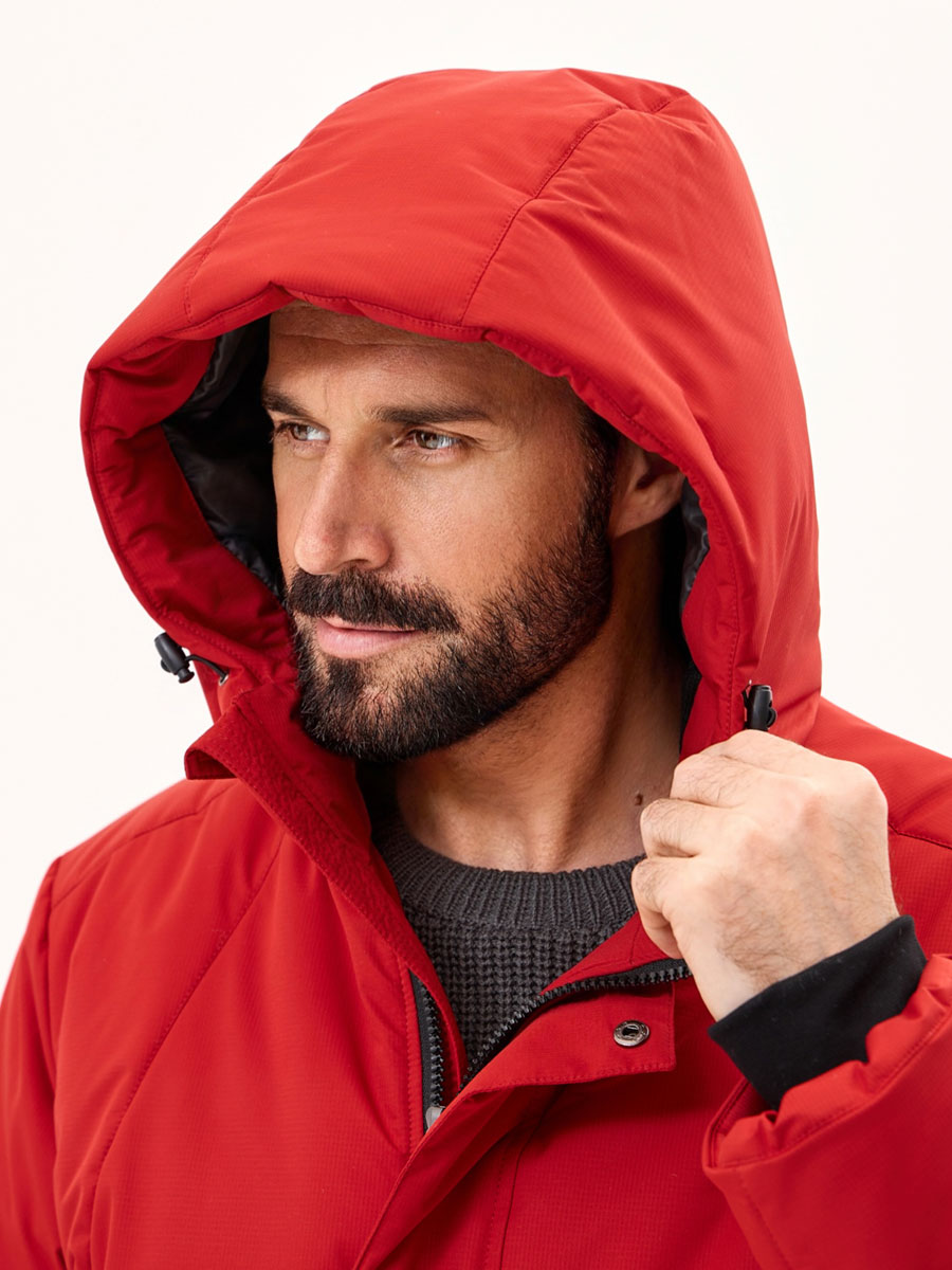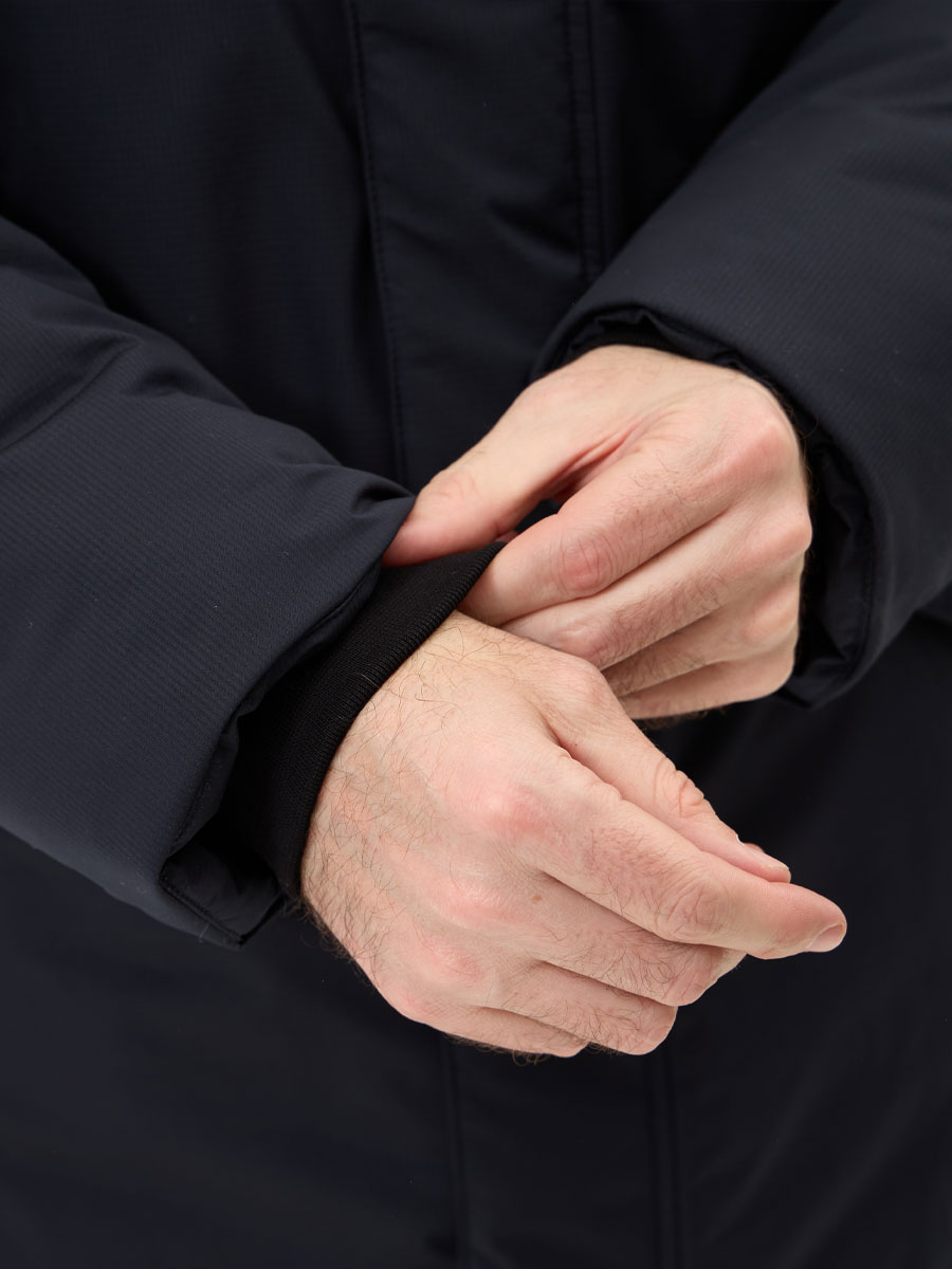 Зимняя удлиненная куртка для мужчин, прямого силуэта, с втачным капюшоном и внутренним воротником из трикотажа. Центральная застёжка на молнию, закрытую планкой на потайных кнопках. 2 нижних кармана с клапаном на кнопке, 2 верхних кармана с молниями. 1 внутренний карман с молнией. По лицевому краю капюшона кулиса с люверсами и резиновым шнуром с фиксаторами для регулировки. На центральной части капюшона хлястик и липучка для регулировки. Низ рукава прямой, с внутренним манжетом из трикотажа.
