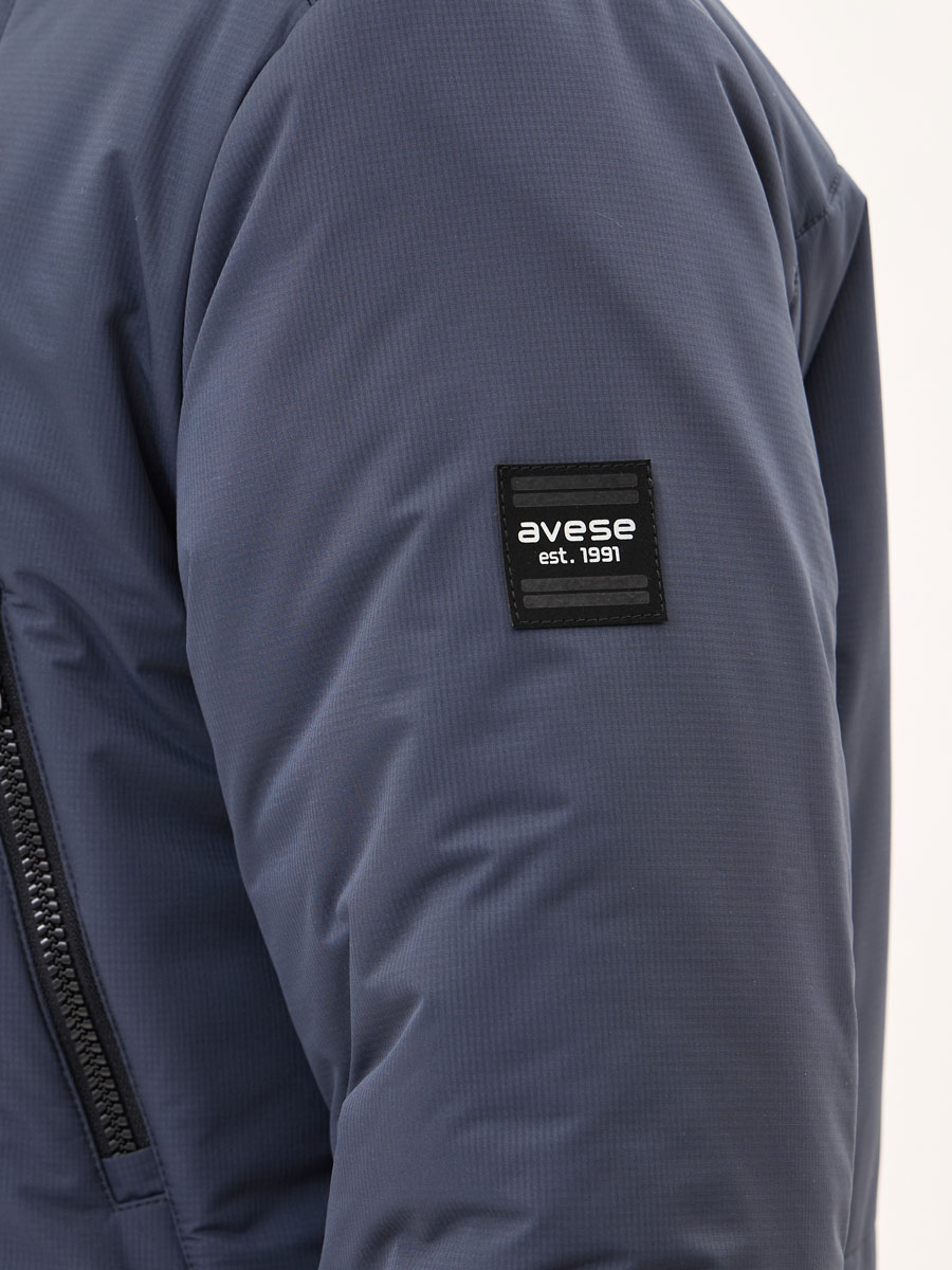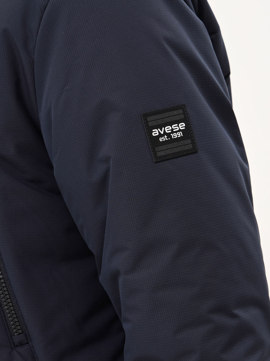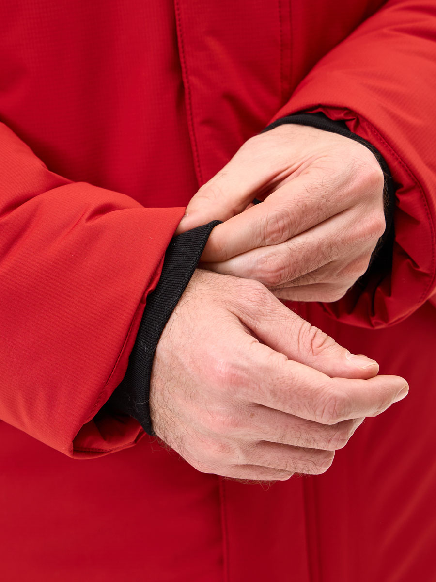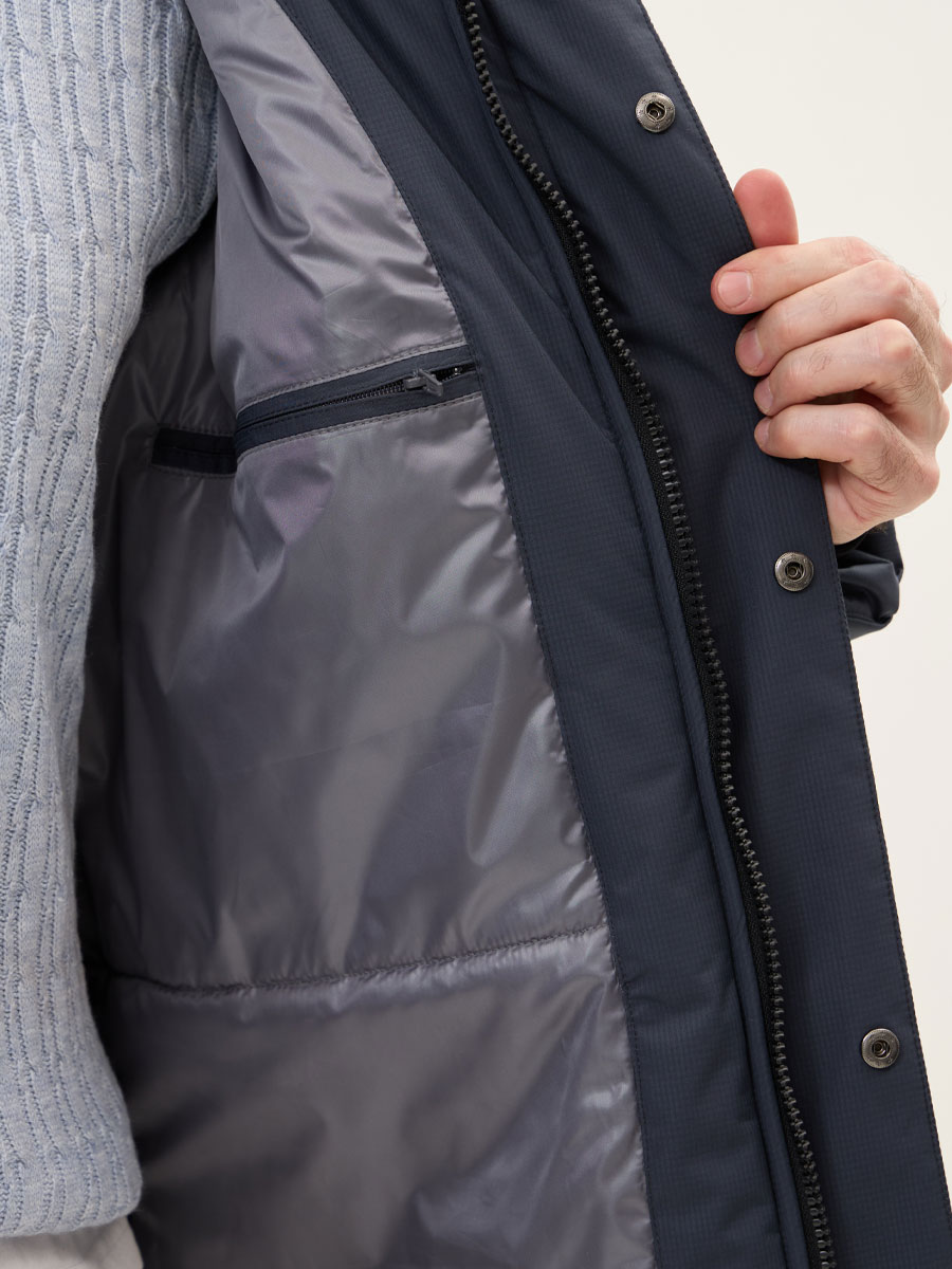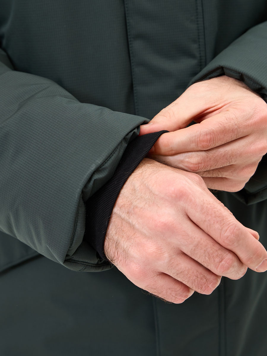 Зимняя удлиненная куртка для мужчин, прямого силуэта, с втачным капюшоном и внутренним воротником из трикотажа. Центральная застёжка на молнию, закрытую планкой на потайных кнопках. 2 нижних кармана с клапаном на кнопке, 2 верхних кармана с молниями. 1 внутренний карман с молнией. По лицевому краю капюшона кулиса с люверсами и резиновым шнуром с фиксаторами для регулировки. На центральной части капюшона хлястик и липучка для регулировки. Низ рукава прямой, с внутренним манжетом из трикотажа.