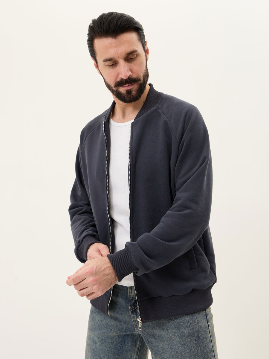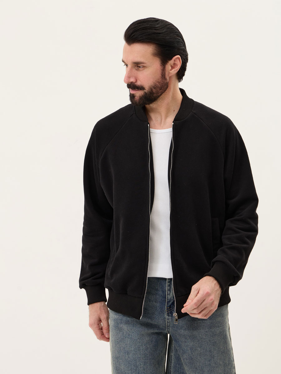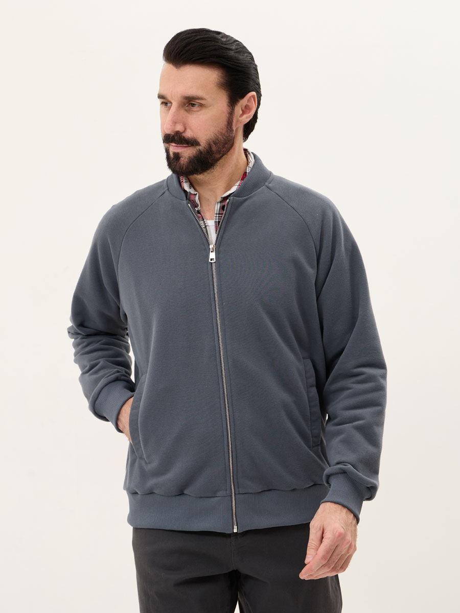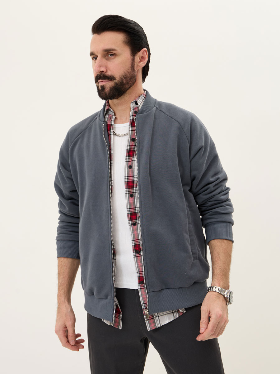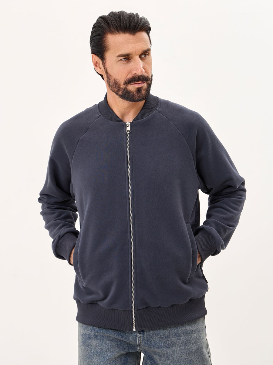 Мужской бомбер на молнии, с рукавом покроя реглан и втачным воротником-стойкой. На полочке 2 прорезных кармана с листочками. Манжеты, пояс, воротник из кашкорсе. Центральная застежка на разъёмную молнию до воротника.
