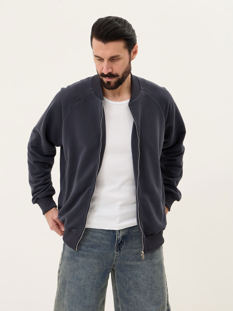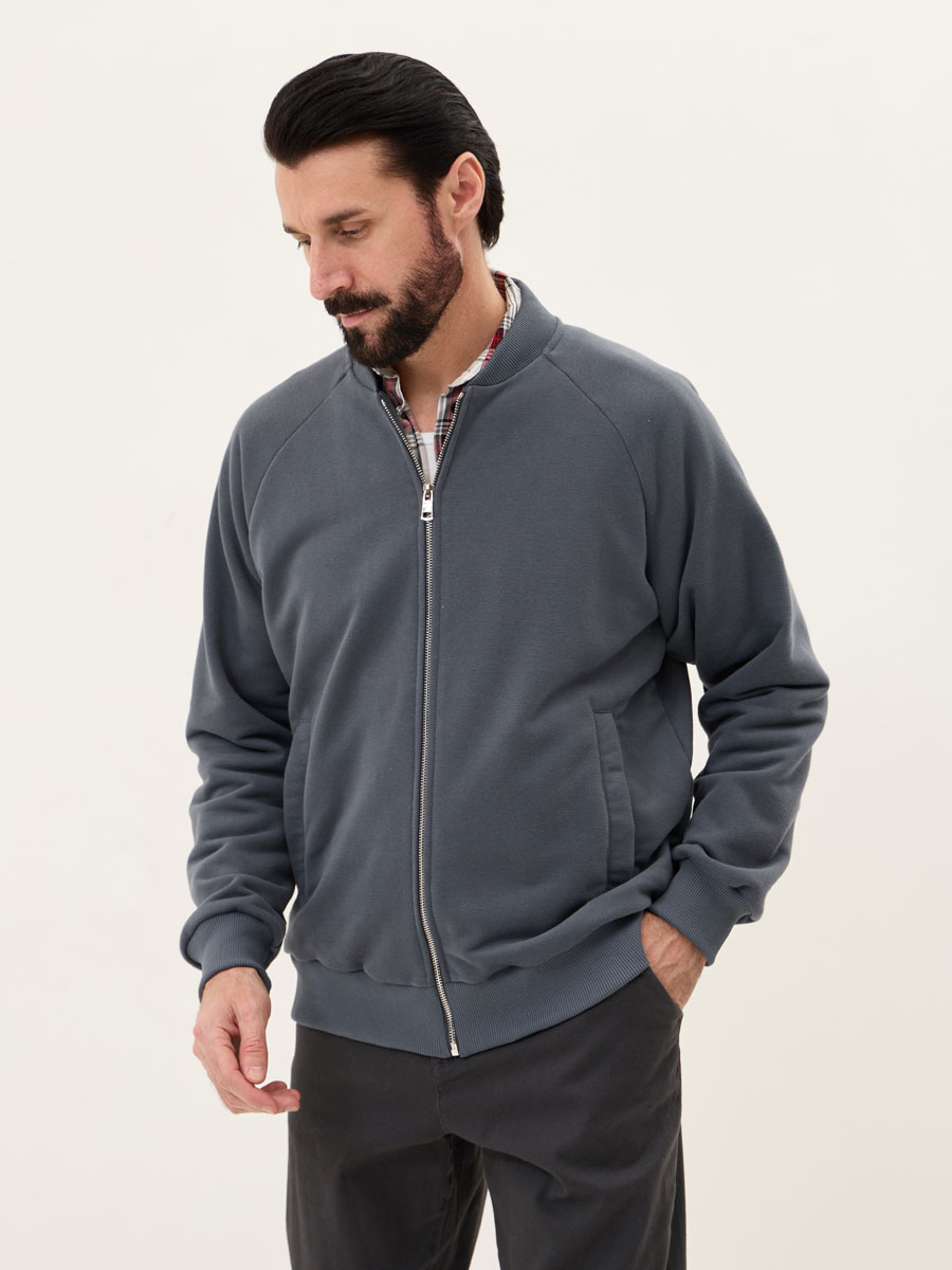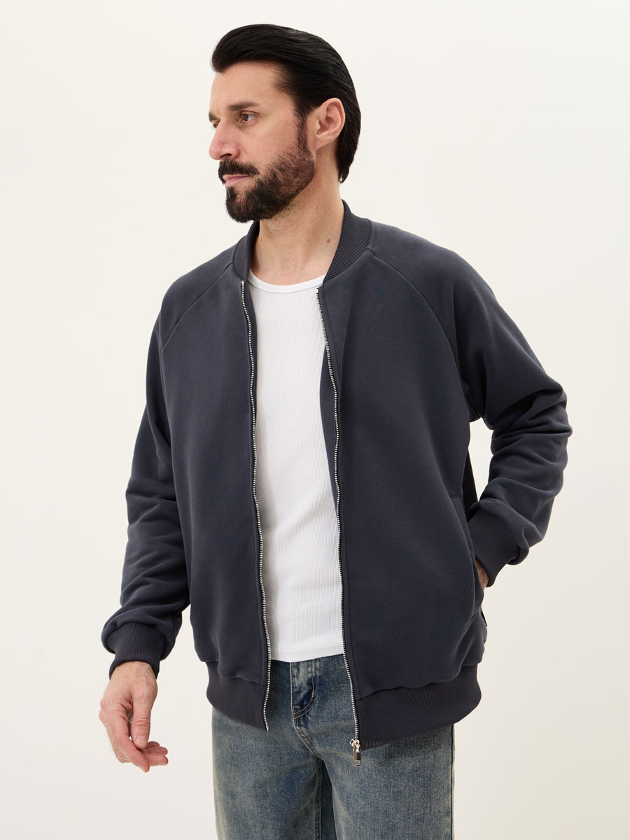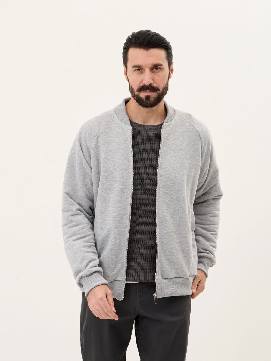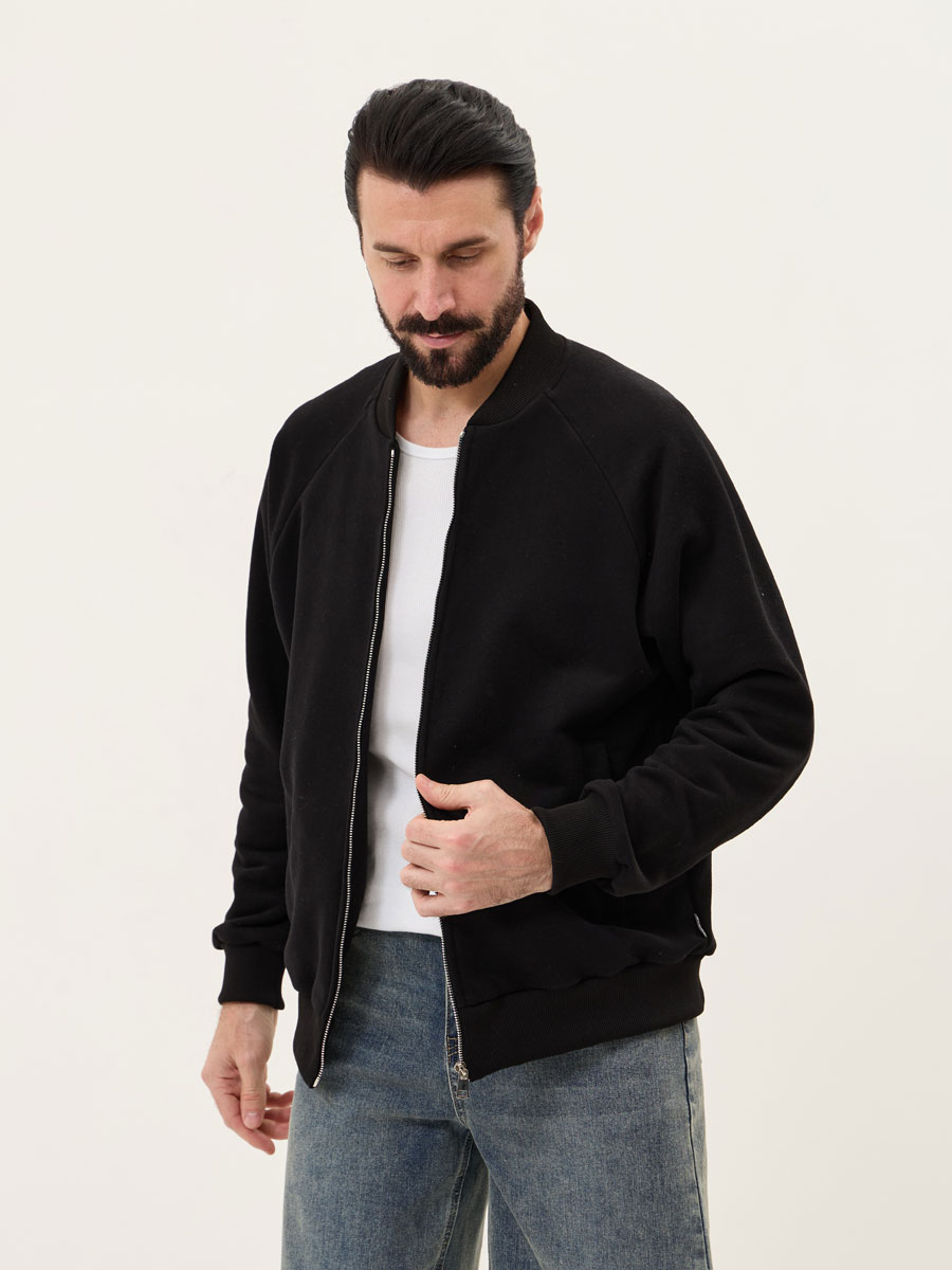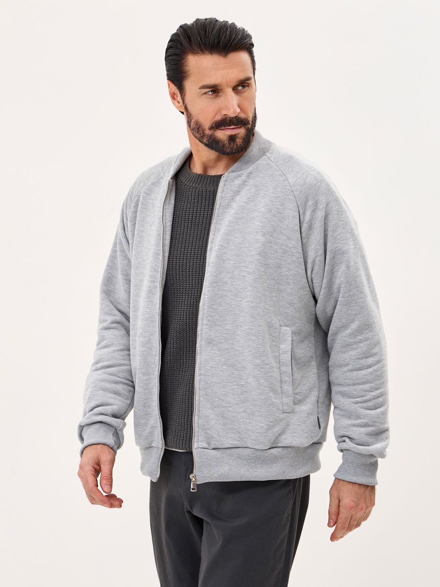 Мужской бомбер на молнии, с рукавом покроя реглан и втачным воротником-стойкой. На полочке 2 прорезных кармана с листочками. Манжеты, пояс, воротник из кашкорсе. Центральная застежка на разъёмную молнию до воротника.