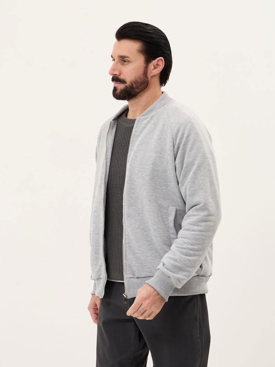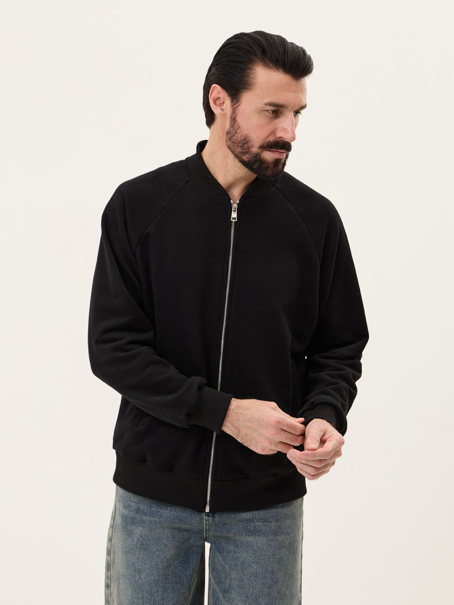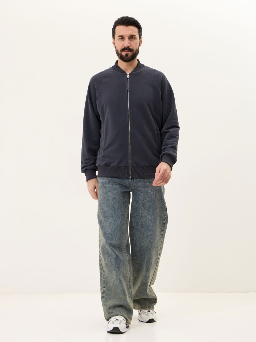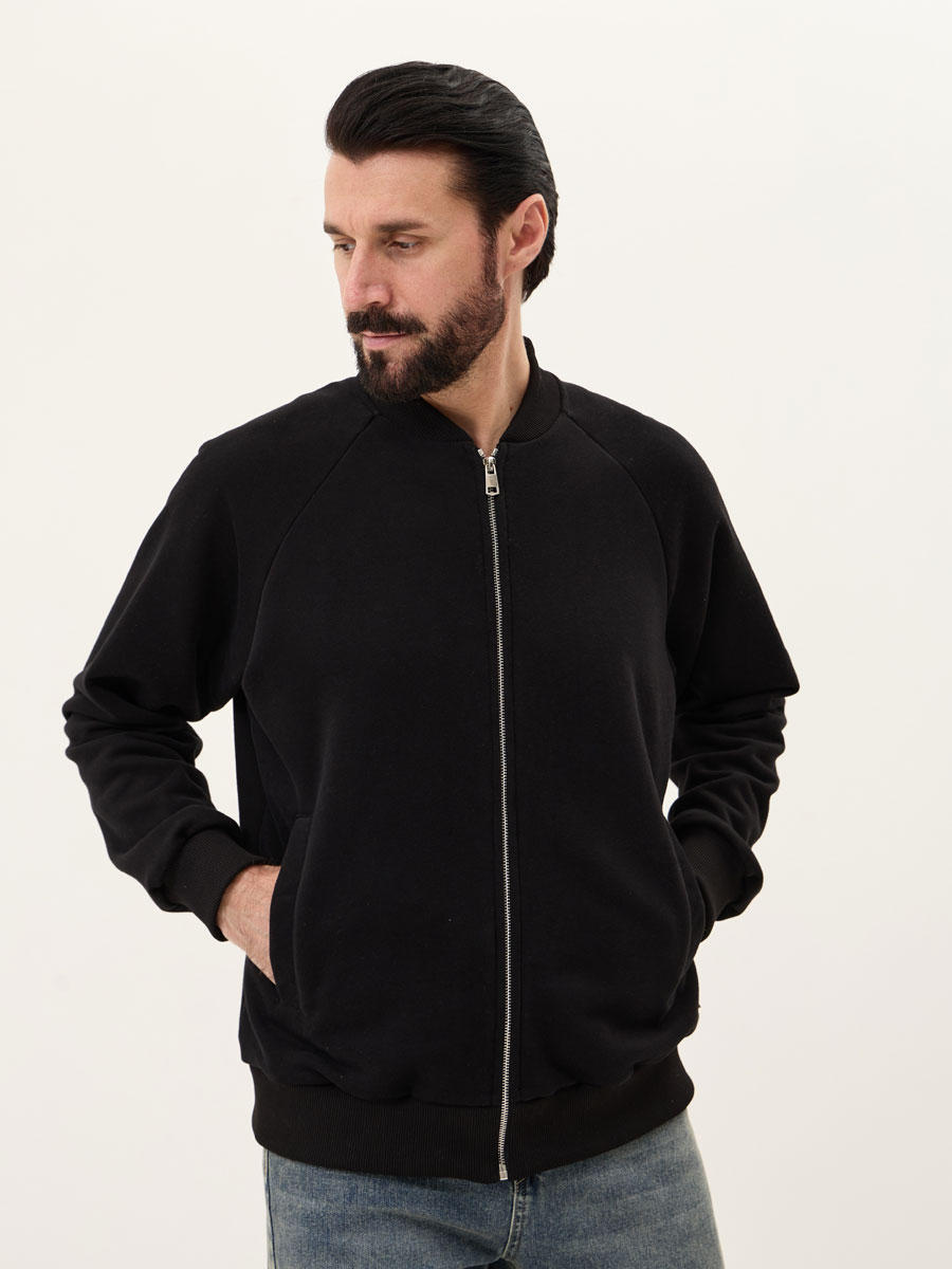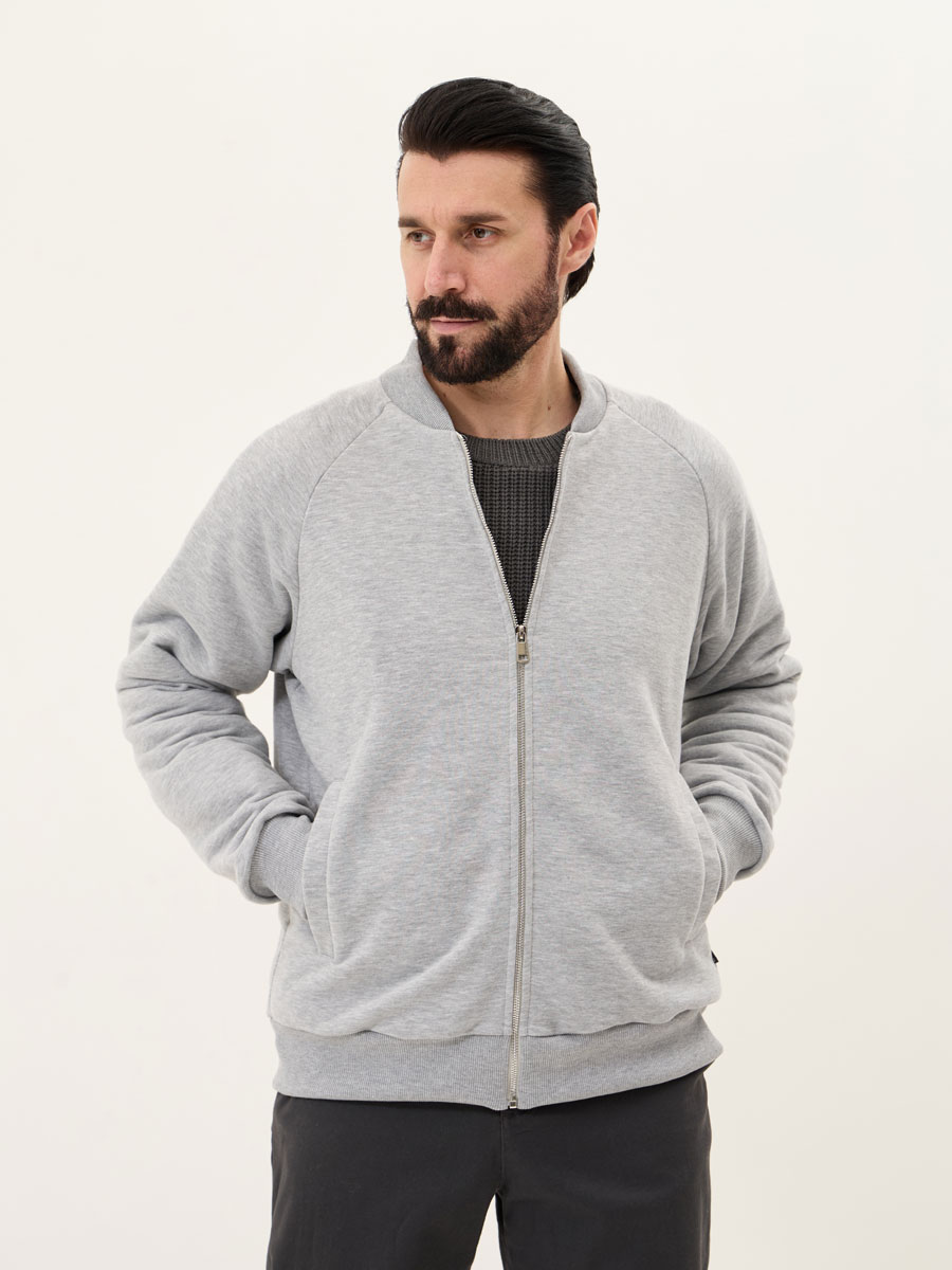 Мужской бомбер на молнии, с рукавом покроя реглан и втачным воротником-стойкой. На полочке 2 прорезных кармана с листочками. Манжеты, пояс, воротник из кашкорсе. Центральная застежка на разъёмную молнию до воротника.