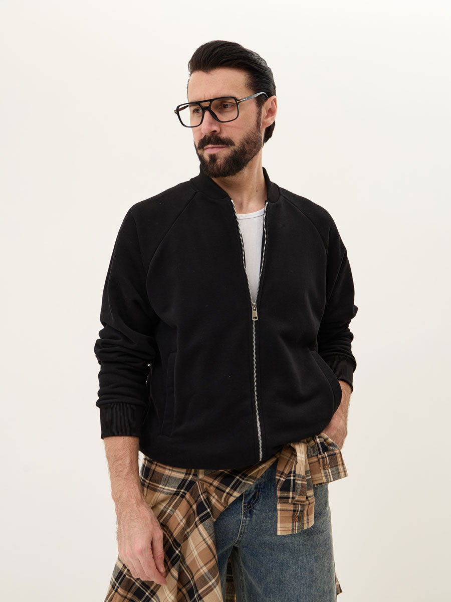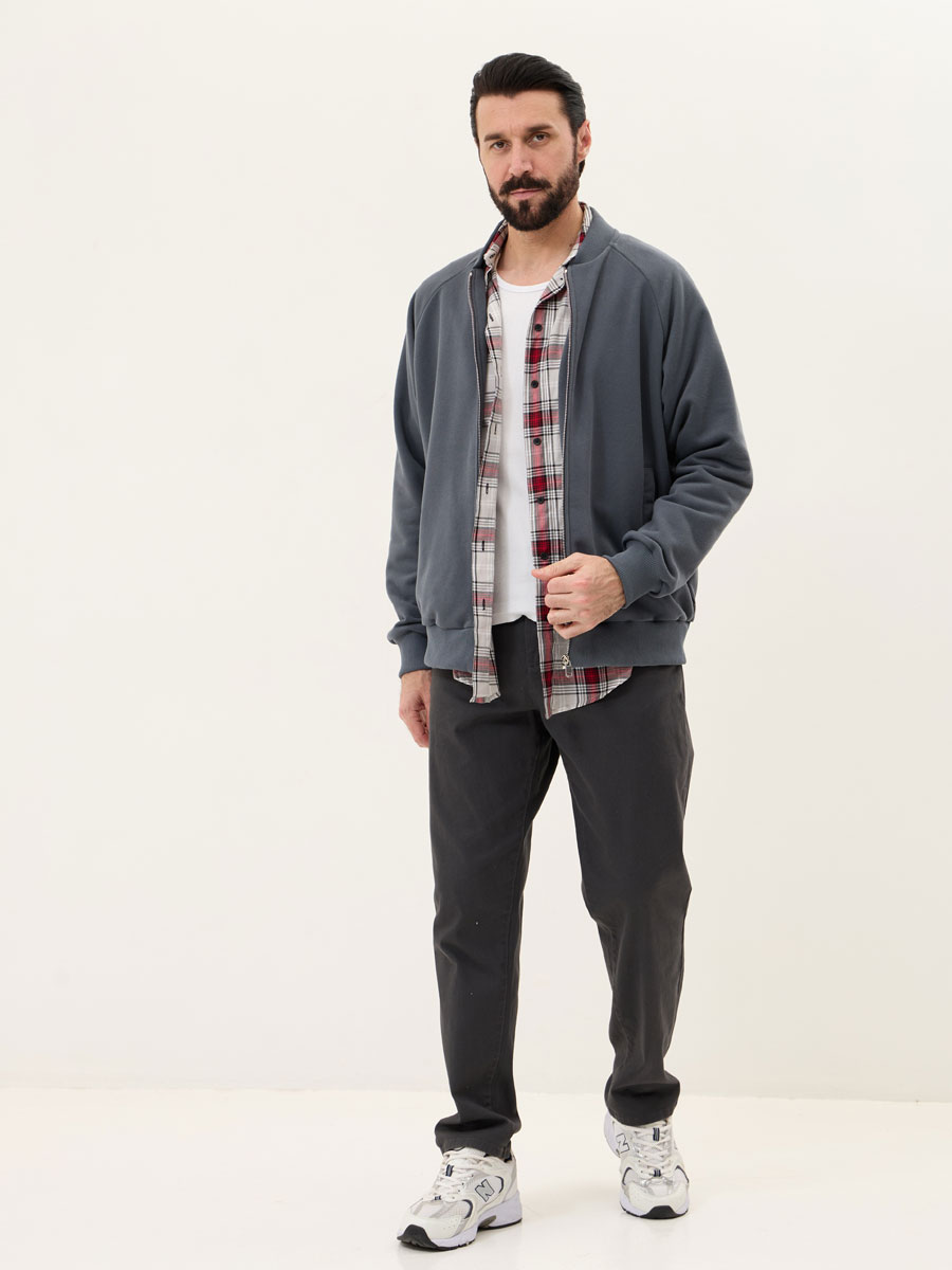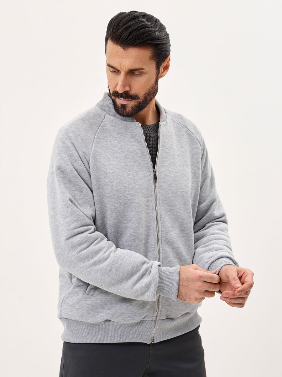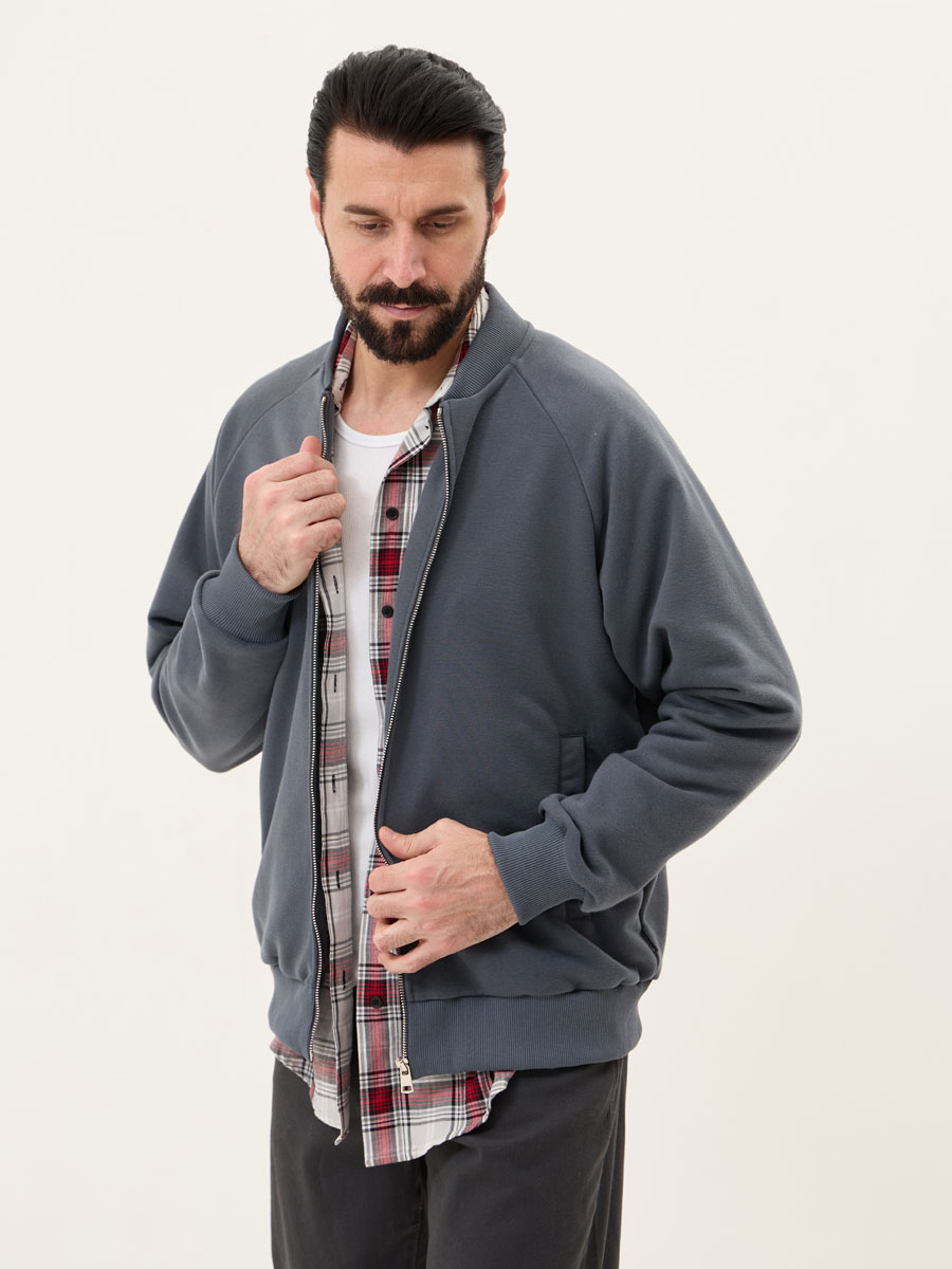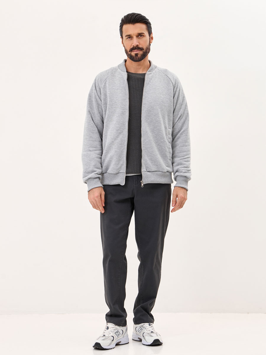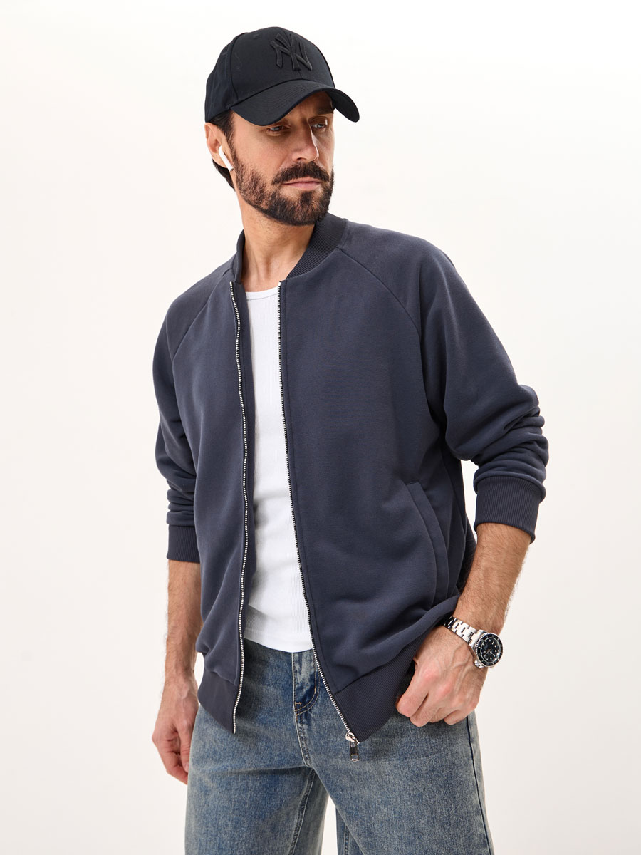 Мужской бомбер на молнии, с рукавом покроя реглан и втачным воротником-стойкой. На полочке 2 прорезных кармана с листочками. Манжеты, пояс, воротник из кашкорсе. Центральная застежка на разъёмную молнию до воротника.