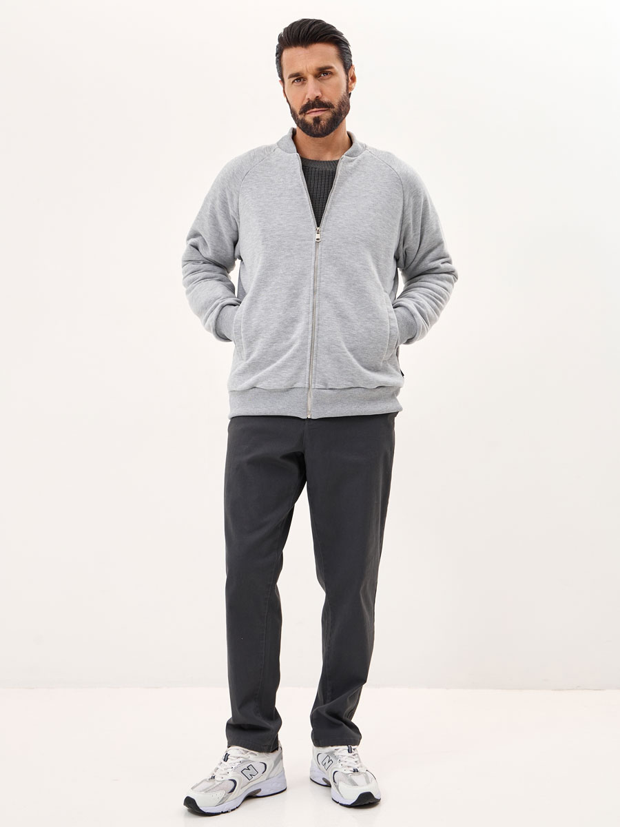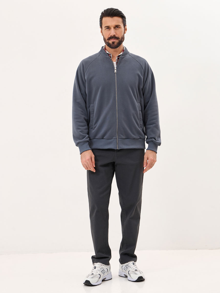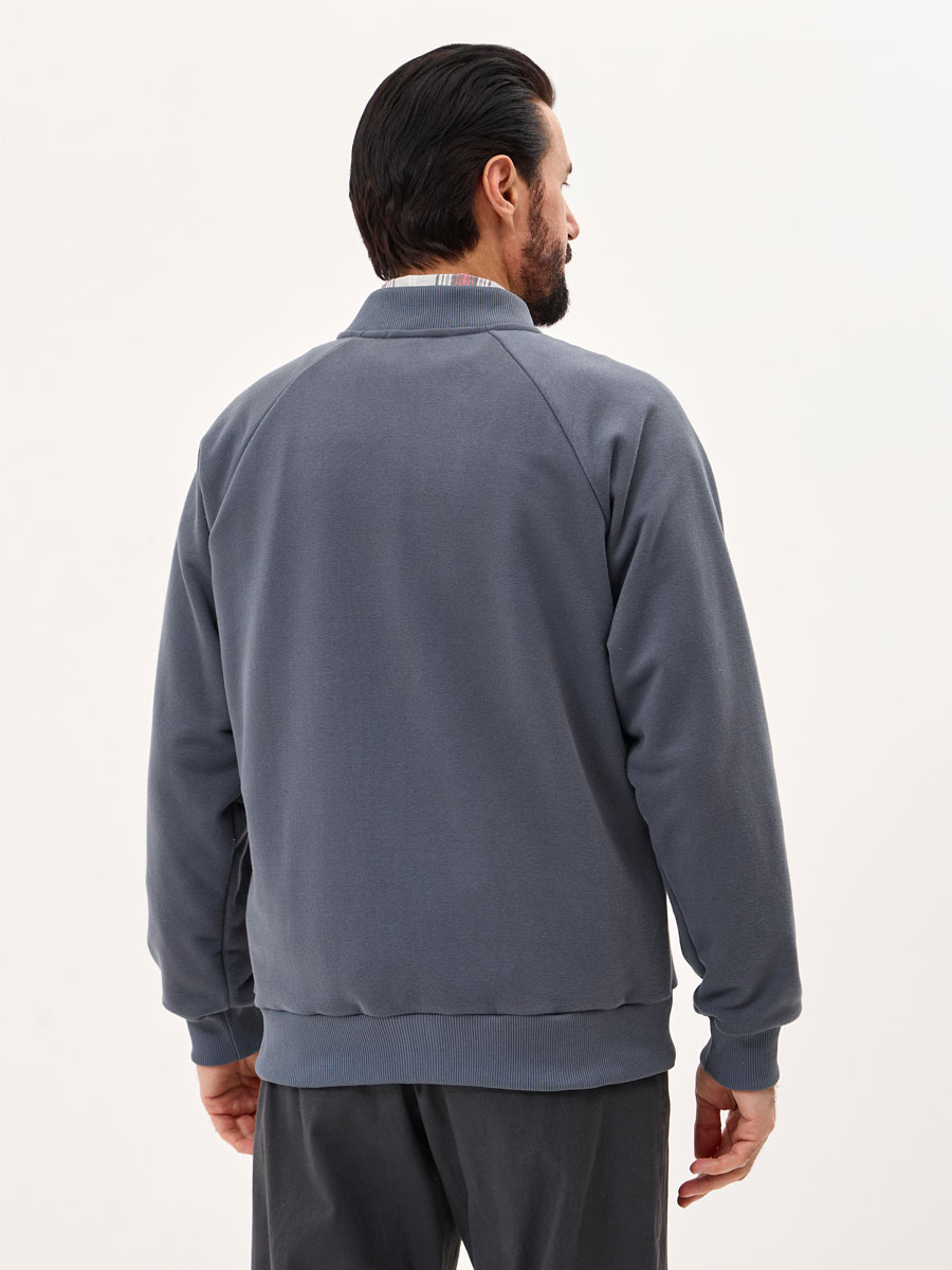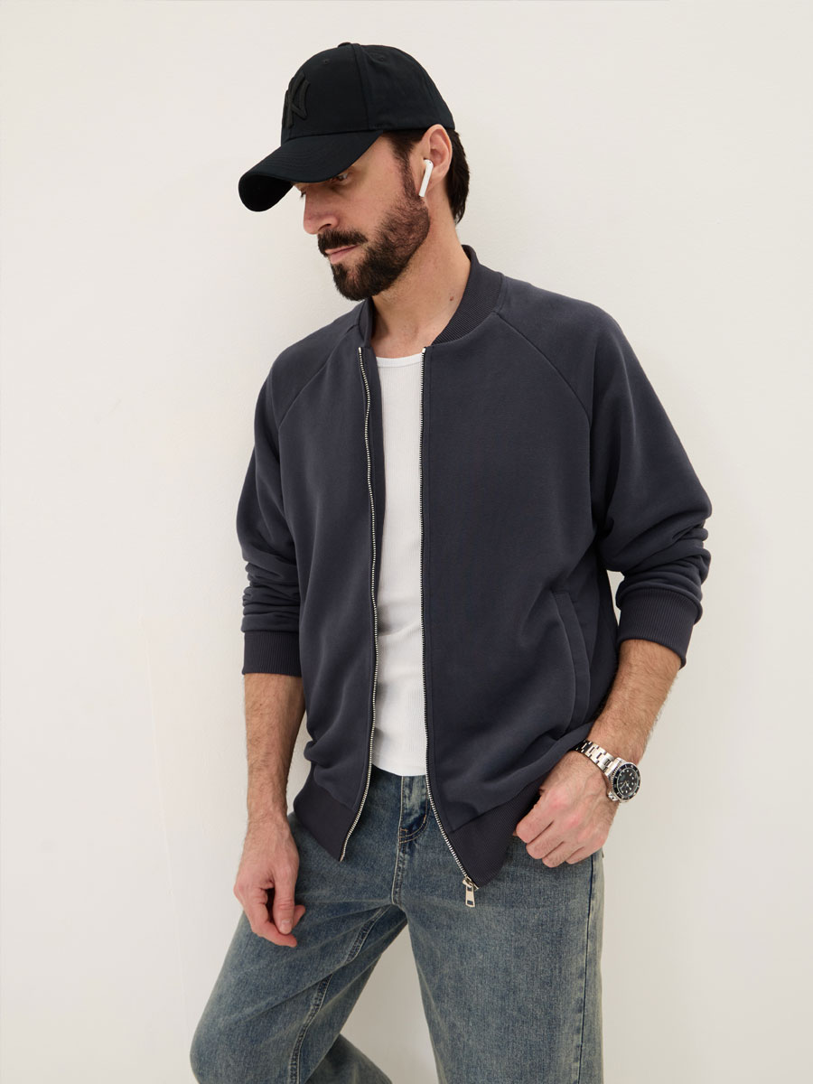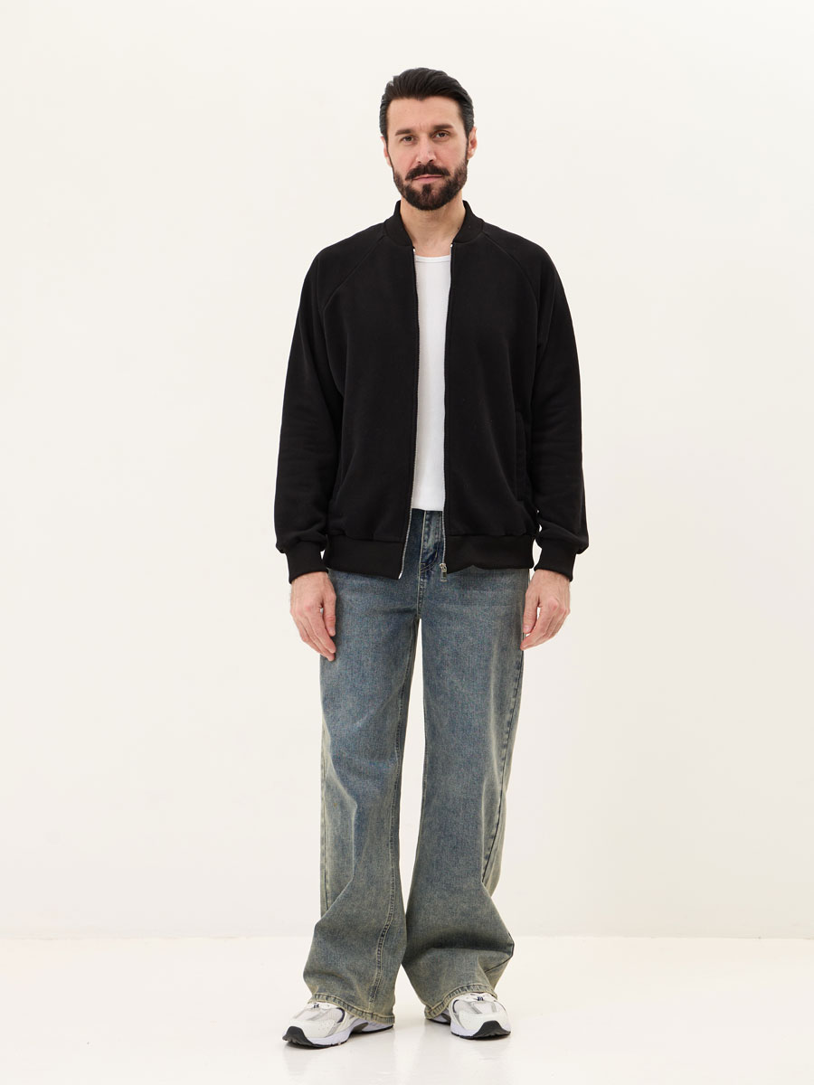 Мужской бомбер на молнии, с рукавом покроя реглан и втачным воротником-стойкой. На полочке 2 прорезных кармана с листочками. Манжеты, пояс, воротник из кашкорсе. Центральная застежка на разъёмную молнию до воротника.