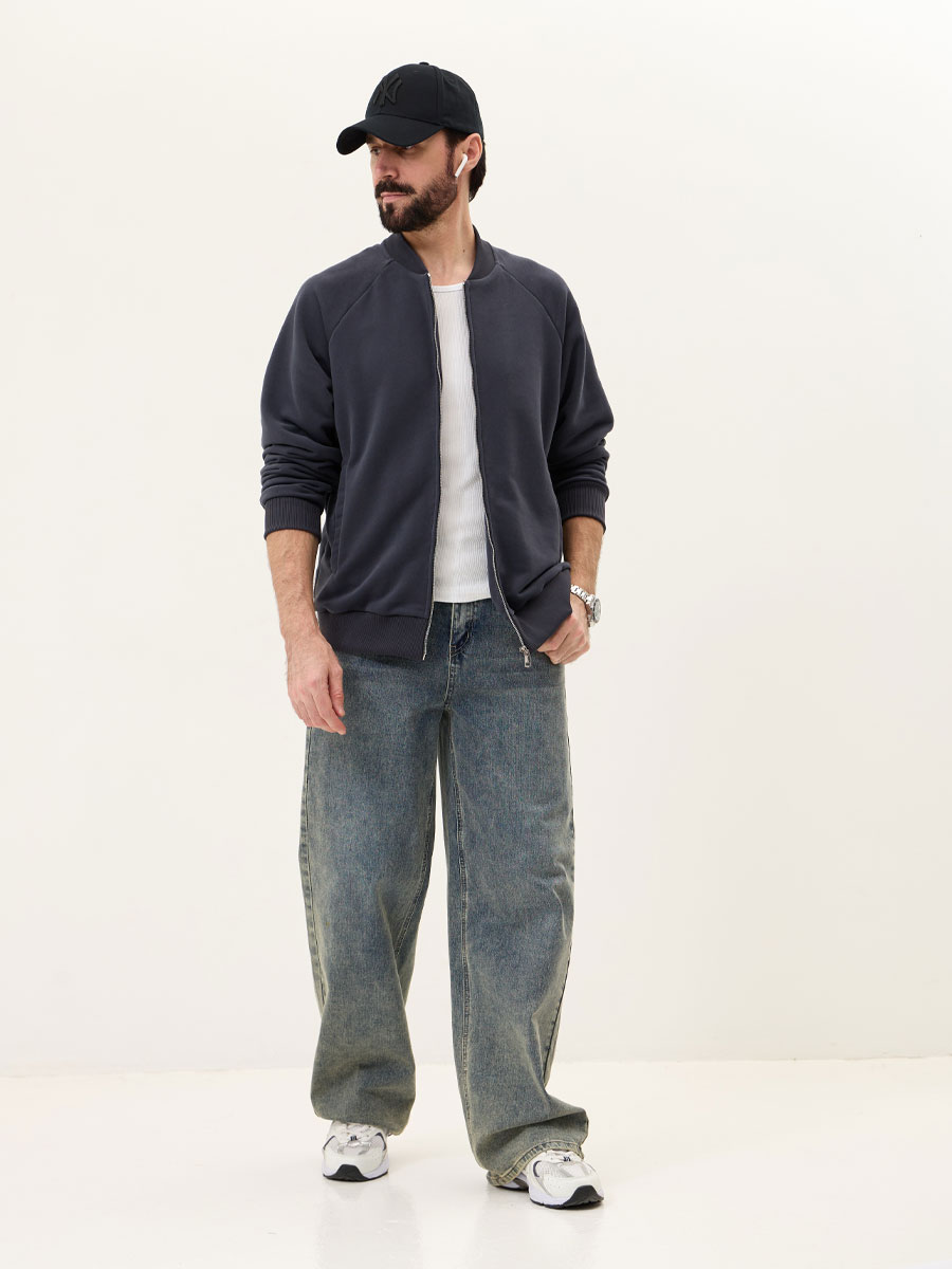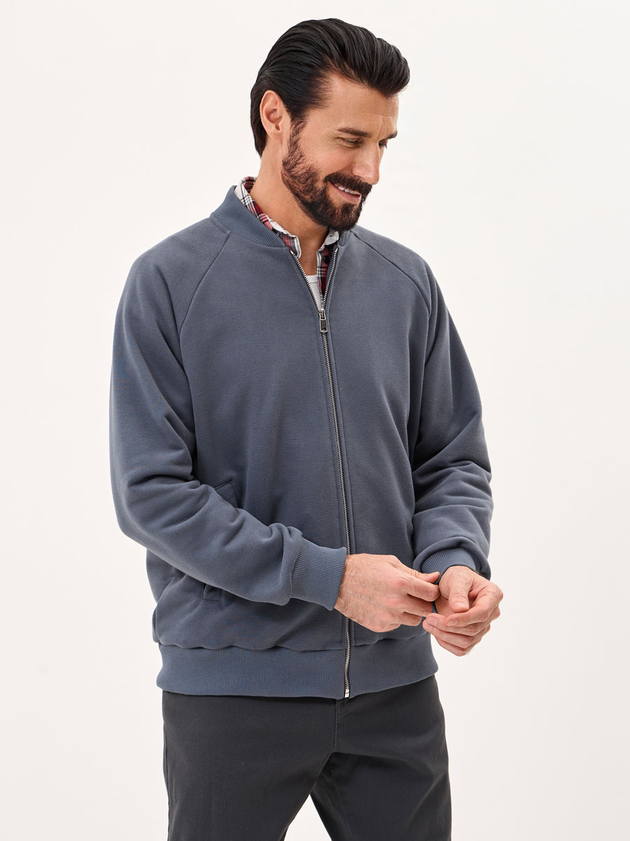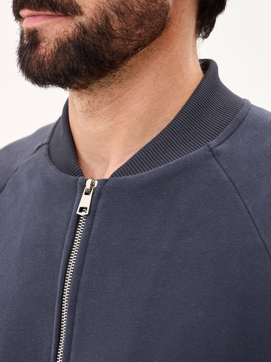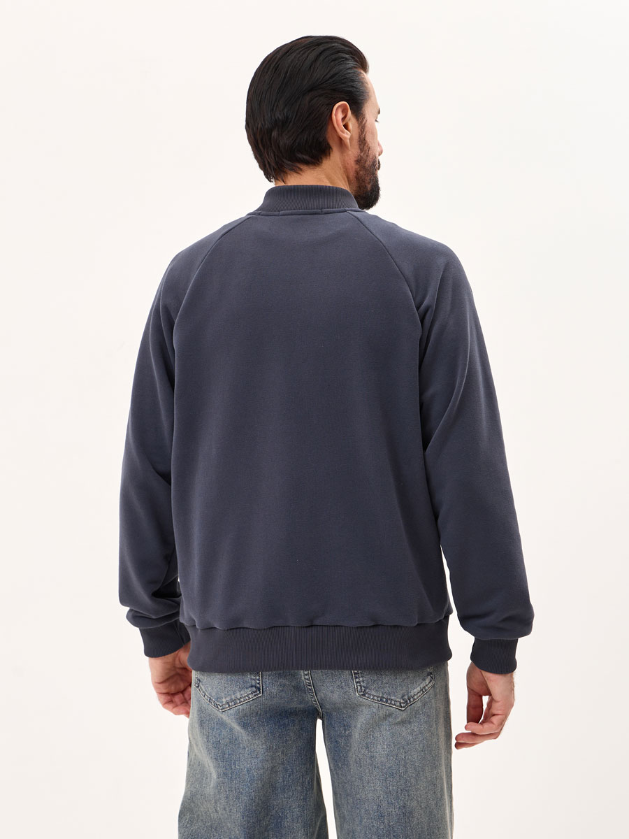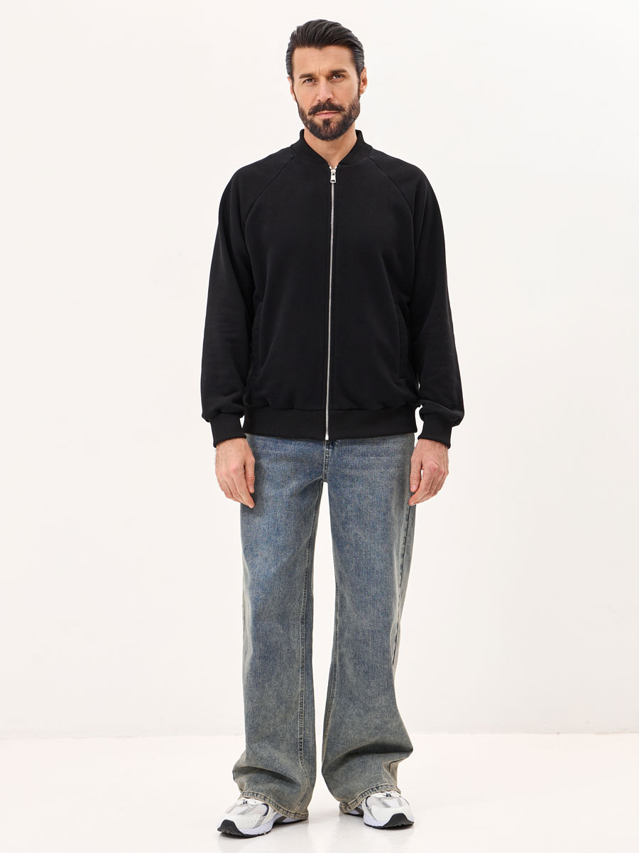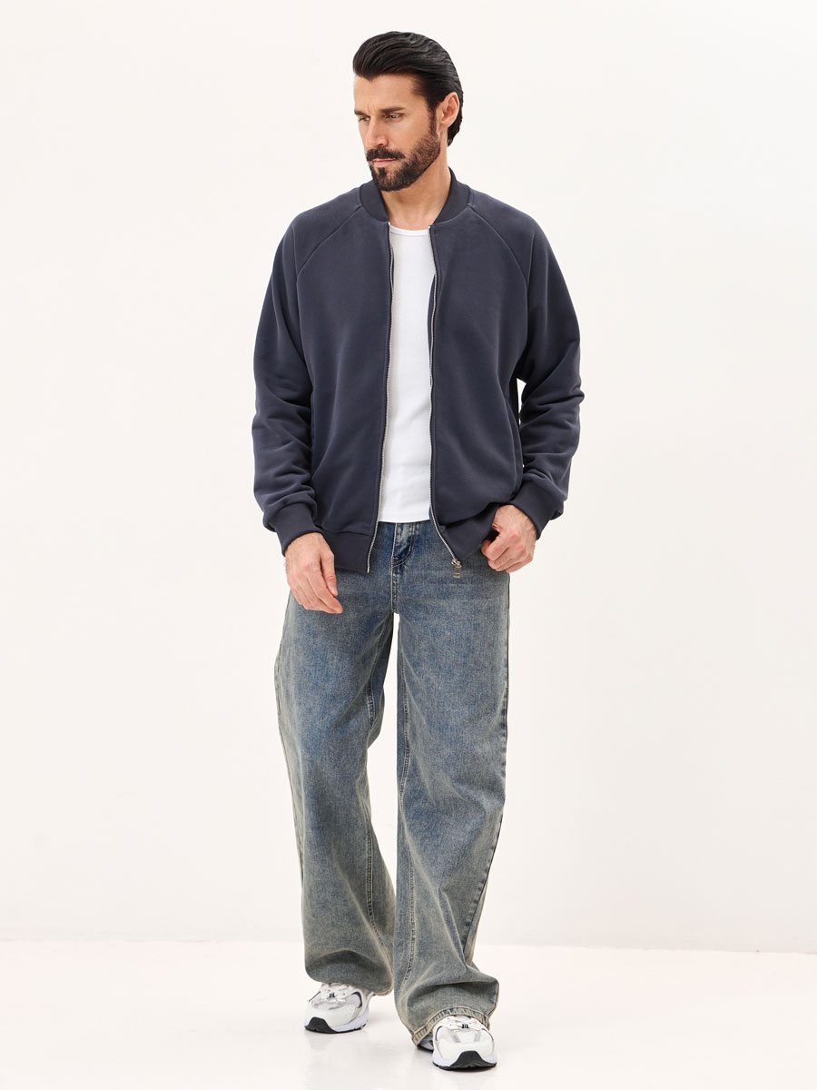 Мужской бомбер на молнии, с рукавом покроя реглан и втачным воротником-стойкой. На полочке 2 прорезных кармана с листочками. Манжеты, пояс, воротник из кашкорсе. Центральная застежка на разъёмную молнию до воротника.
