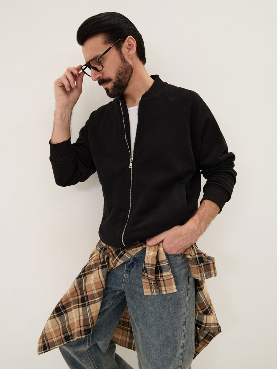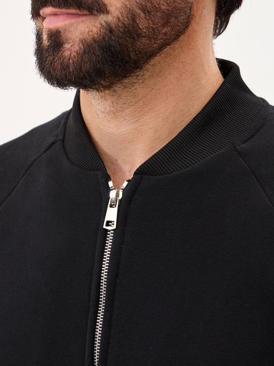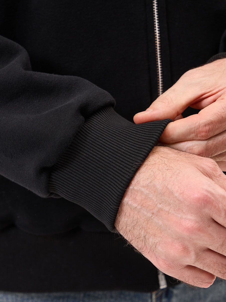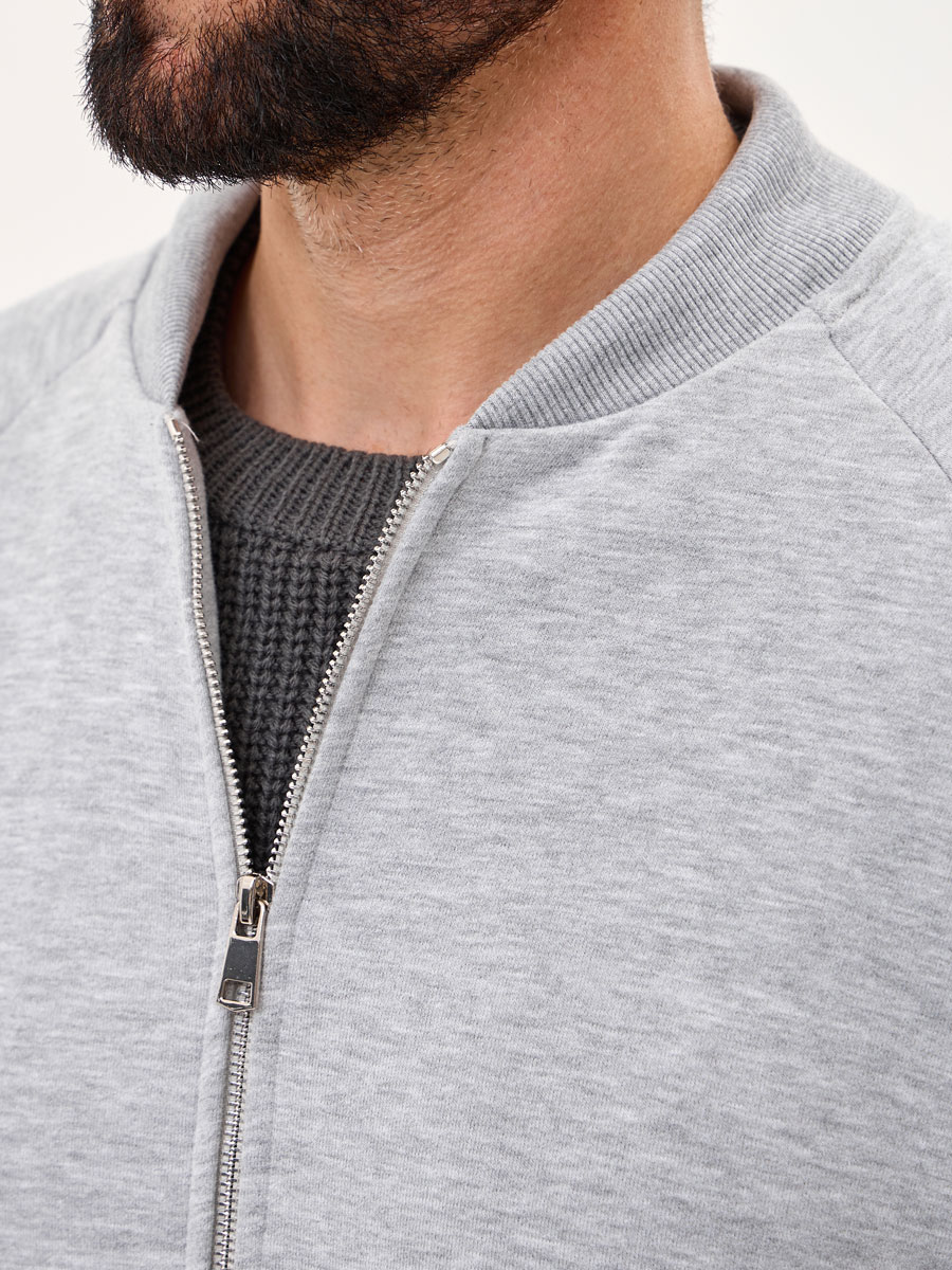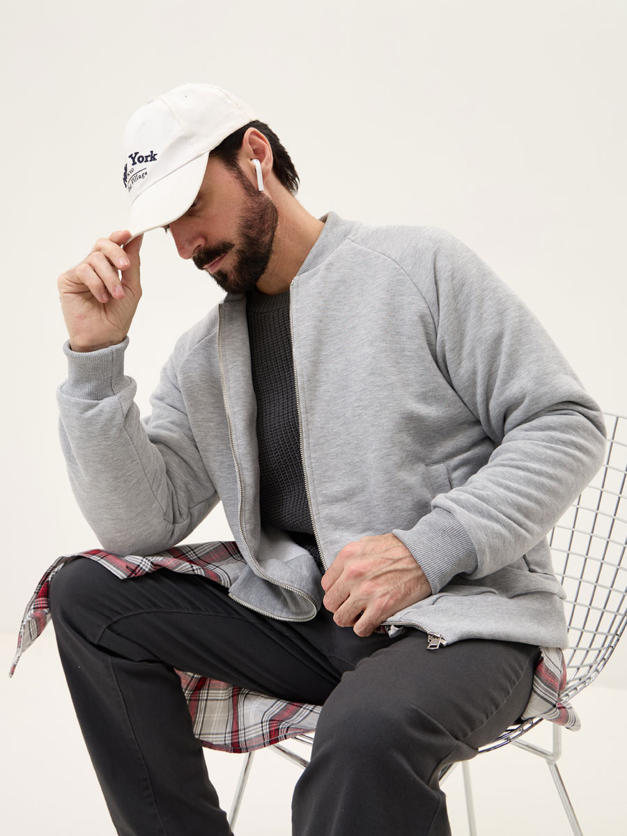 Мужской бомбер на молнии, с рукавом покроя реглан и втачным воротником-стойкой. На полочке 2 прорезных кармана с листочками. Манжеты, пояс, воротник из кашкорсе. Центральная застежка на разъёмную молнию до воротника.