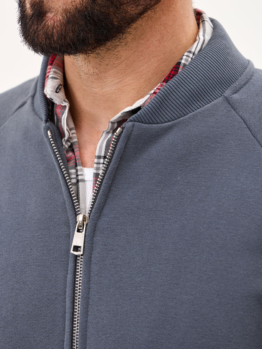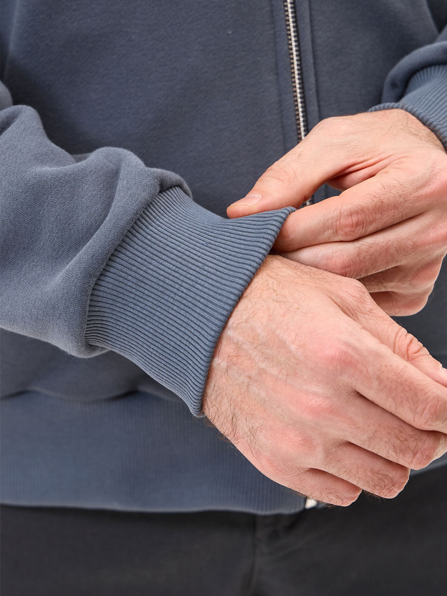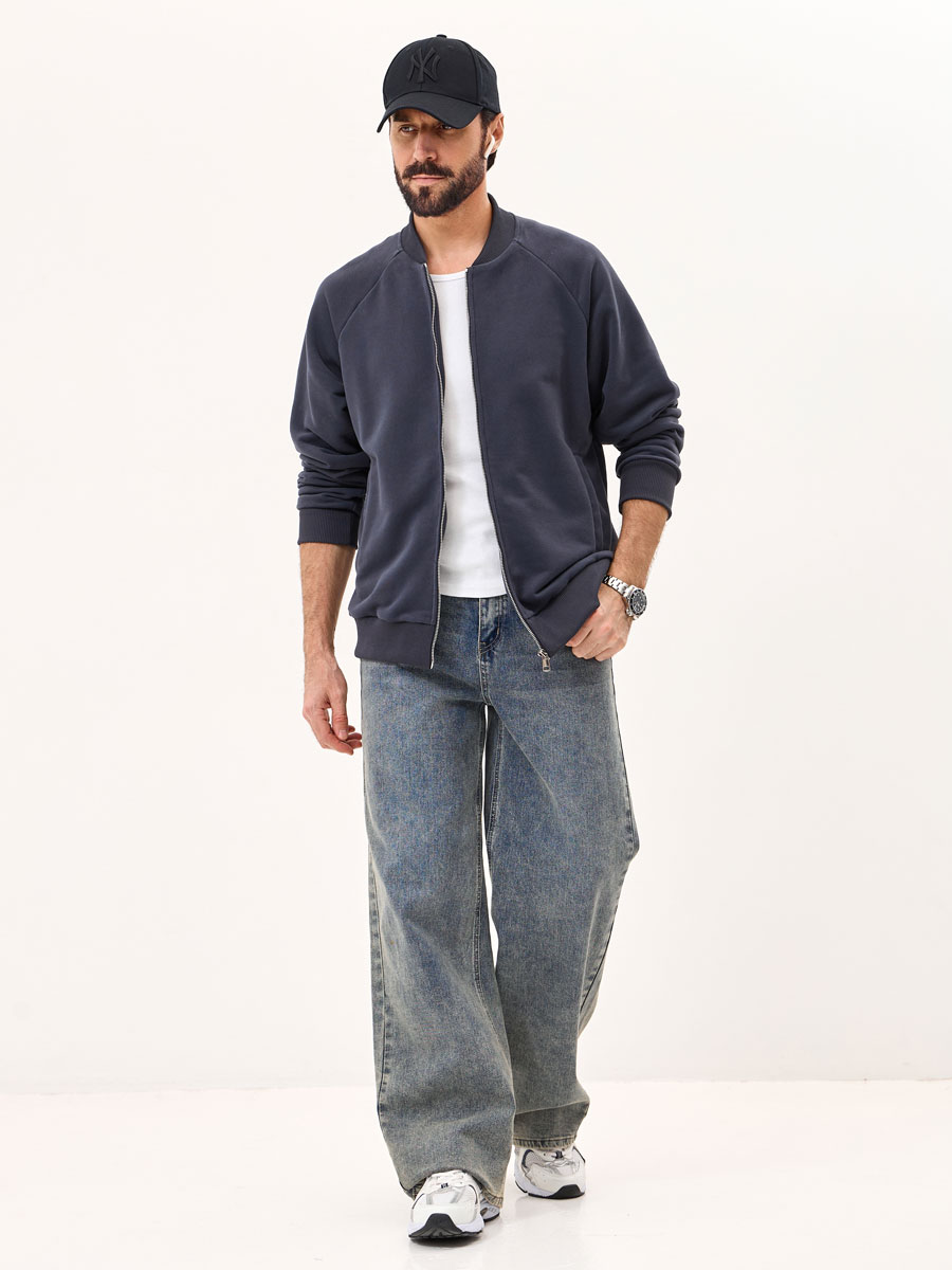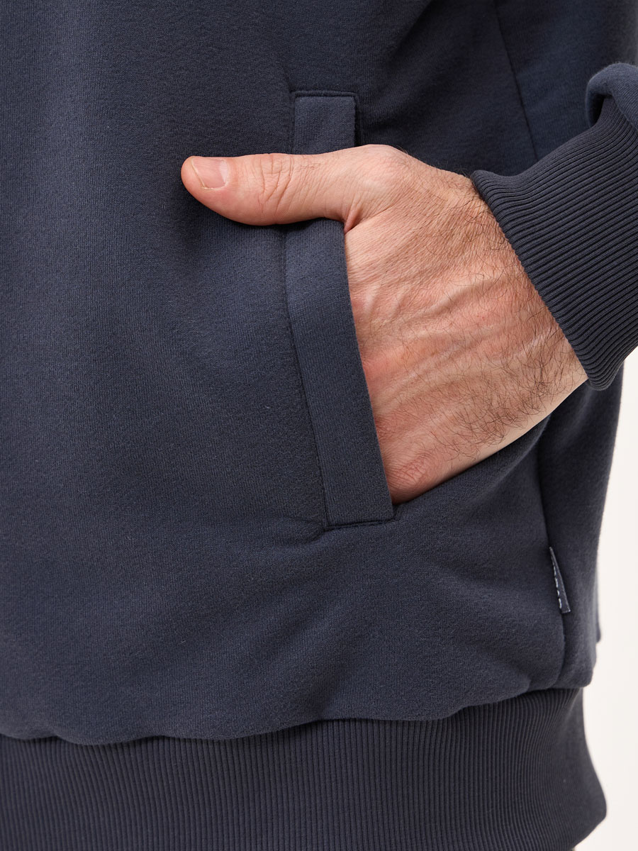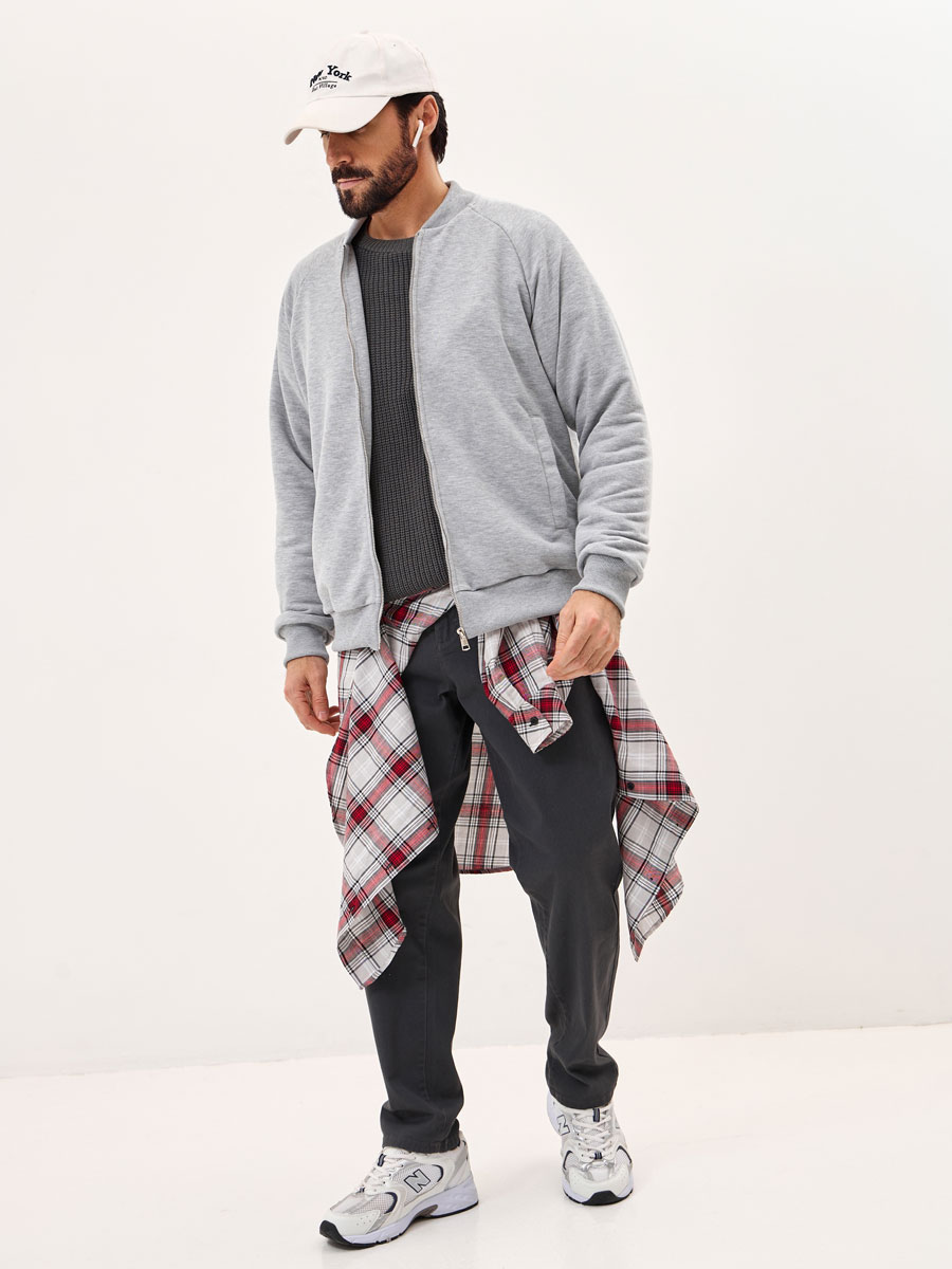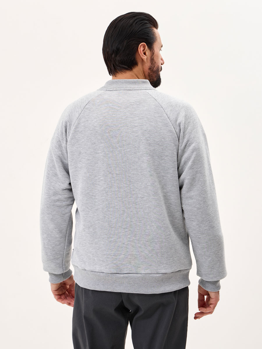 Мужской бомбер на молнии, с рукавом покроя реглан и втачным воротником-стойкой. На полочке 2 прорезных кармана с листочками. Манжеты, пояс, воротник из кашкорсе. Центральная застежка на разъёмную молнию до воротника.