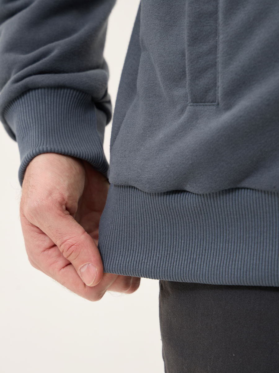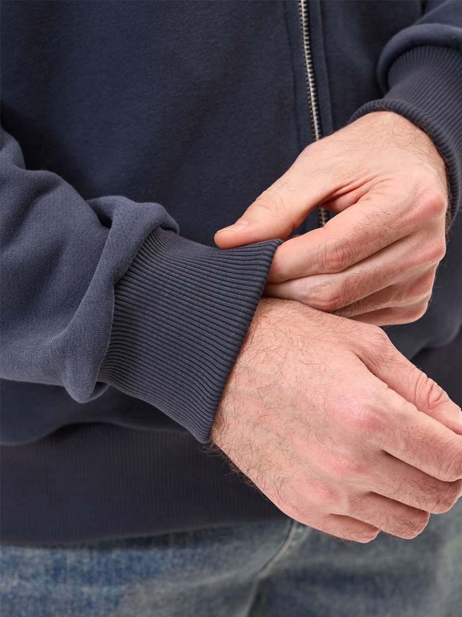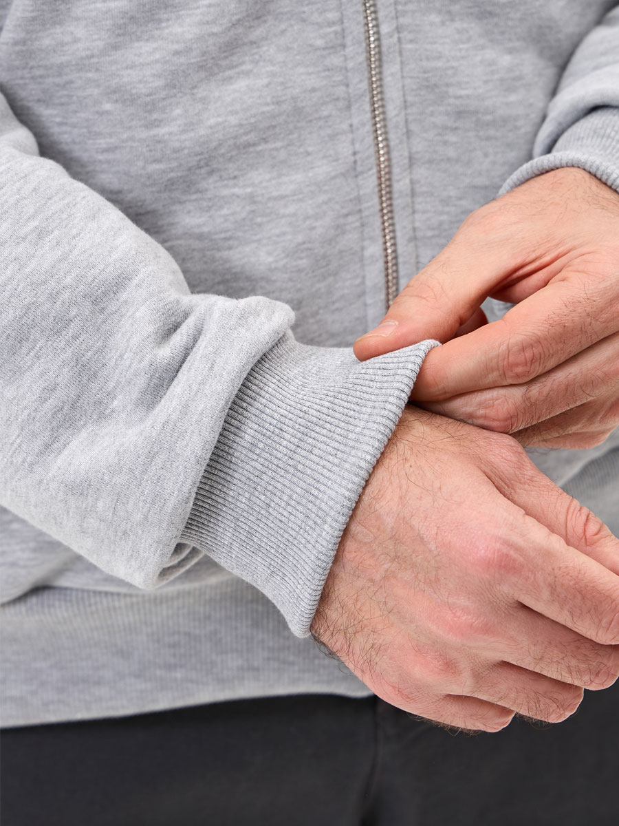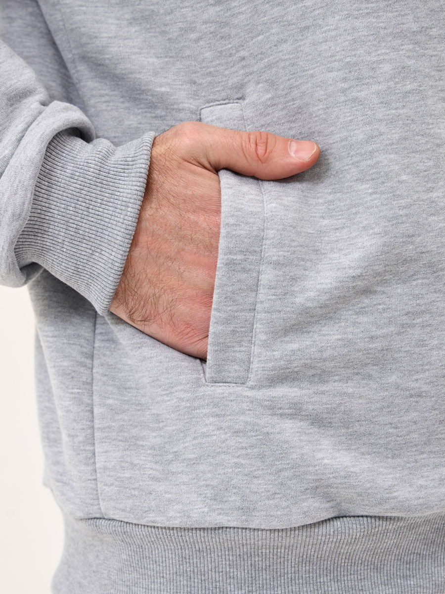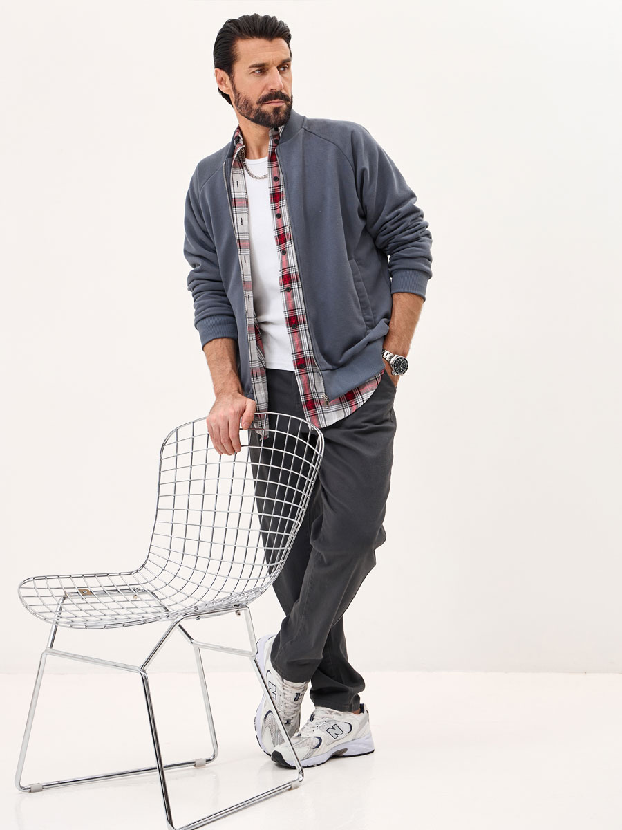 Мужской бомбер на молнии, с рукавом покроя реглан и втачным воротником-стойкой. На полочке 2 прорезных кармана с листочками. Манжеты, пояс, воротник из кашкорсе. Центральная застежка на разъёмную молнию до воротника.