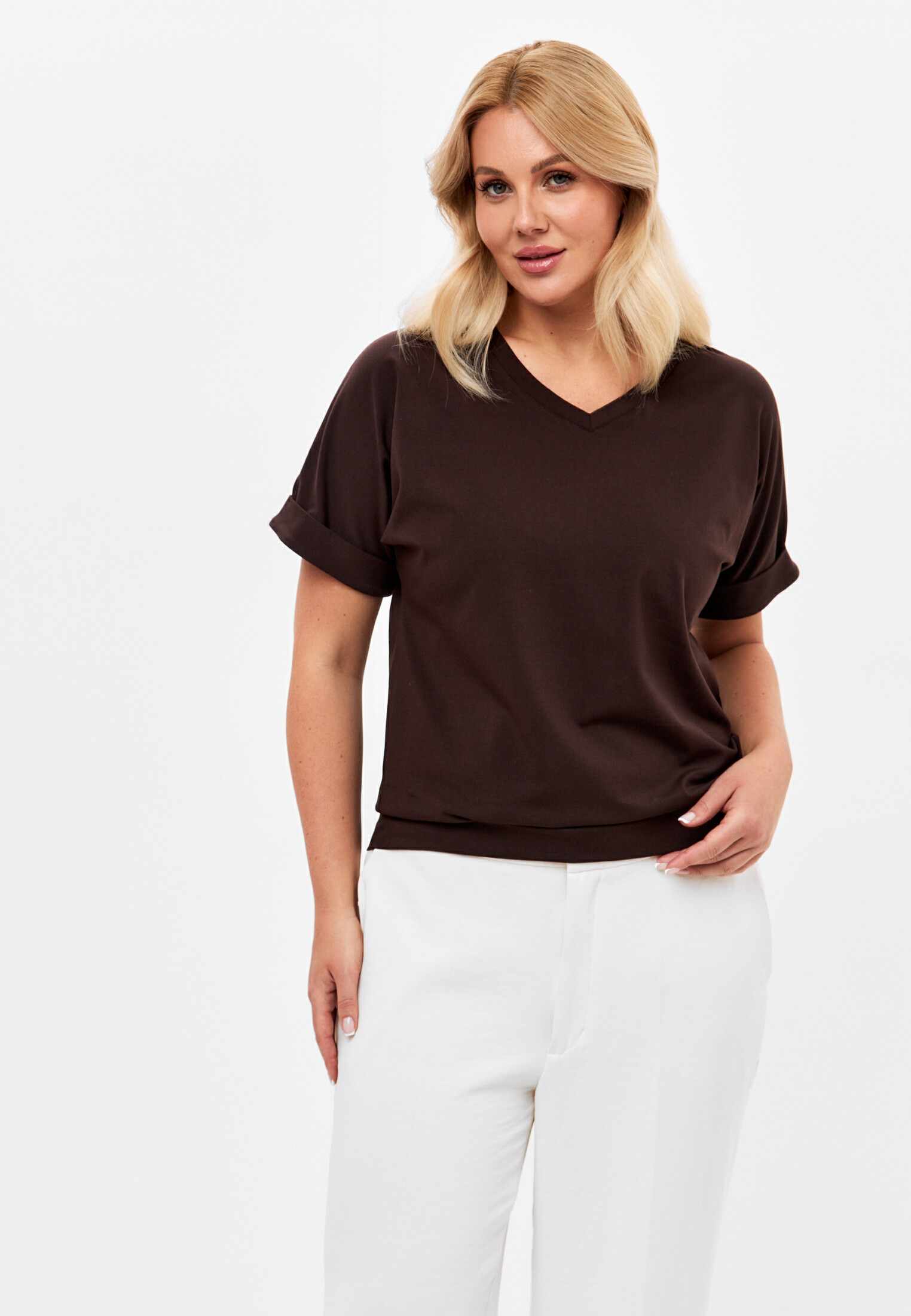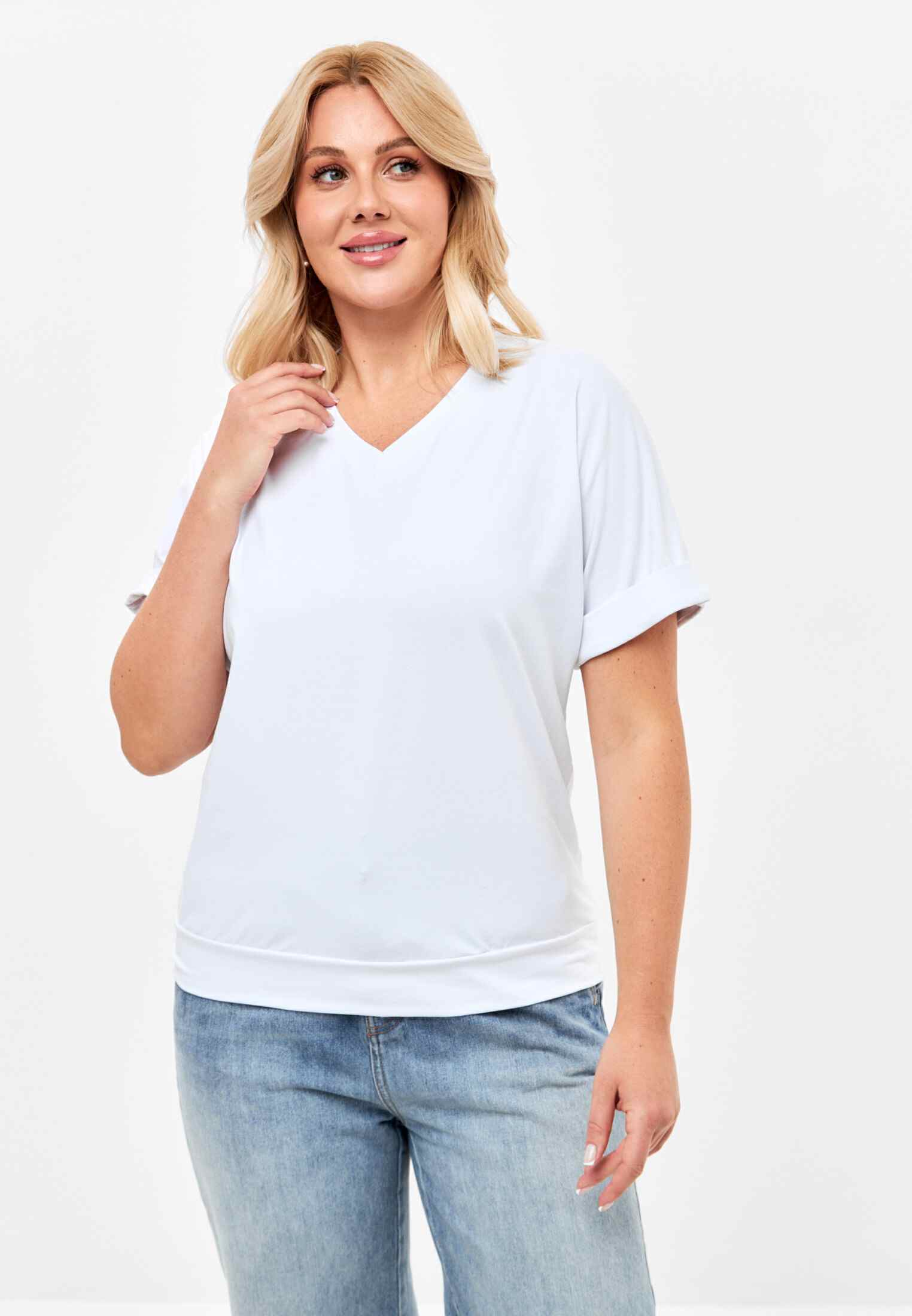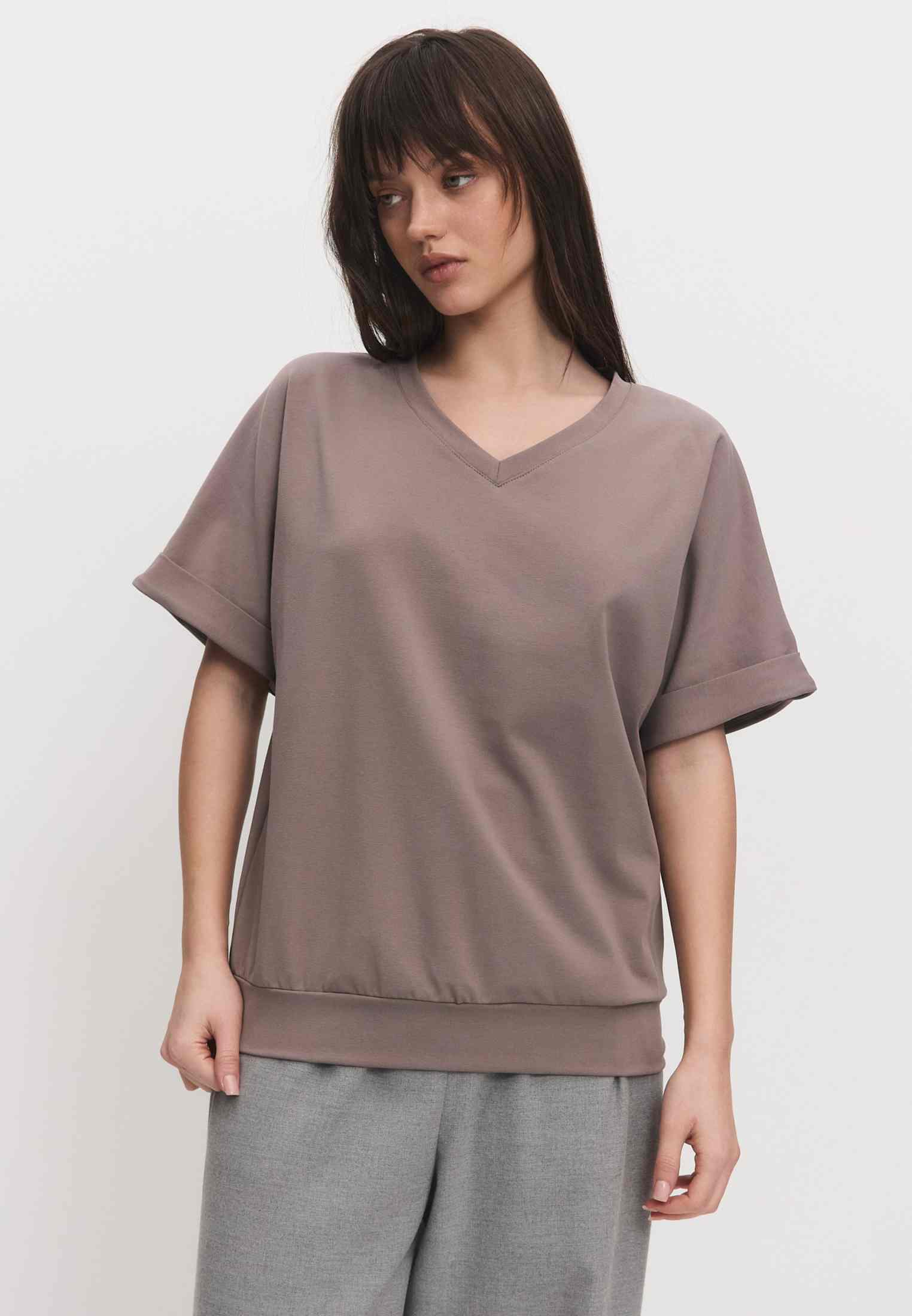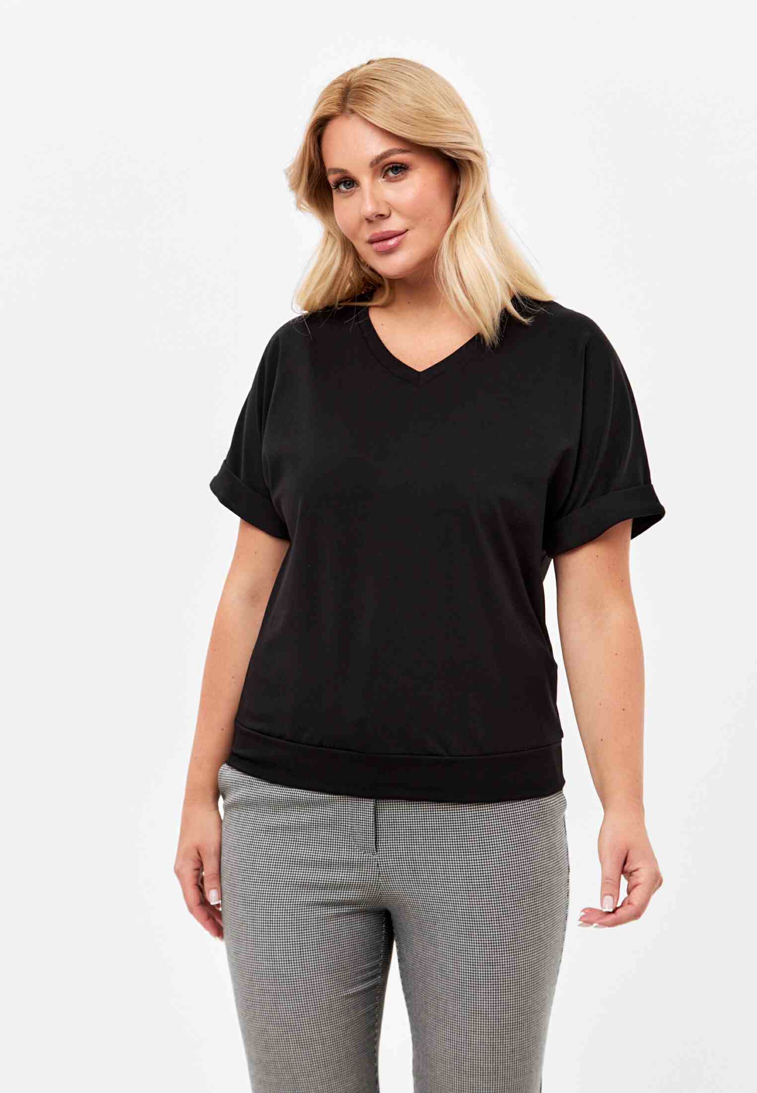 Женская футболка из кулирки, покроя кимоно. С V- образным вырезом горловины и притачным поясом по низу футболки. Горловина обработана бейкой из основной ткани. По низу рукавов манжеты.