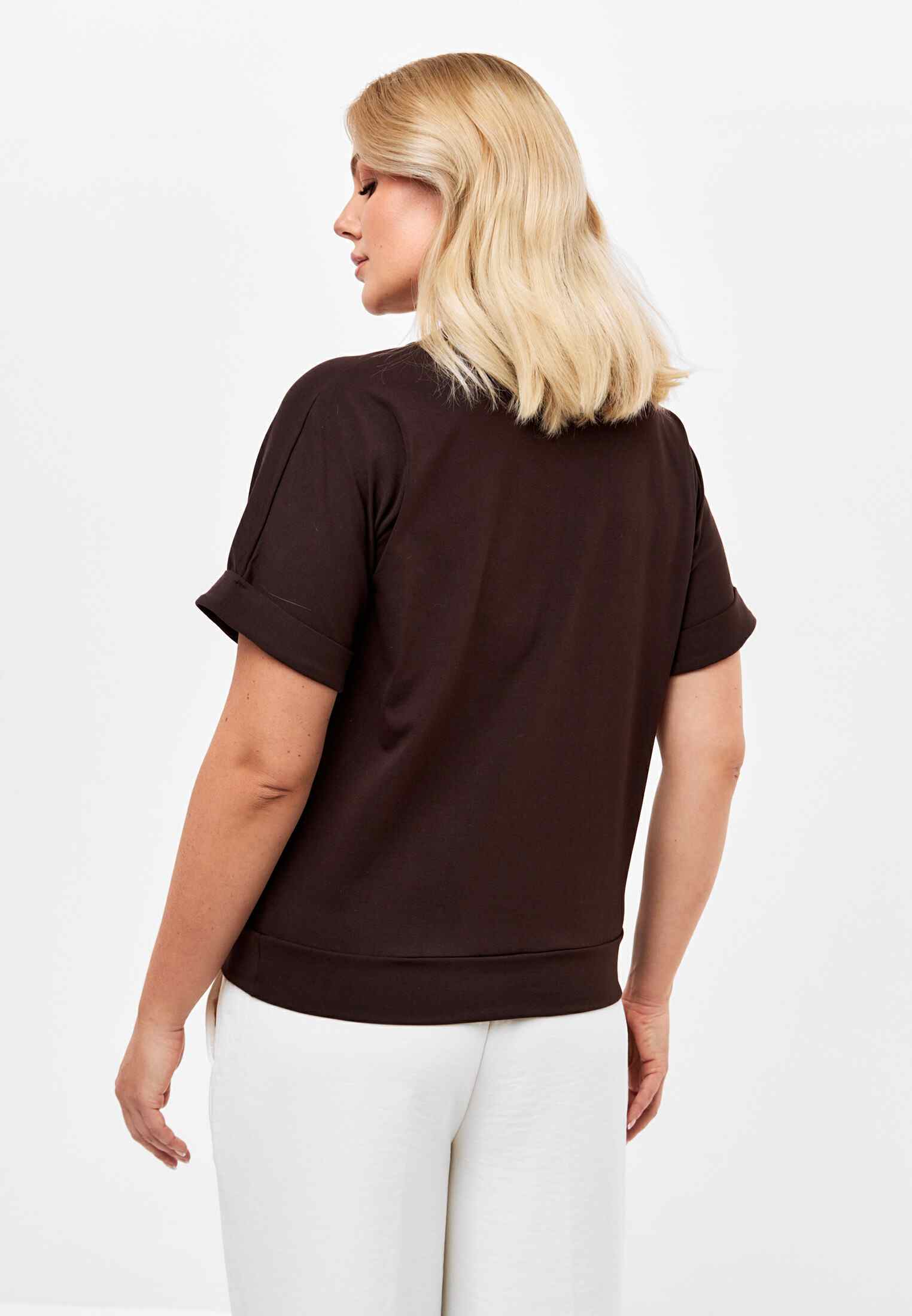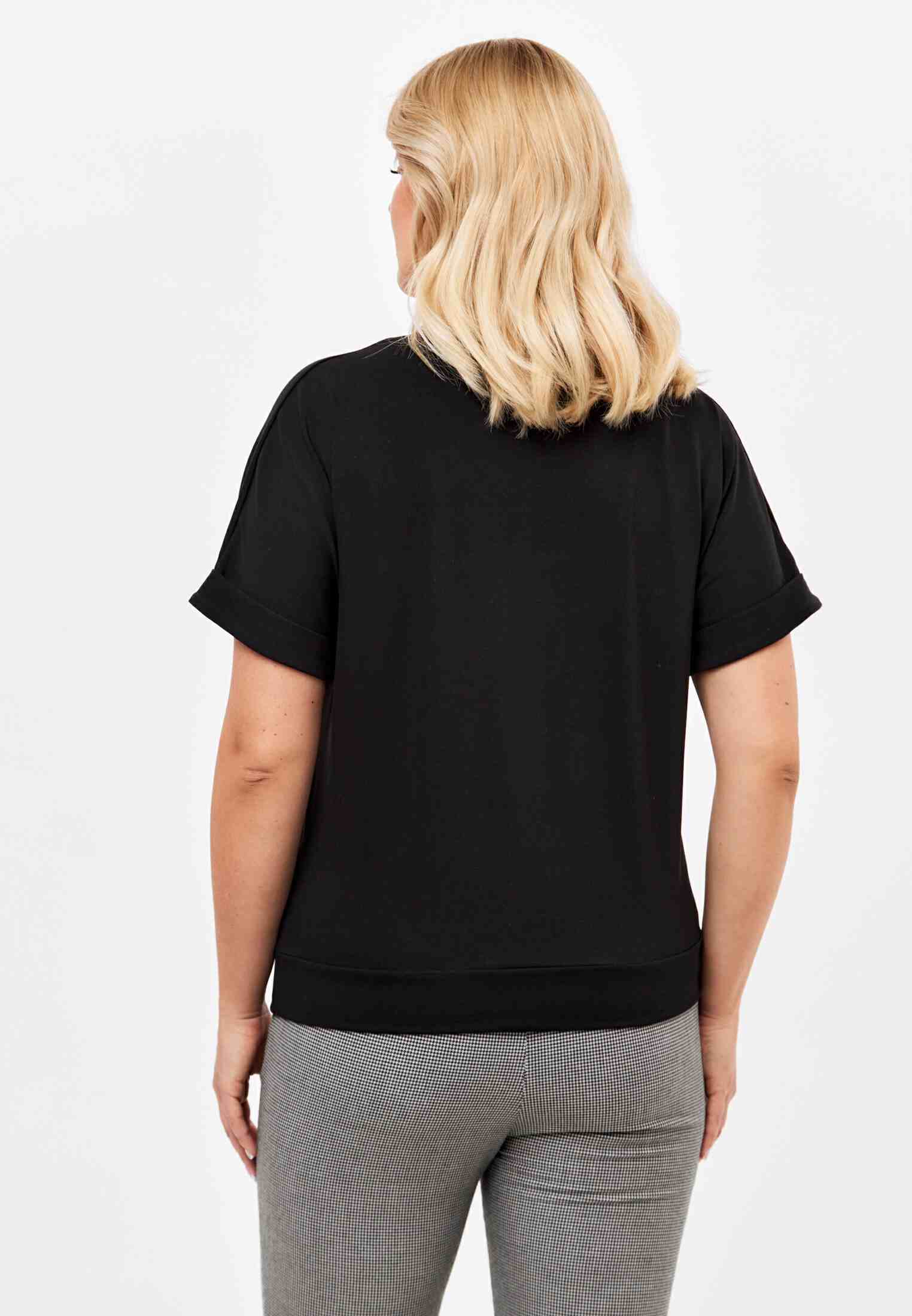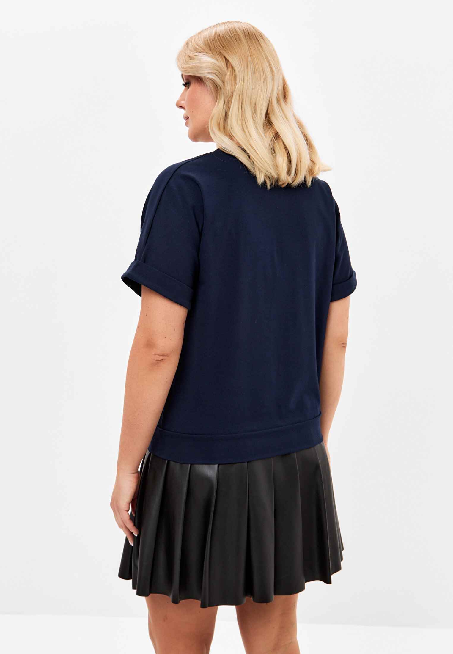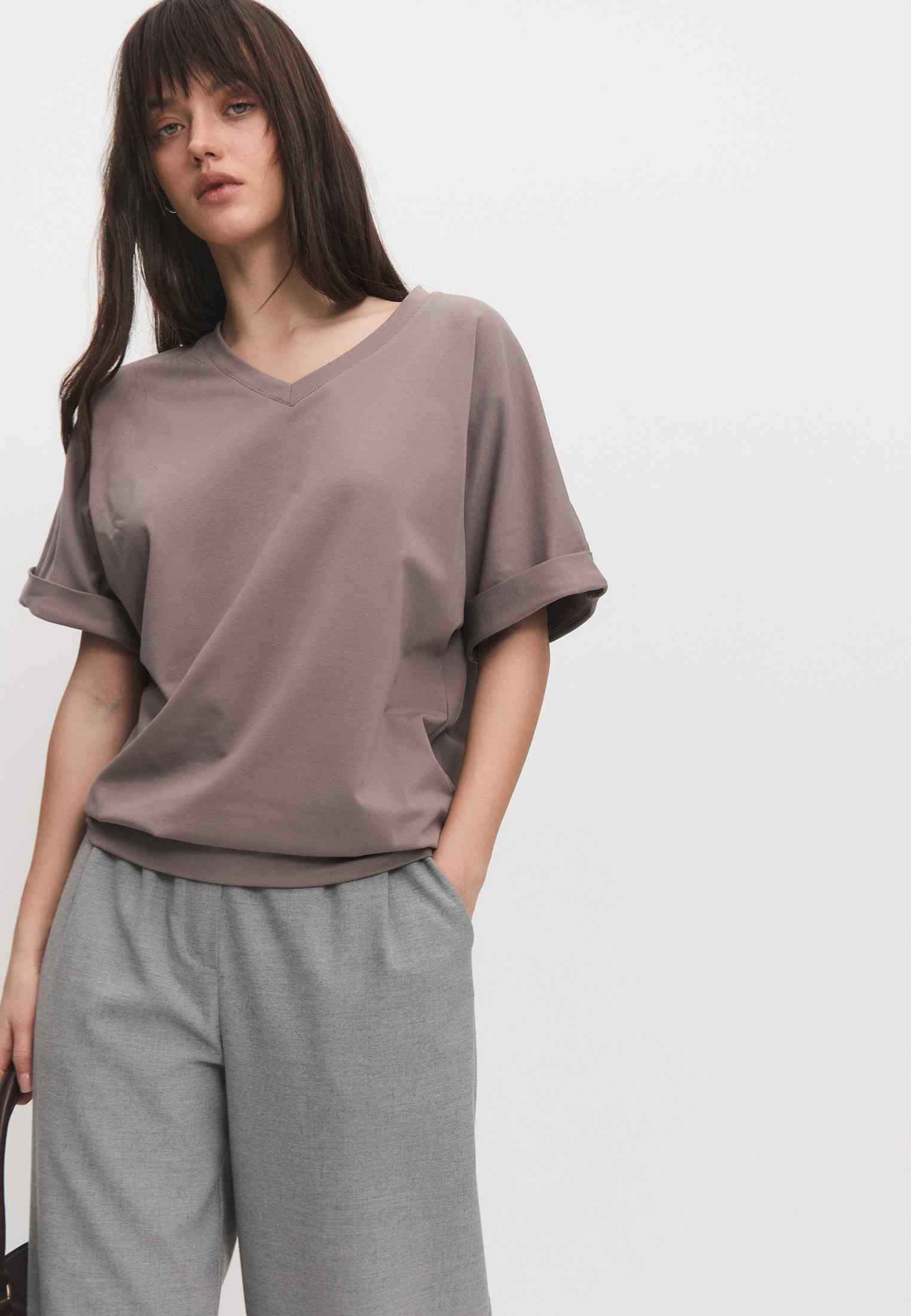 Женская футболка из кулирки, покроя кимоно. С V- образным вырезом горловины и притачным поясом по низу футболки. Горловина обработана бейкой из основной ткани. По низу рукавов манжеты.