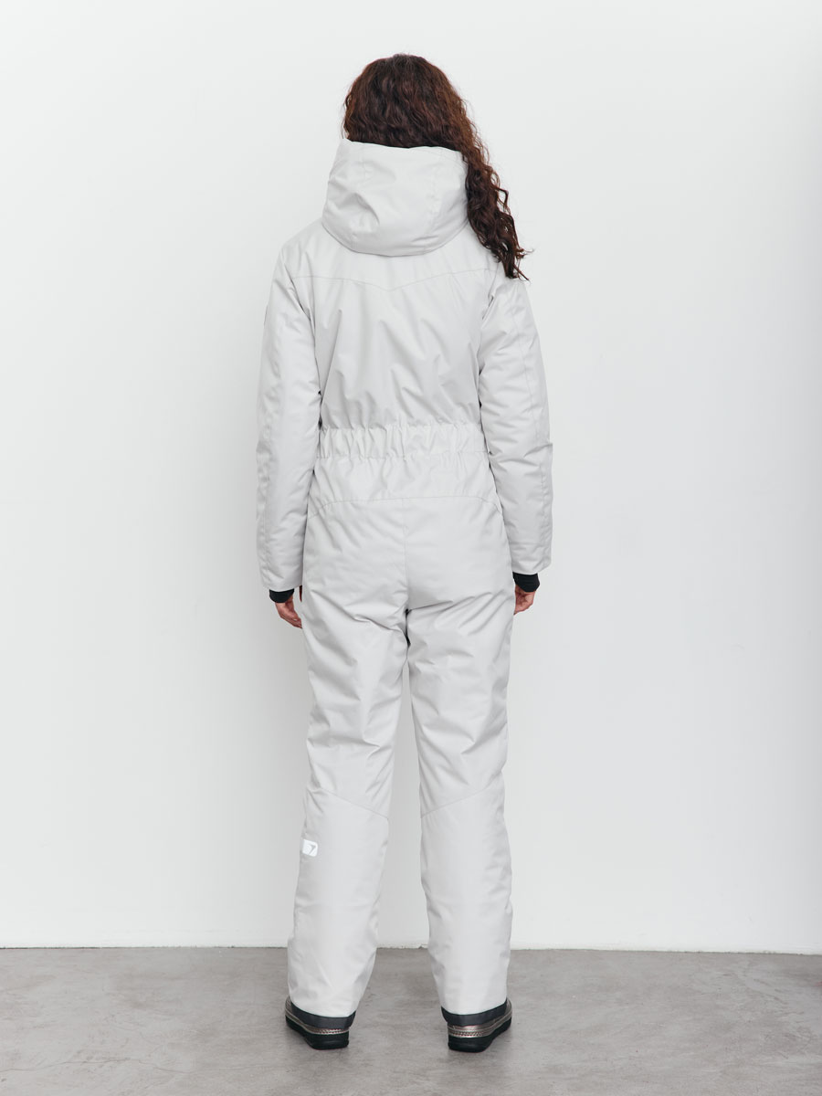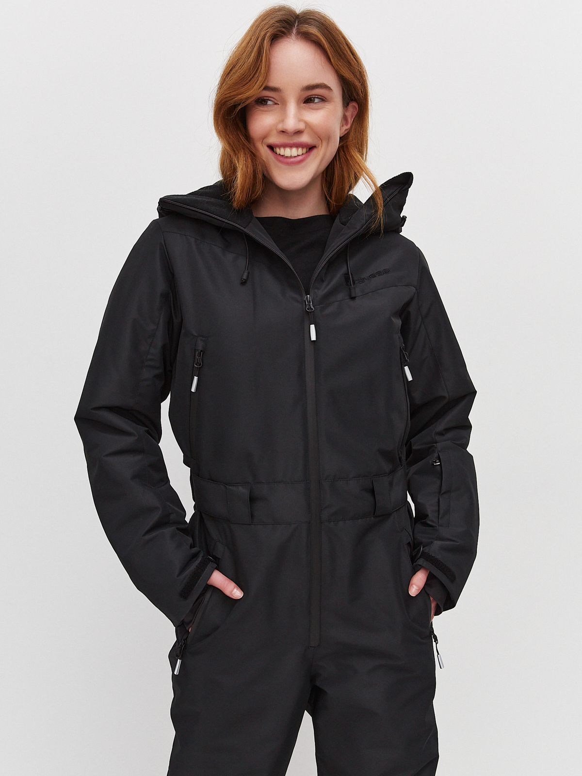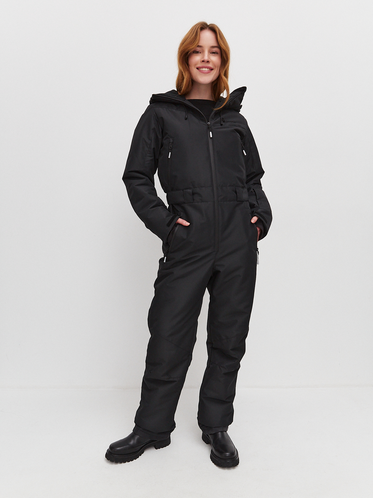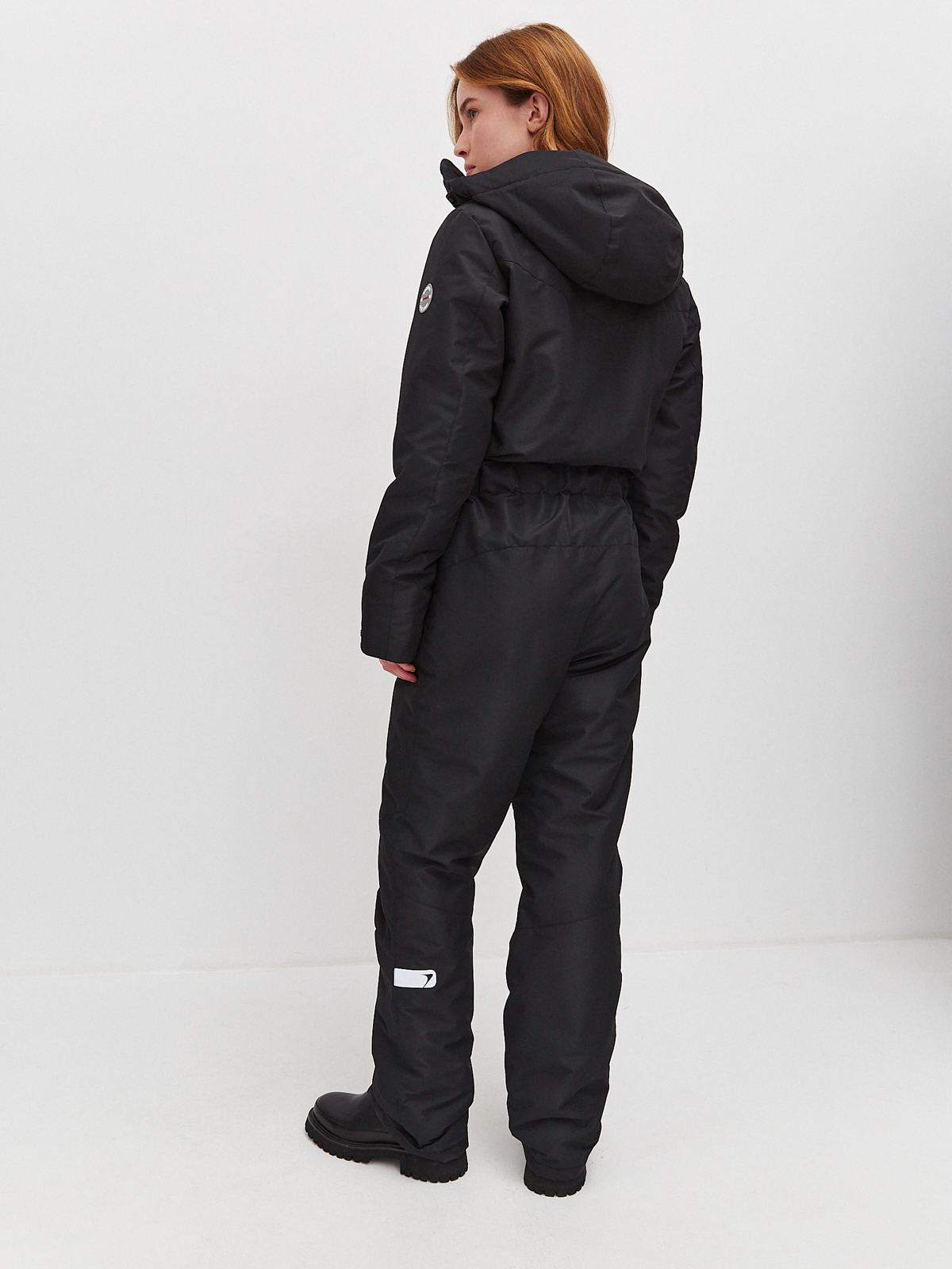 Женский зимний комбинезон из мембранной ткани с отрезным поясом по талии, пояс регулируется патами на липучке. Центральная застежка на молнию с влагозащитным покрытием. Втачной капюшон с кулисами по лицевой и затылочной части. 4 кармана на молниях с влагозащитной обработкой. 1 карман на рукаве с молнией. Низ рукава с патами на липучке и с внутренним манжетом, манжет с отверстием для большого пальца. Низ брюк с усилением и с внутренней снегозащитной муфтой. Комбинированная подкладка из флиса и шелка с внутренним карманом. Внутри комбинезона помочи из резинки для удобства ношения. На комбинезоне расположены светоотражающие элементы. Рассчитана на температуру от 0 до -20.