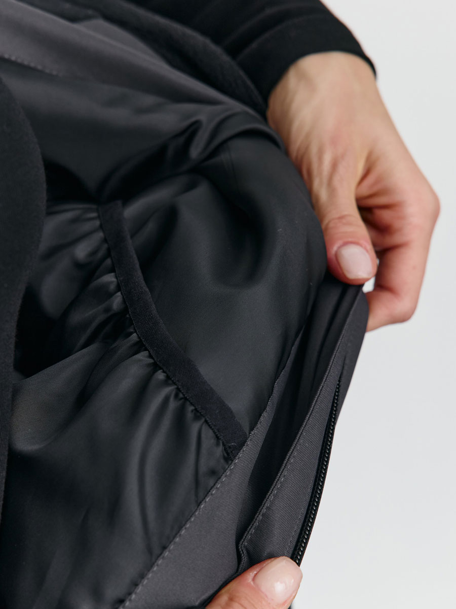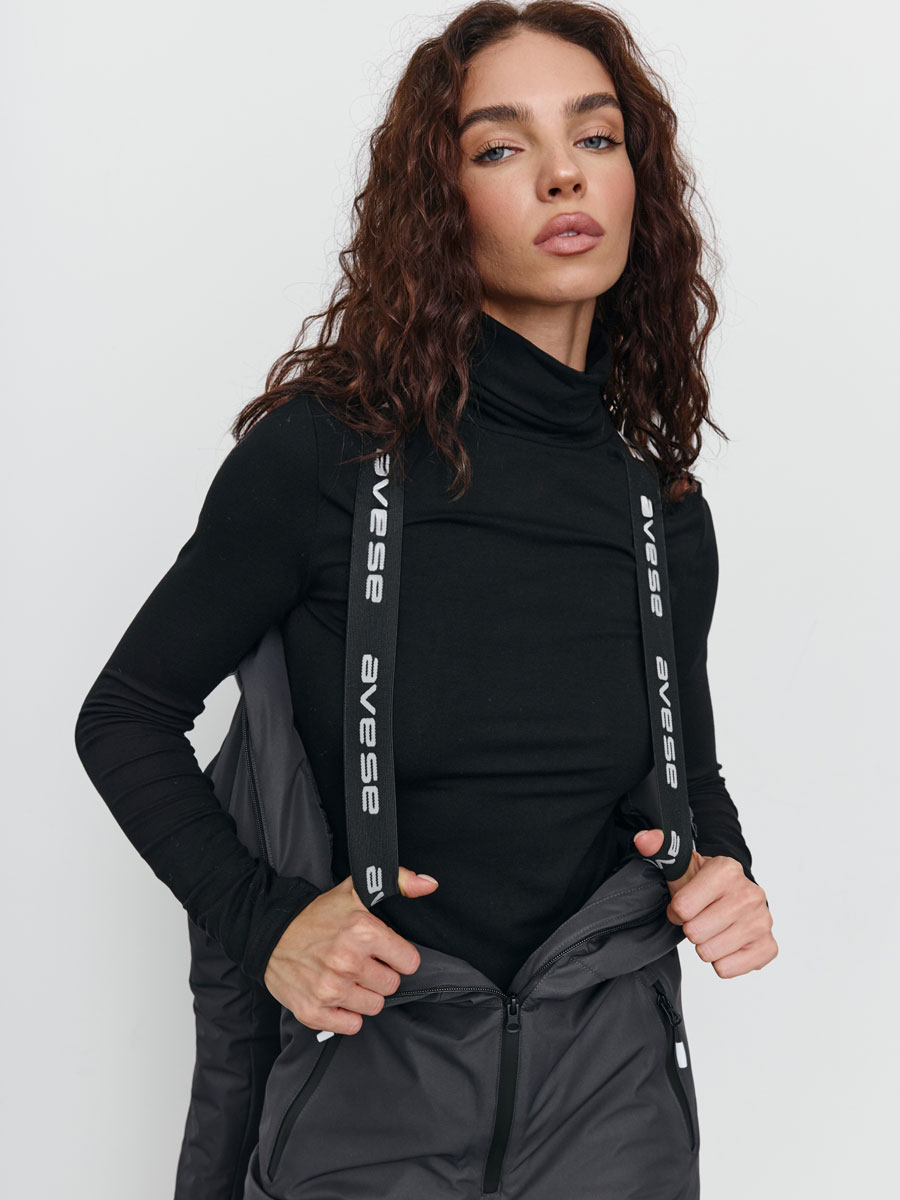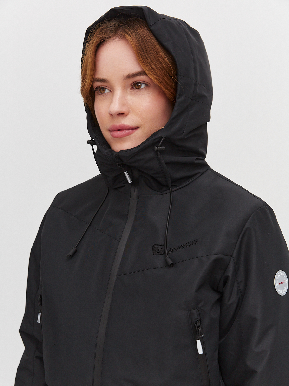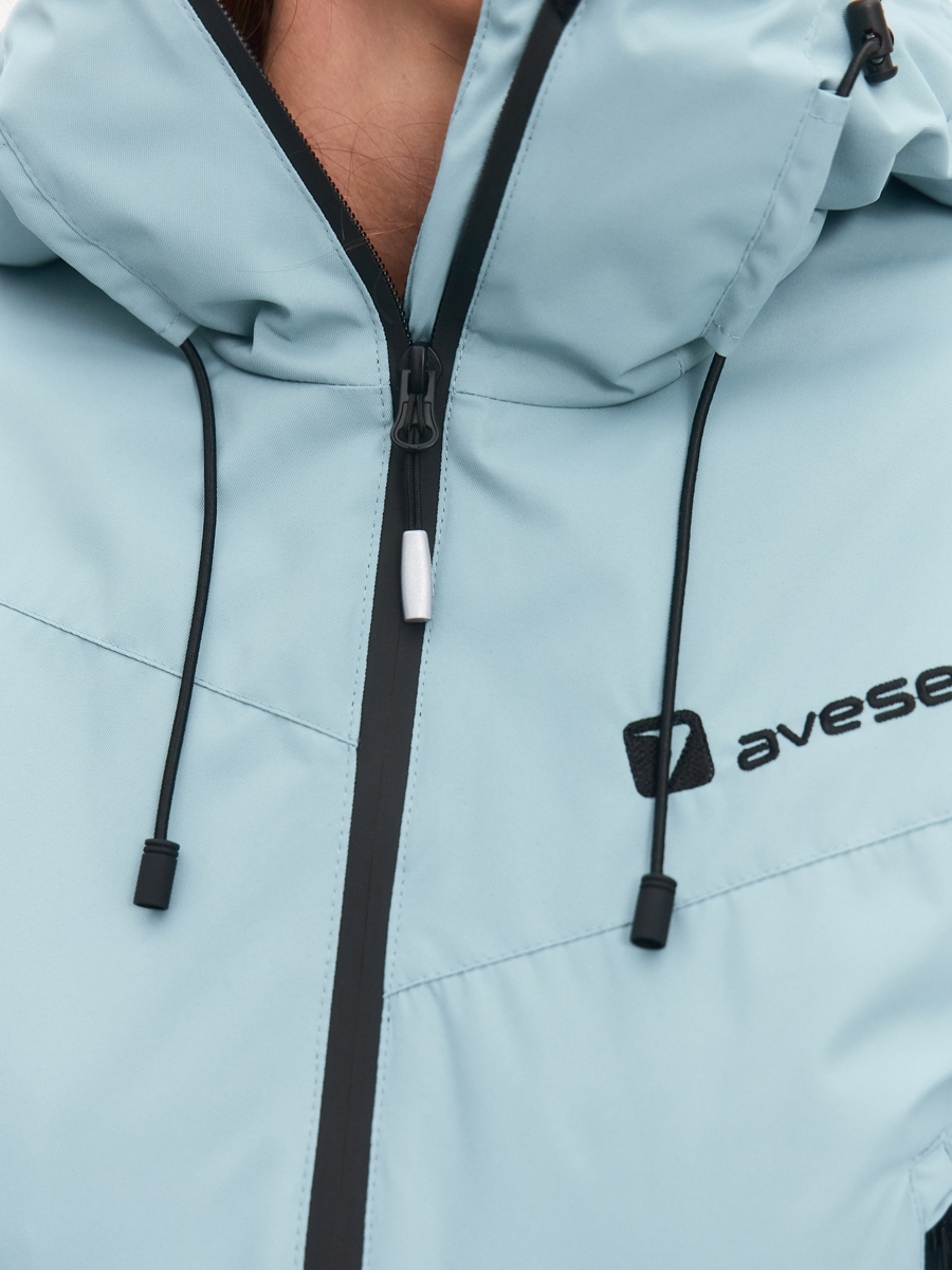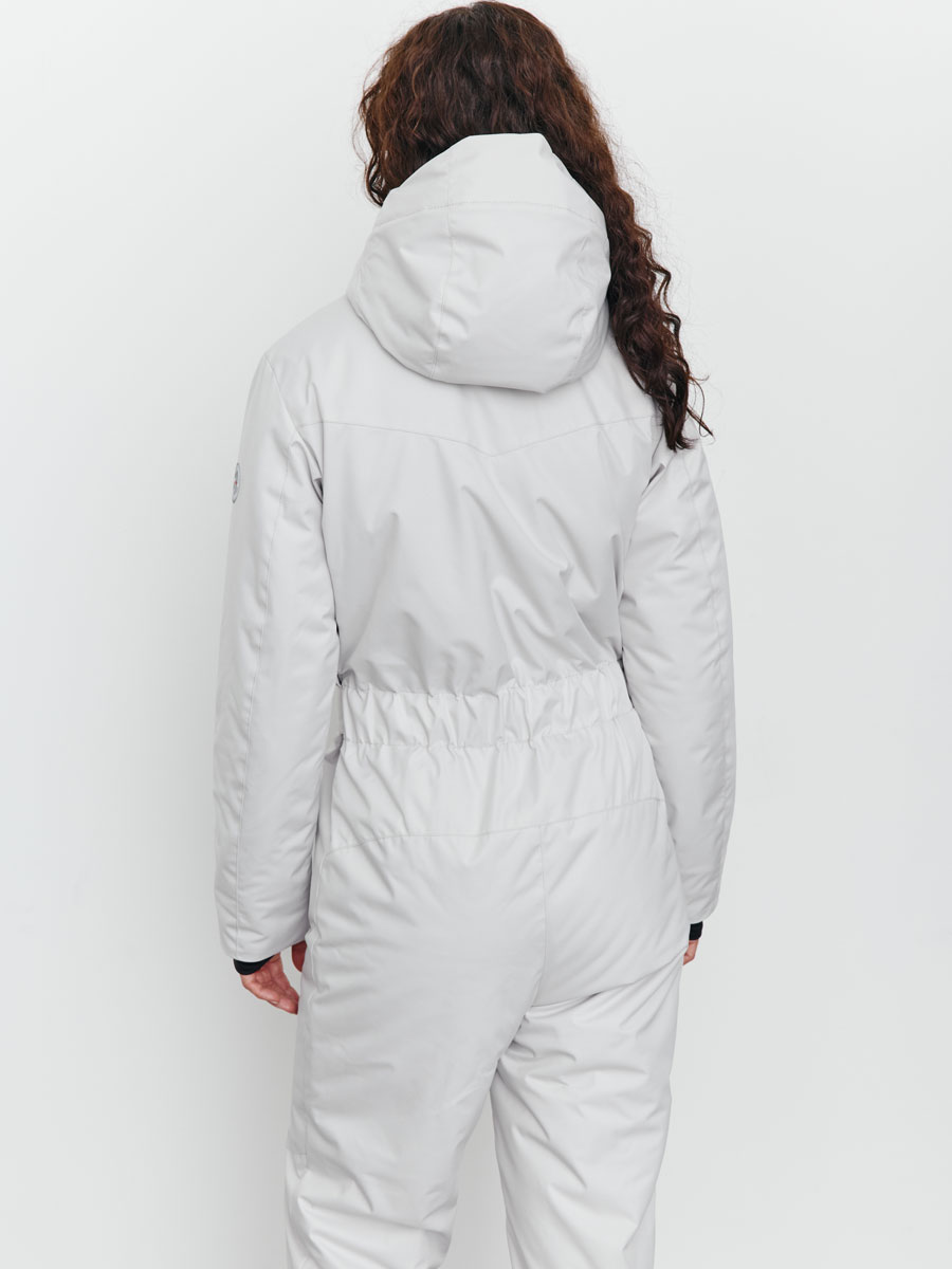Женский зимний комбинезон из мембранной ткани с отрезным поясом по талии, пояс регулируется патами на липучке. Центральная застежка на молнию с влагозащитным покрытием. Втачной капюшон с кулисами по лицевой и затылочной части. 4 кармана на молниях с влагозащитной обработкой. 1 карман на рукаве с молнией. Низ рукава с патами на липучке и с внутренним манжетом, манжет с отверстием для большого пальца. Низ брюк с усилением и с внутренней снегозащитной муфтой. Комбинированная подкладка из флиса и шелка с внутренним карманом. Внутри комбинезона помочи из резинки для удобства ношения. На комбинезоне расположены светоотражающие элементы. Рассчитана на температуру от 0 до -20.