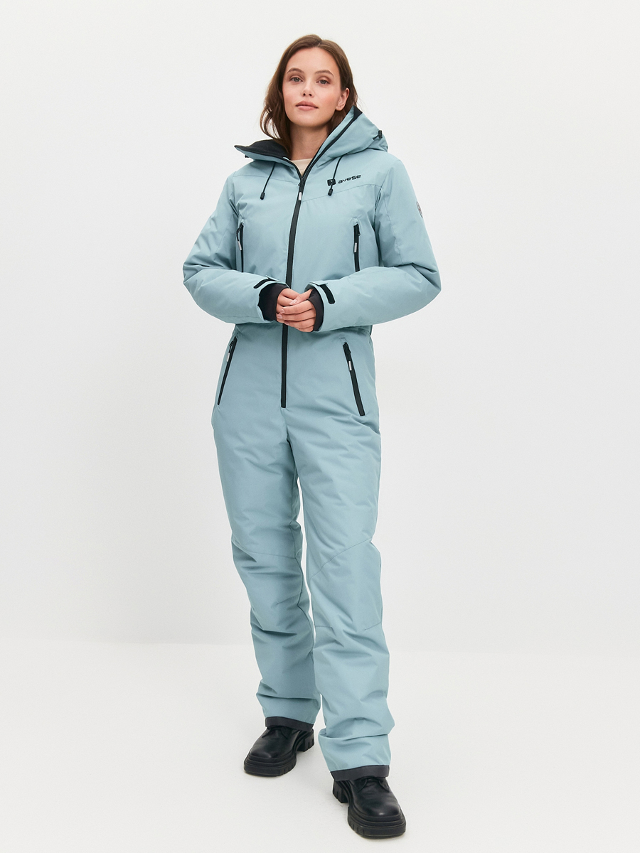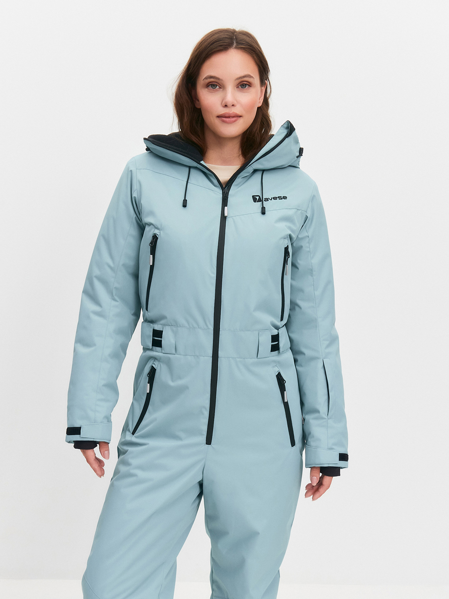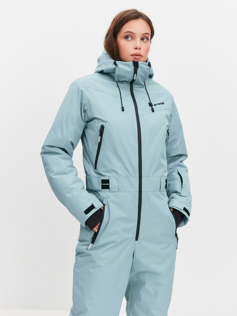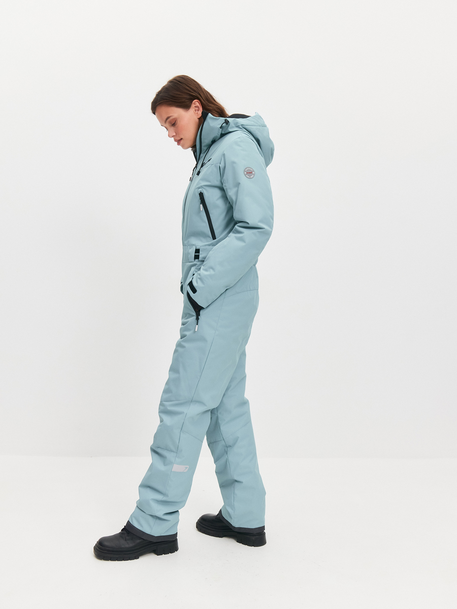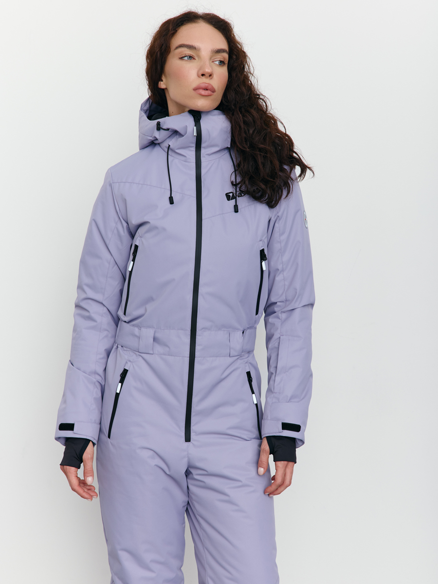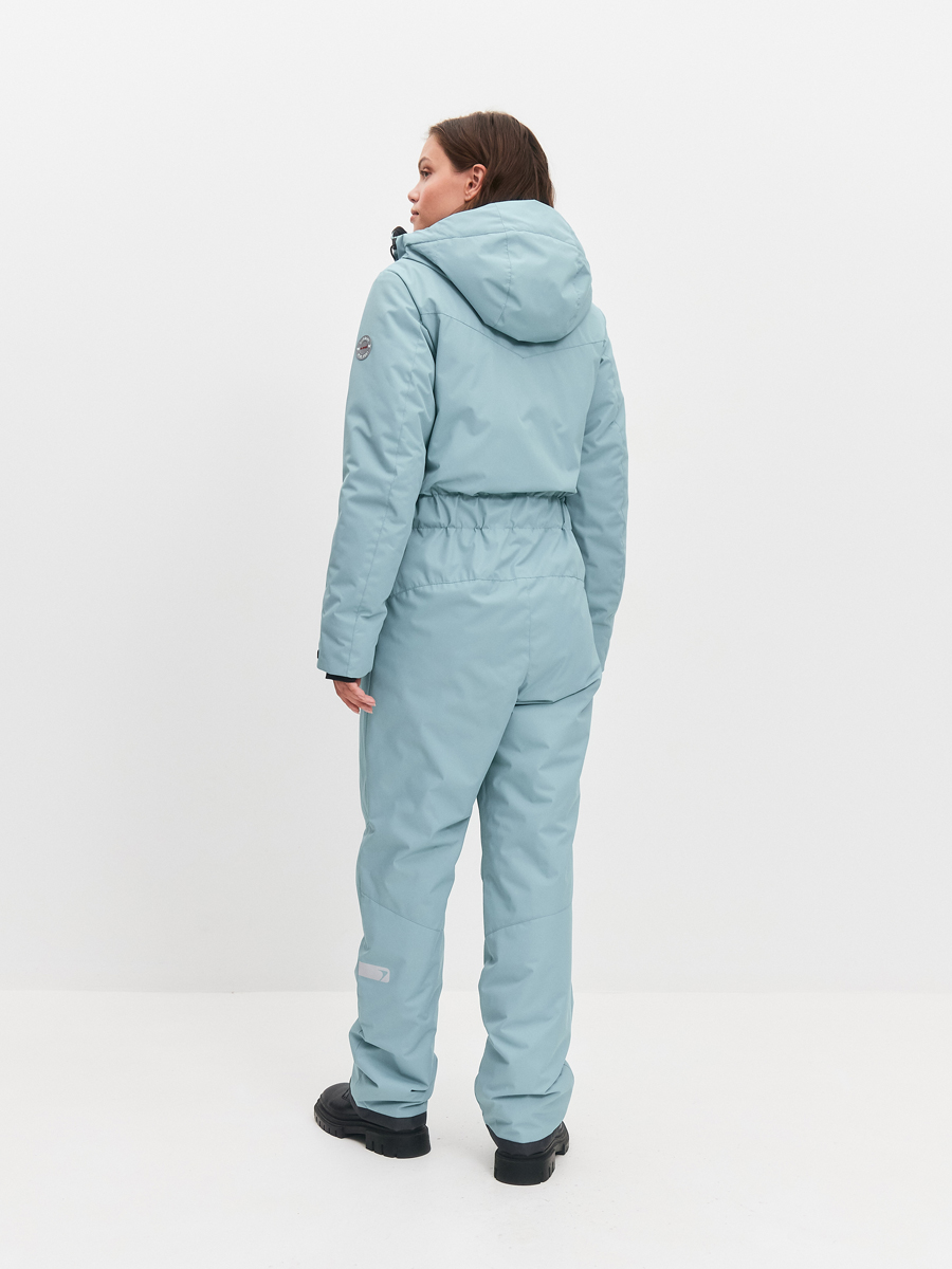 Женский зимний комбинезон из мембранной ткани с отрезным поясом по талии, пояс регулируется патами на липучке. Центральная застежка на молнию с влагозащитным покрытием. Втачной капюшон с кулисами по лицевой и затылочной части. 4 кармана на молниях с влагозащитной обработкой. 1 карман на рукаве с молнией. Низ рукава с патами на липучке и с внутренним манжетом, манжет с отверстием для большого пальца. Низ брюк с усилением и с внутренней снегозащитной муфтой. Комбинированная подкладка из флиса и шелка с внутренним карманом. Внутри комбинезона помочи из резинки для удобства ношения. На комбинезоне расположены светоотражающие элементы. Рассчитана на температуру от 0 до -20.