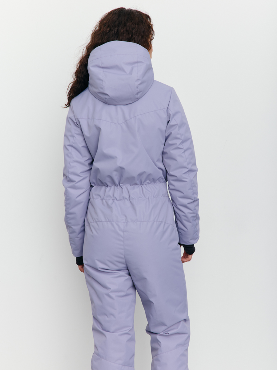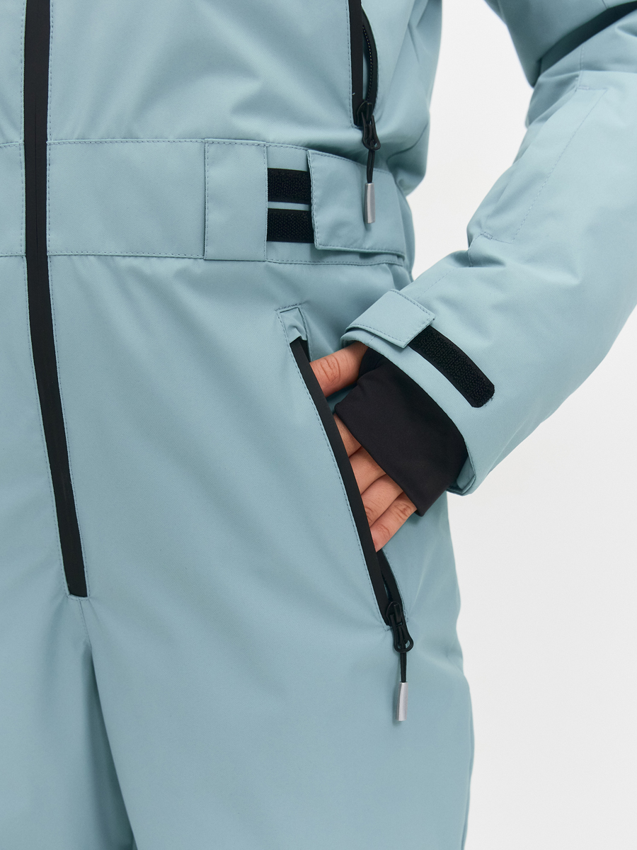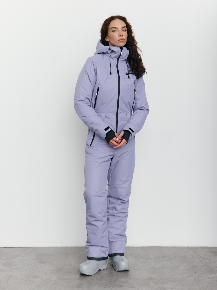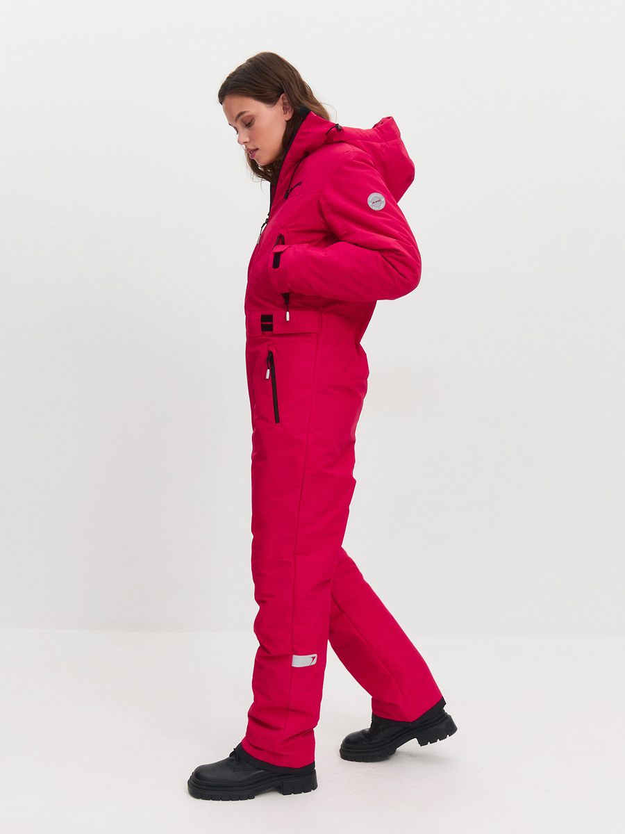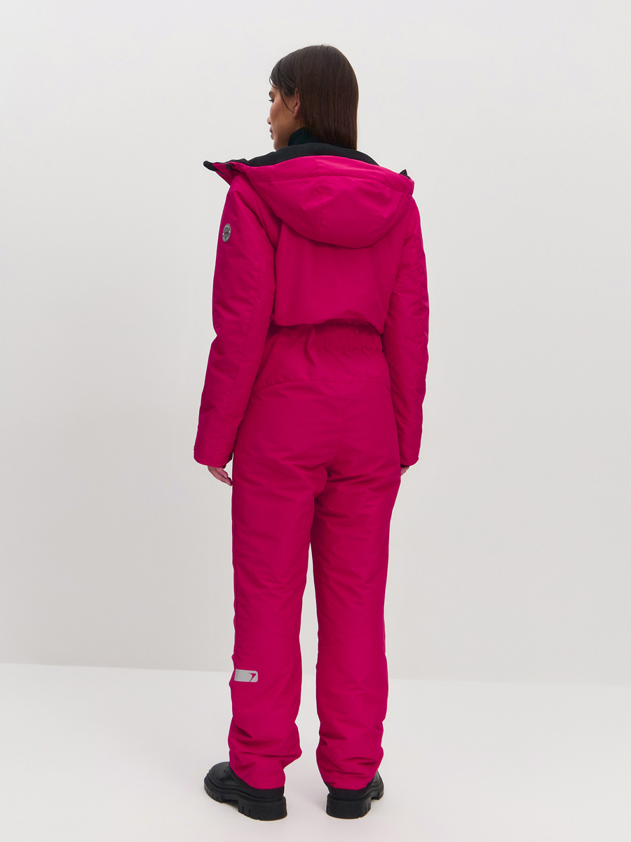 Женский зимний комбинезон из мембранной ткани с отрезным поясом по талии, пояс регулируется патами на липучке. Центральная застежка на молнию с влагозащитным покрытием. Втачной капюшон с кулисами по лицевой и затылочной части. 4 кармана на молниях с влагозащитной обработкой. 1 карман на рукаве с молнией. Низ рукава с патами на липучке и с внутренним манжетом, манжет с отверстием для большого пальца. Низ брюк с усилением и с внутренней снегозащитной муфтой. Комбинированная подкладка из флиса и шелка с внутренним карманом. Внутри комбинезона помочи из резинки для удобства ношения. На комбинезоне расположены светоотражающие элементы. Рассчитана на температуру от 0 до -20.