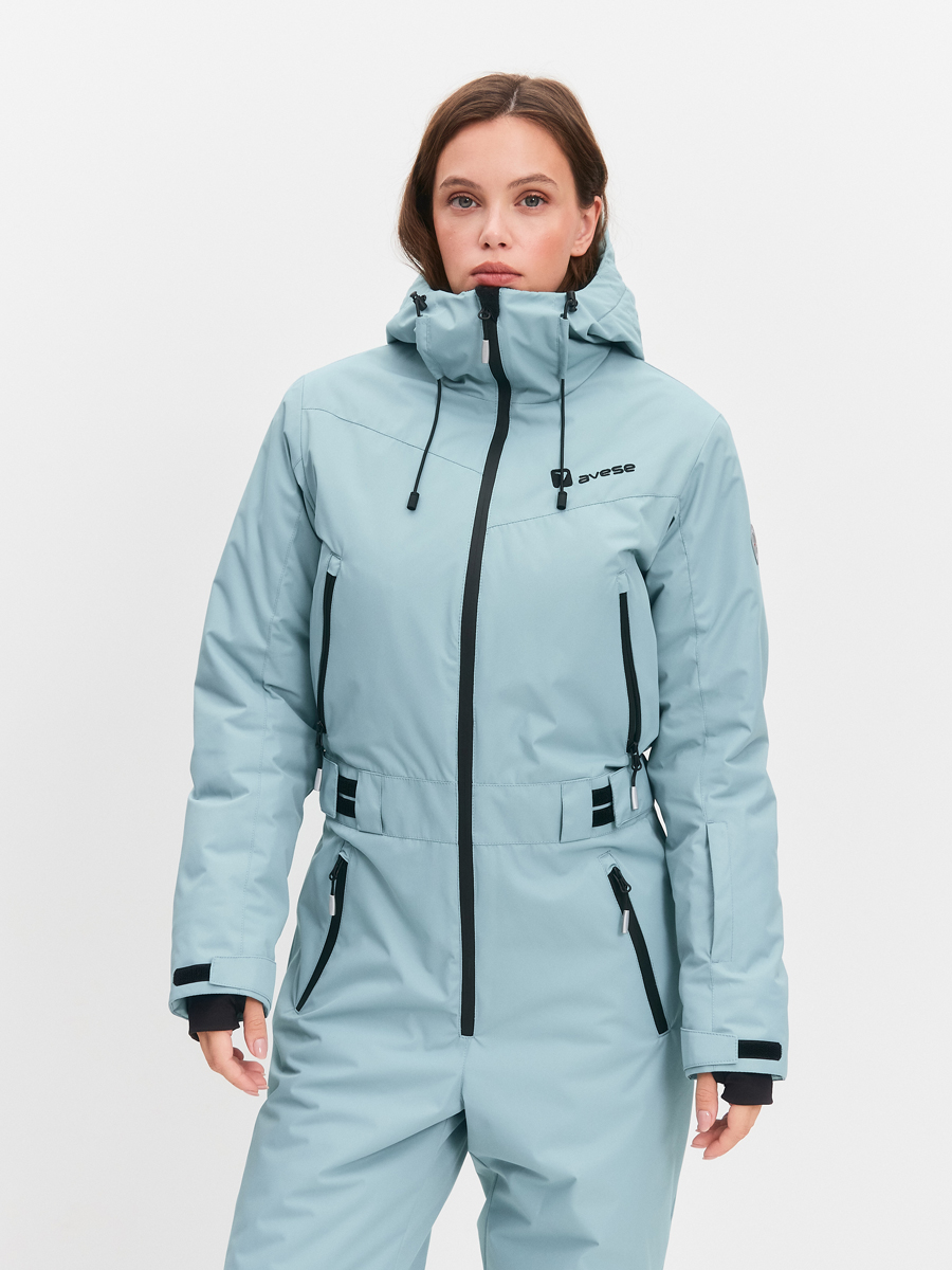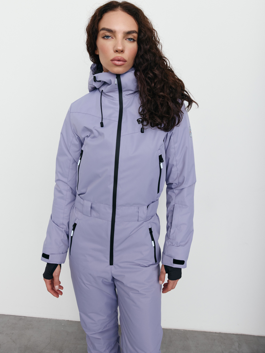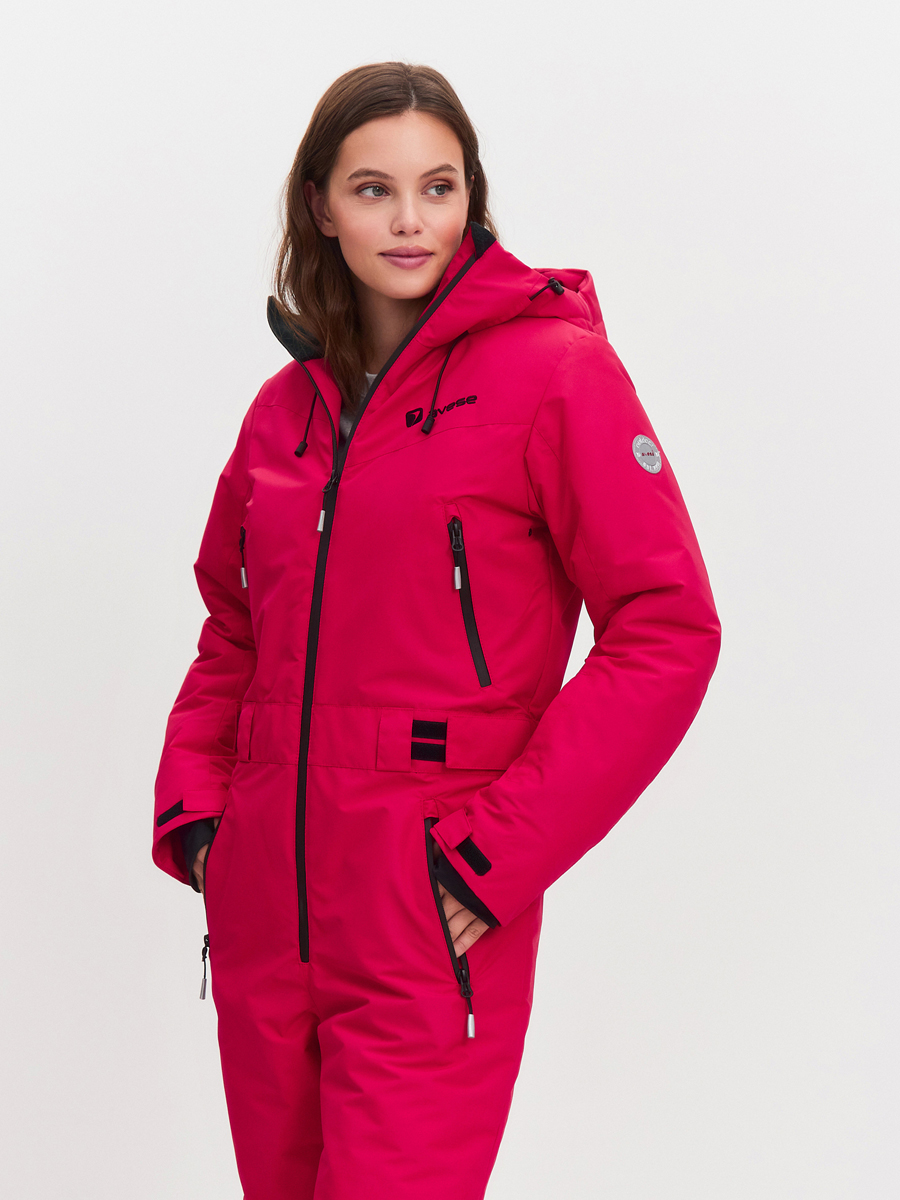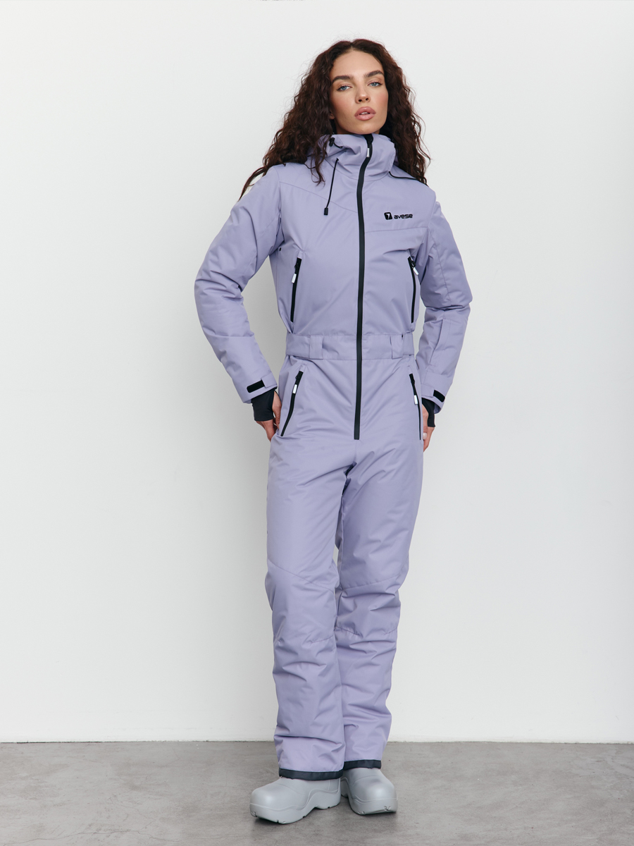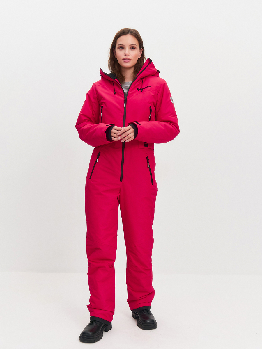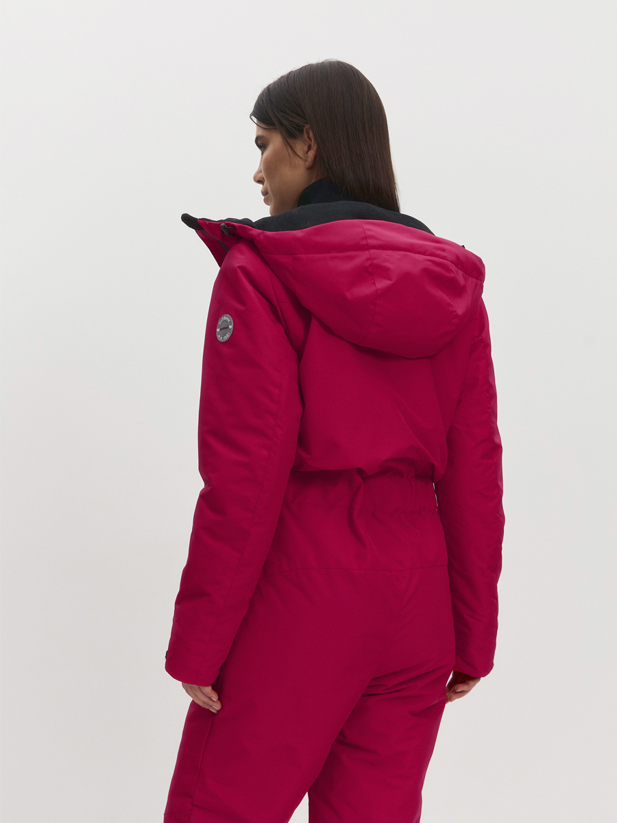 Женский зимний комбинезон из мембранной ткани с отрезным поясом по талии, пояс регулируется патами на липучке. Центральная застежка на молнию с влагозащитным покрытием. Втачной капюшон с кулисами по лицевой и затылочной части. 4 кармана на молниях с влагозащитной обработкой. 1 карман на рукаве с молнией. Низ рукава с патами на липучке и с внутренним манжетом, манжет с отверстием для большого пальца. Низ брюк с усилением и с внутренней снегозащитной муфтой. Комбинированная подкладка из флиса и шелка с внутренним карманом. Внутри комбинезона помочи из резинки для удобства ношения. На комбинезоне расположены светоотражающие элементы. Рассчитана на температуру от 0 до -20.