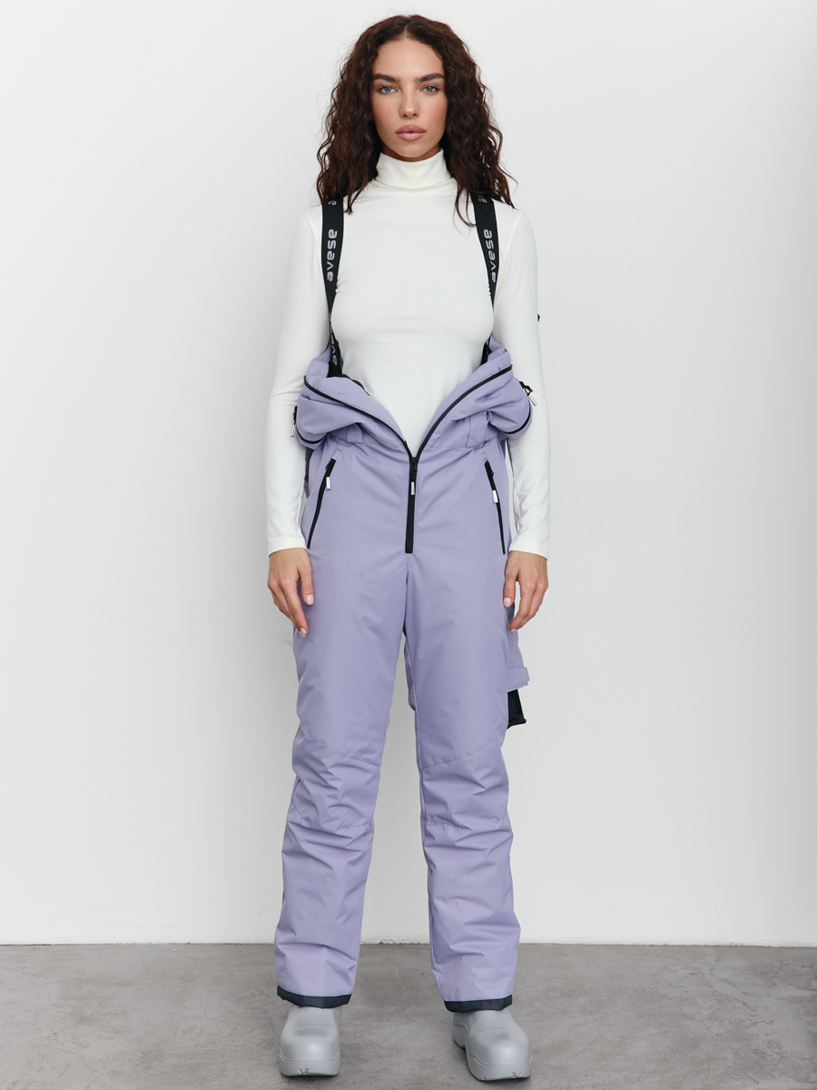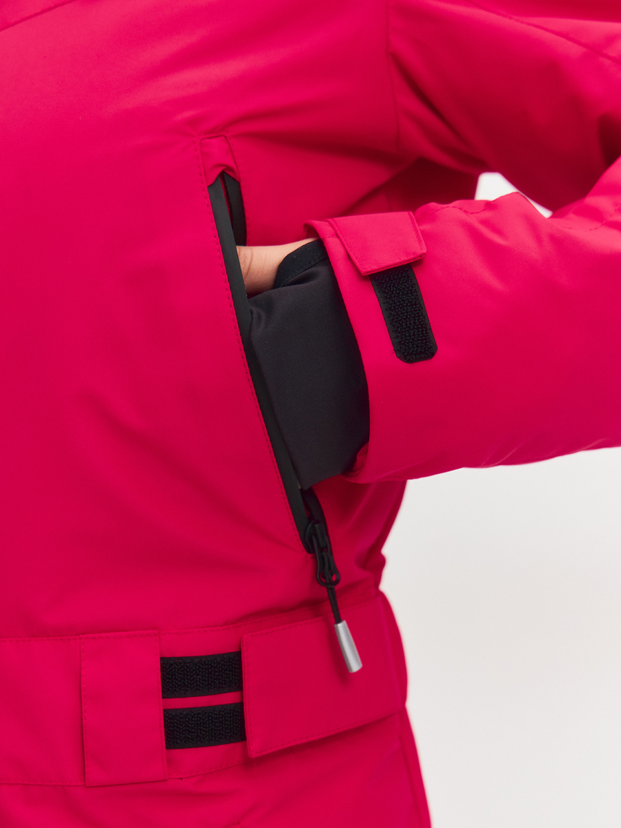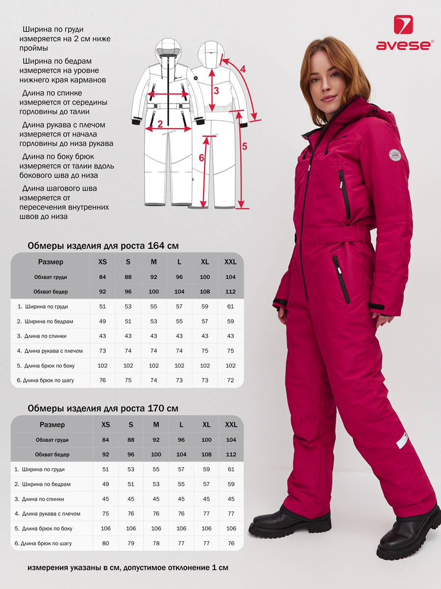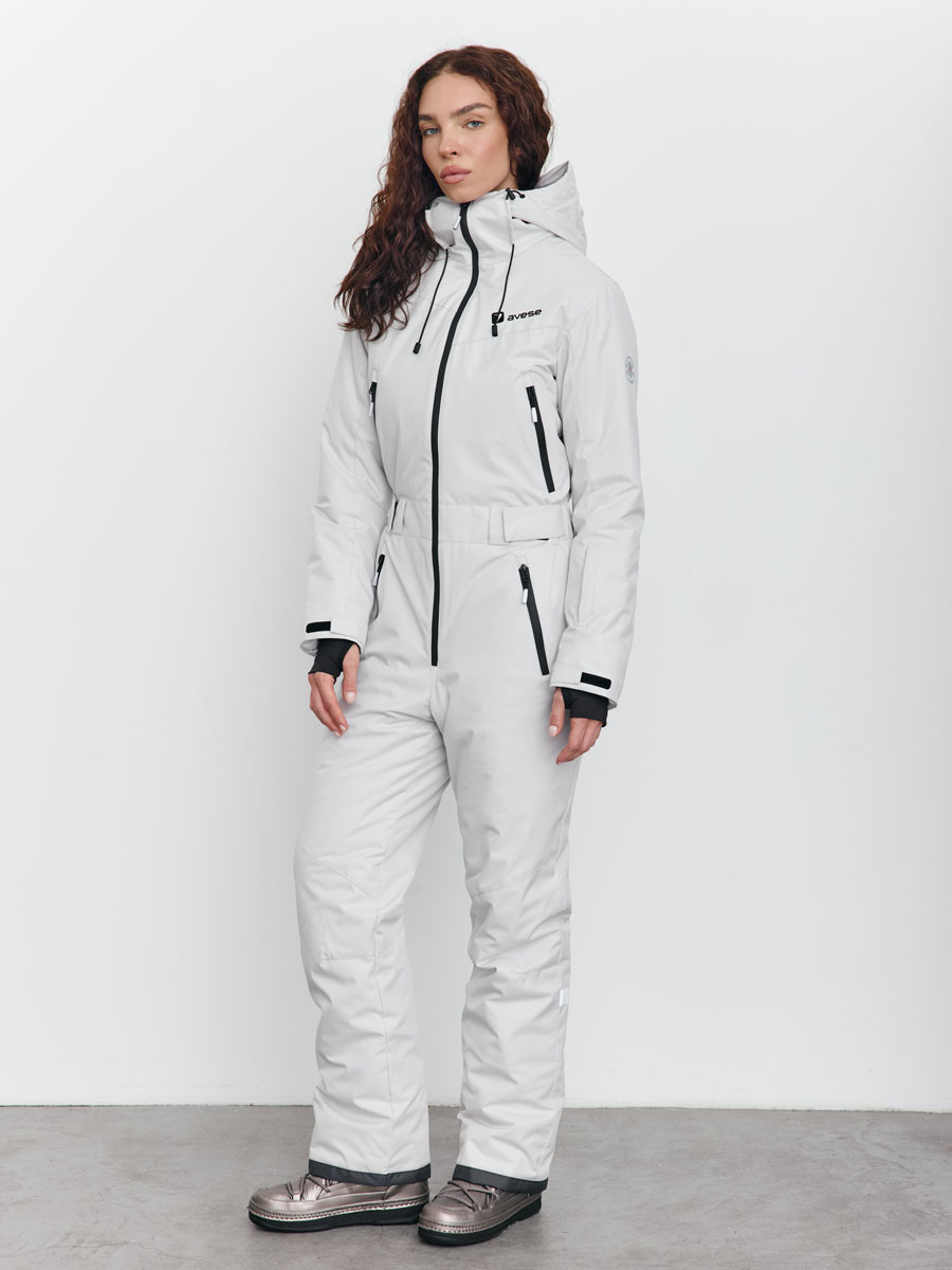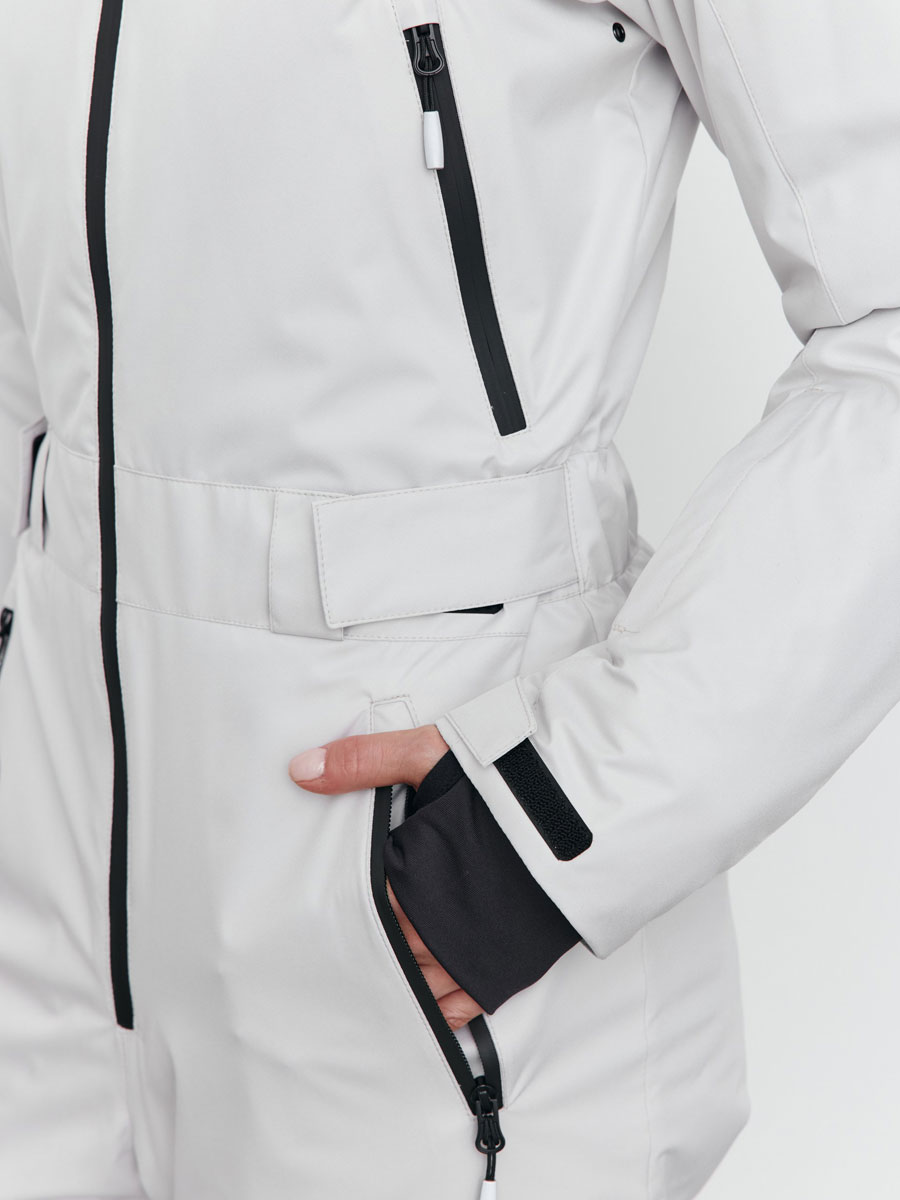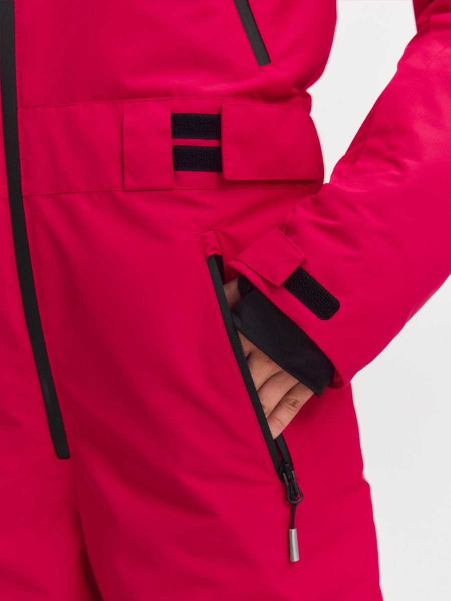 Женский зимний комбинезон из мембранной ткани с отрезным поясом по талии, пояс регулируется патами на липучке. Центральная застежка на молнию с влагозащитным покрытием. Втачной капюшон с кулисами по лицевой и затылочной части. 4 кармана на молниях с влагозащитной обработкой. 1 карман на рукаве с молнией. Низ рукава с патами на липучке и с внутренним манжетом, манжет с отверстием для большого пальца. Низ брюк с усилением и с внутренней снегозащитной муфтой. Комбинированная подкладка из флиса и шелка с внутренним карманом. Внутри комбинезона помочи из резинки для удобства ношения. На комбинезоне расположены светоотражающие элементы. Рассчитана на температуру от 0 до -20.