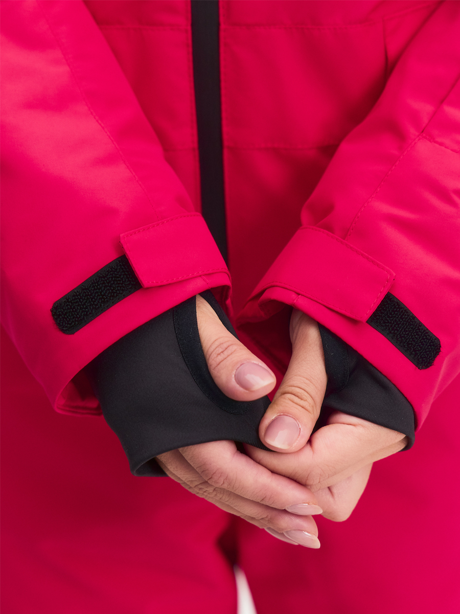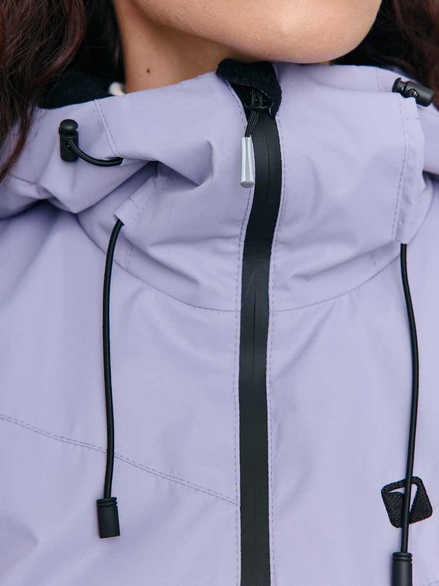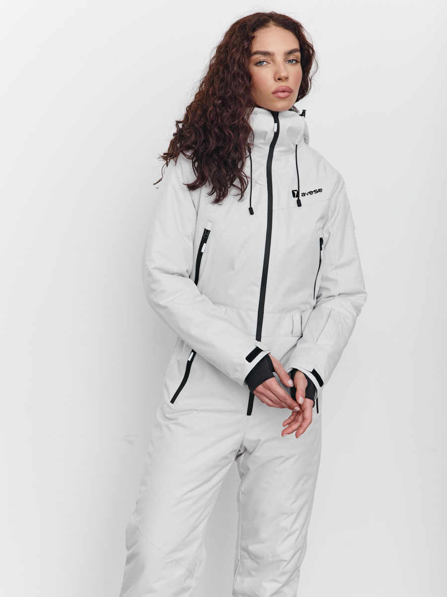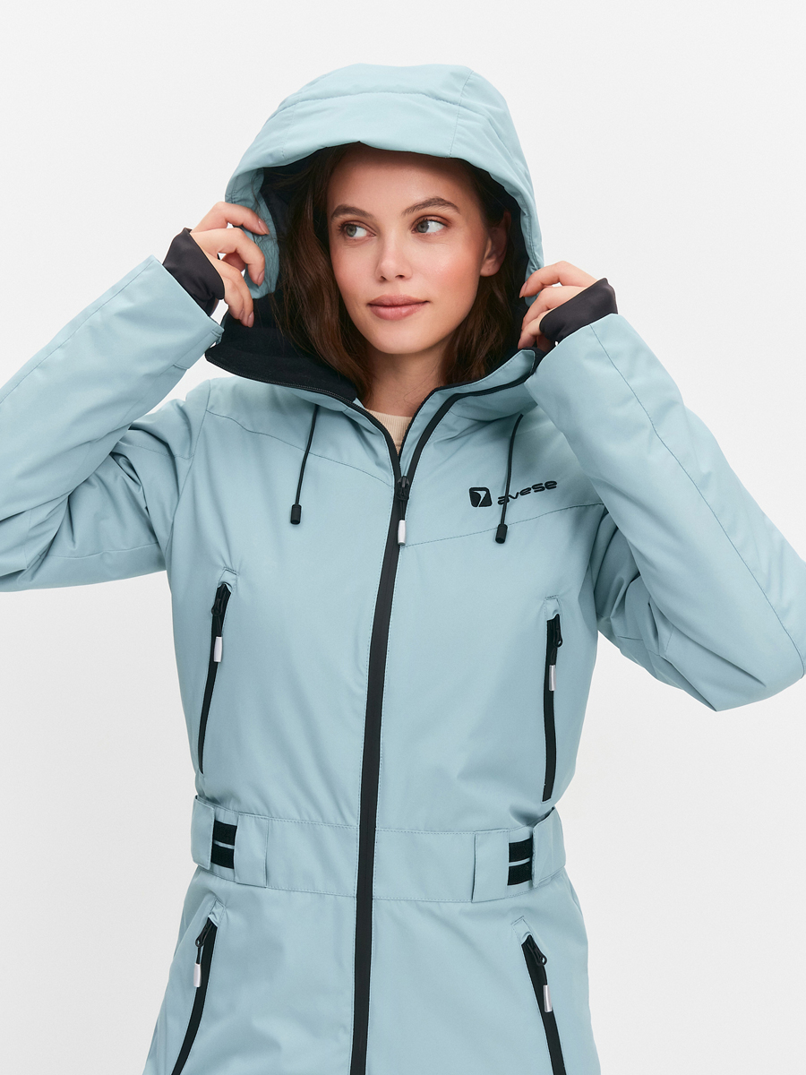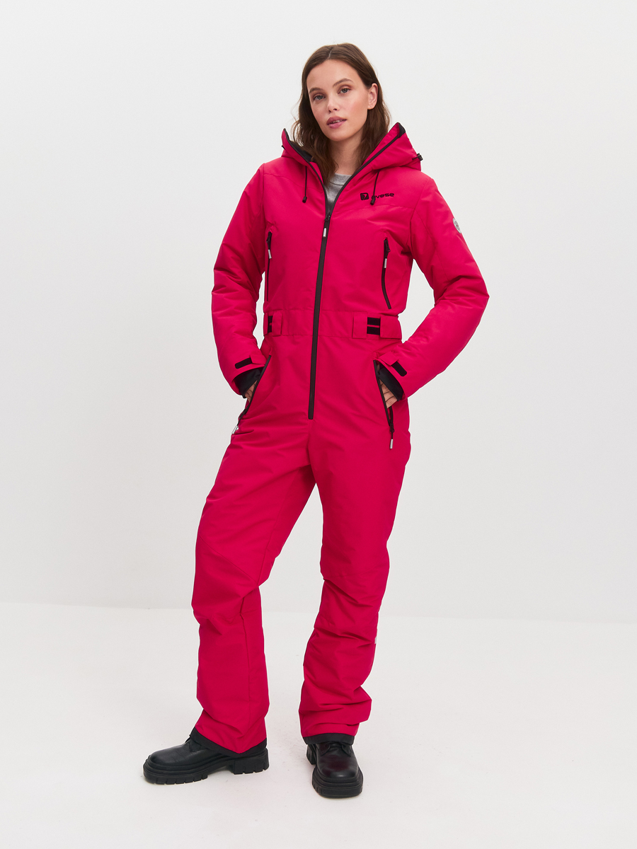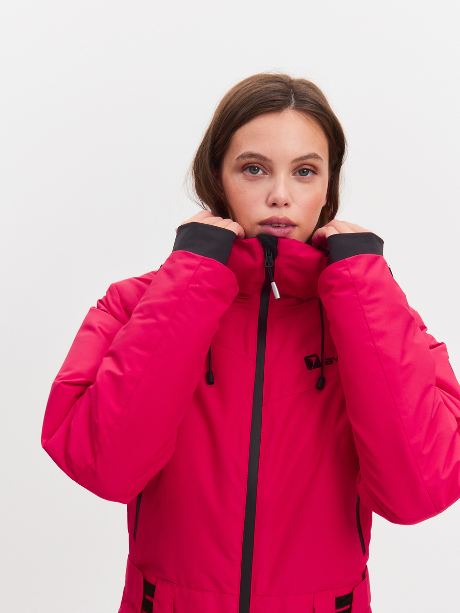 Женский зимний комбинезон из мембранной ткани с отрезным поясом по талии, пояс регулируется патами на липучке. Центральная застежка на молнию с влагозащитным покрытием. Втачной капюшон с кулисами по лицевой и затылочной части. 4 кармана на молниях с влагозащитной обработкой. 1 карман на рукаве с молнией. Низ рукава с патами на липучке и с внутренним манжетом, манжет с отверстием для большого пальца. Низ брюк с усилением и с внутренней снегозащитной муфтой. Комбинированная подкладка из флиса и шелка с внутренним карманом. Внутри комбинезона помочи из резинки для удобства ношения. На комбинезоне расположены светоотражающие элементы. Рассчитана на температуру от 0 до -20.
