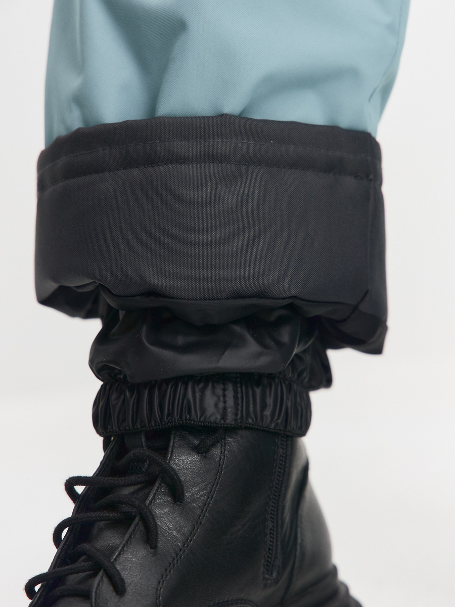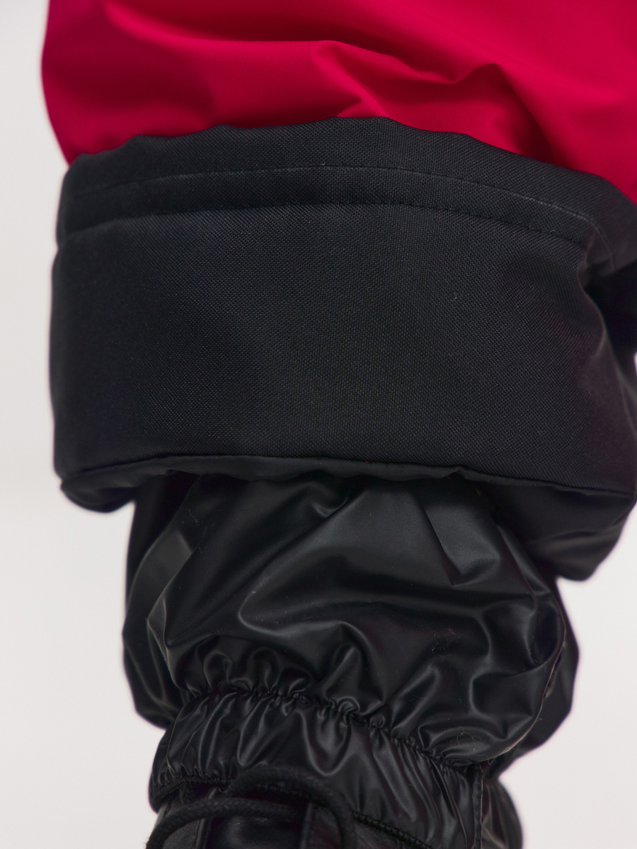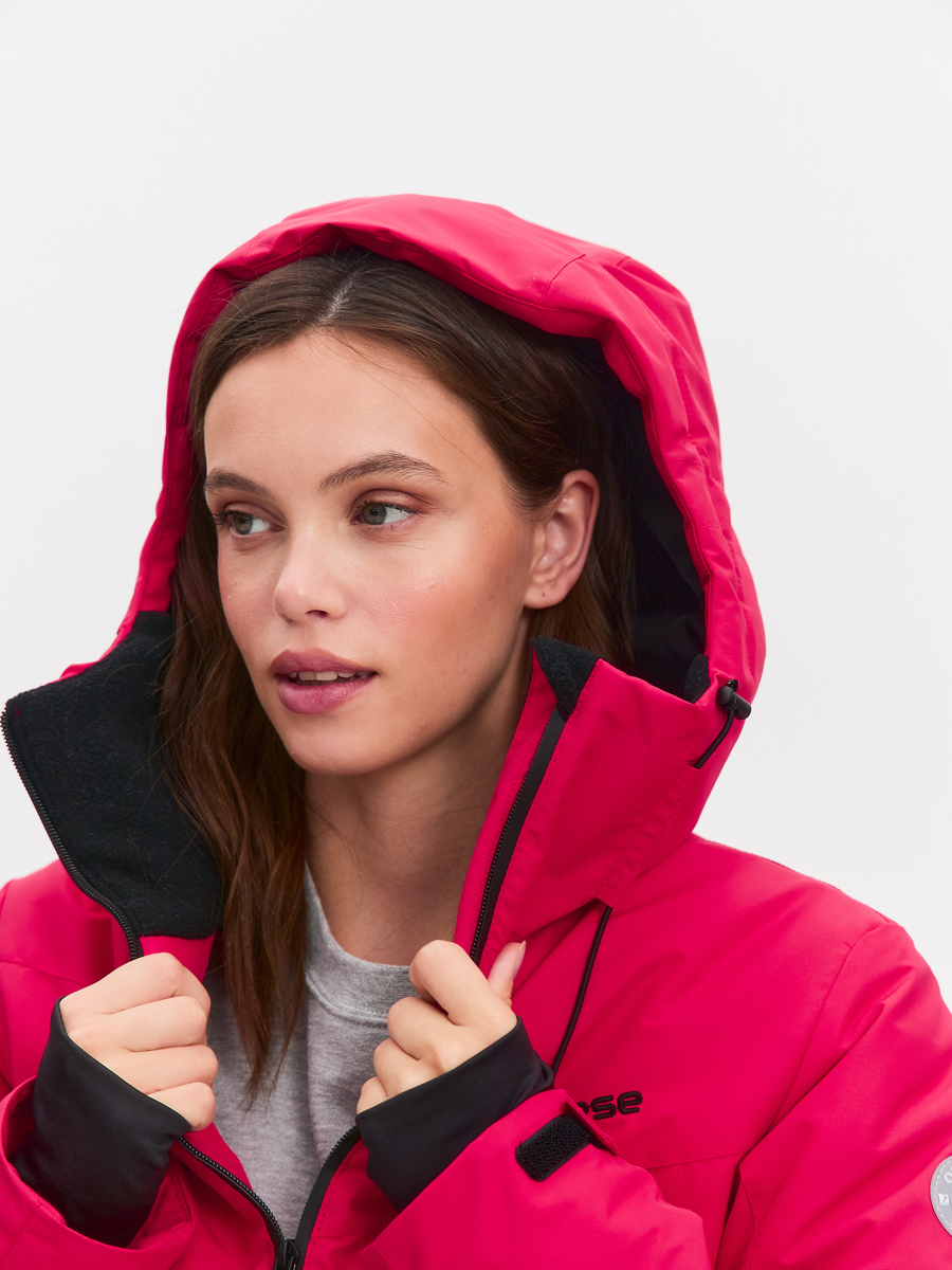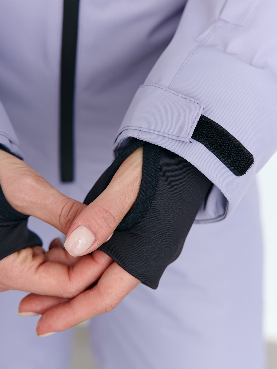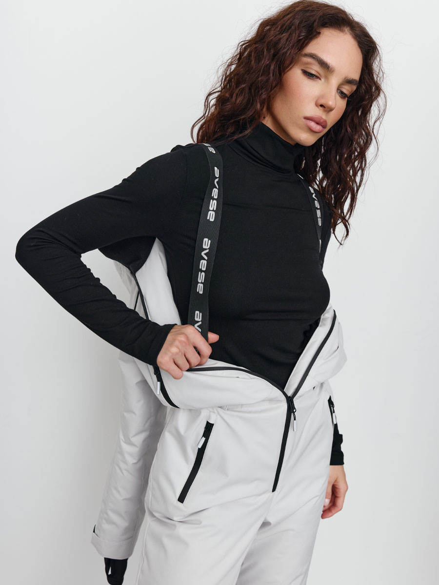 Женский зимний комбинезон из мембранной ткани с отрезным поясом по талии, пояс регулируется патами на липучке. Центральная застежка на молнию с влагозащитным покрытием. Втачной капюшон с кулисами по лицевой и затылочной части. 4 кармана на молниях с влагозащитной обработкой. 1 карман на рукаве с молнией. Низ рукава с патами на липучке и с внутренним манжетом, манжет с отверстием для большого пальца. Низ брюк с усилением и с внутренней снегозащитной муфтой. Комбинированная подкладка из флиса и шелка с внутренним карманом. Внутри комбинезона помочи из резинки для удобства ношения. На комбинезоне расположены светоотражающие элементы. Рассчитана на температуру от 0 до -20.