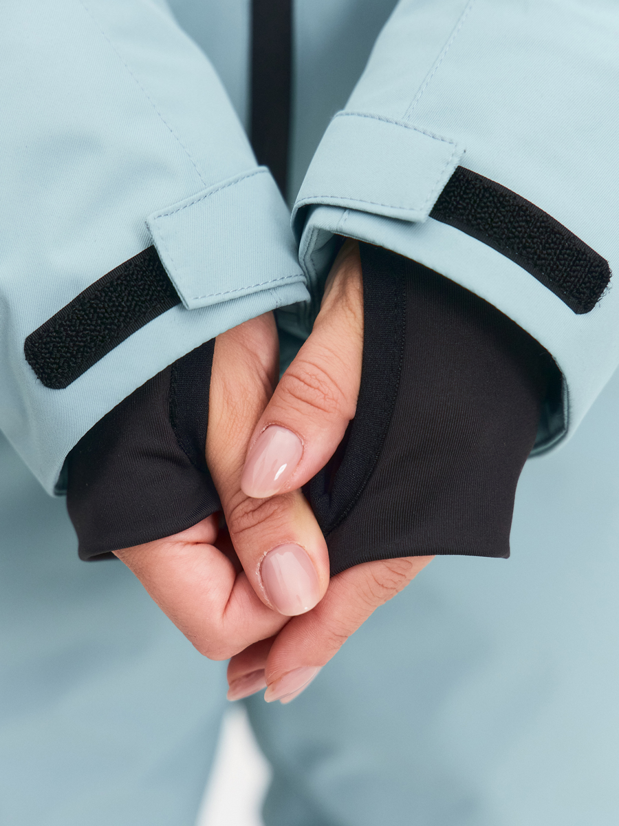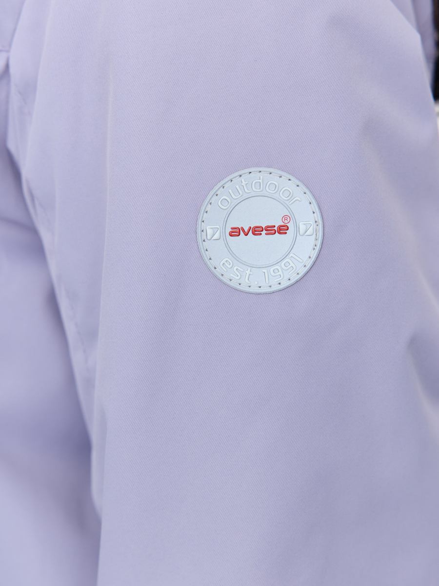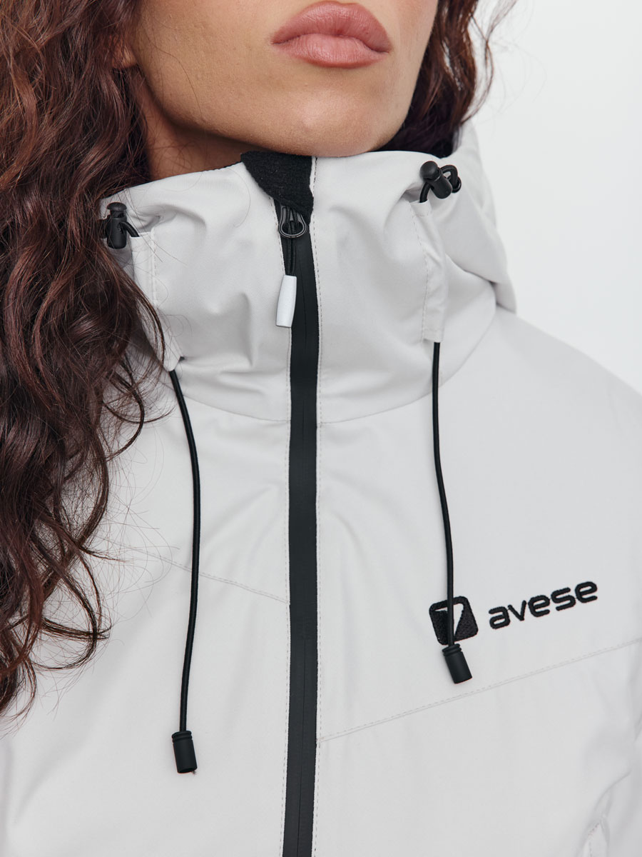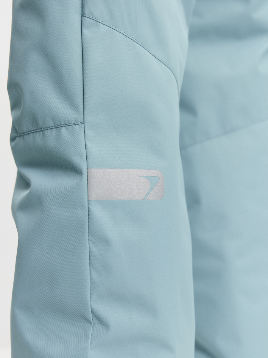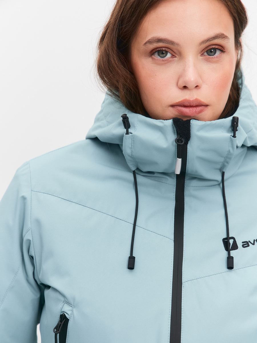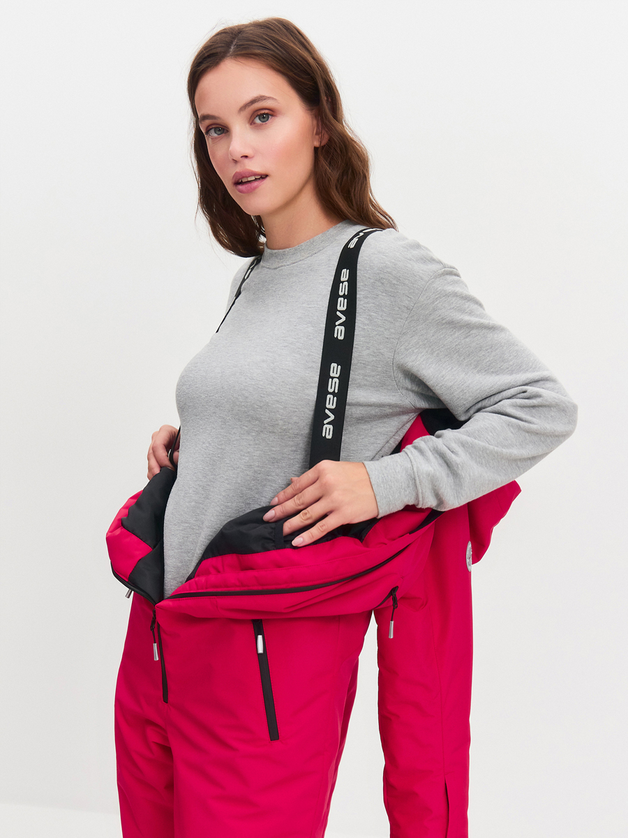 Женский зимний комбинезон из мембранной ткани с отрезным поясом по талии, пояс регулируется патами на липучке. Центральная застежка на молнию с влагозащитным покрытием. Втачной капюшон с кулисами по лицевой и затылочной части. 4 кармана на молниях с влагозащитной обработкой. 1 карман на рукаве с молнией. Низ рукава с патами на липучке и с внутренним манжетом, манжет с отверстием для большого пальца. Низ брюк с усилением и с внутренней снегозащитной муфтой. Комбинированная подкладка из флиса и шелка с внутренним карманом. Внутри комбинезона помочи из резинки для удобства ношения. На комбинезоне расположены светоотражающие элементы. Рассчитана на температуру от 0 до -20.